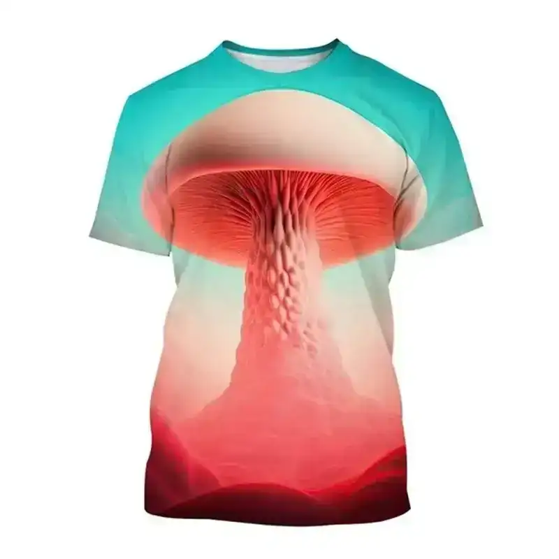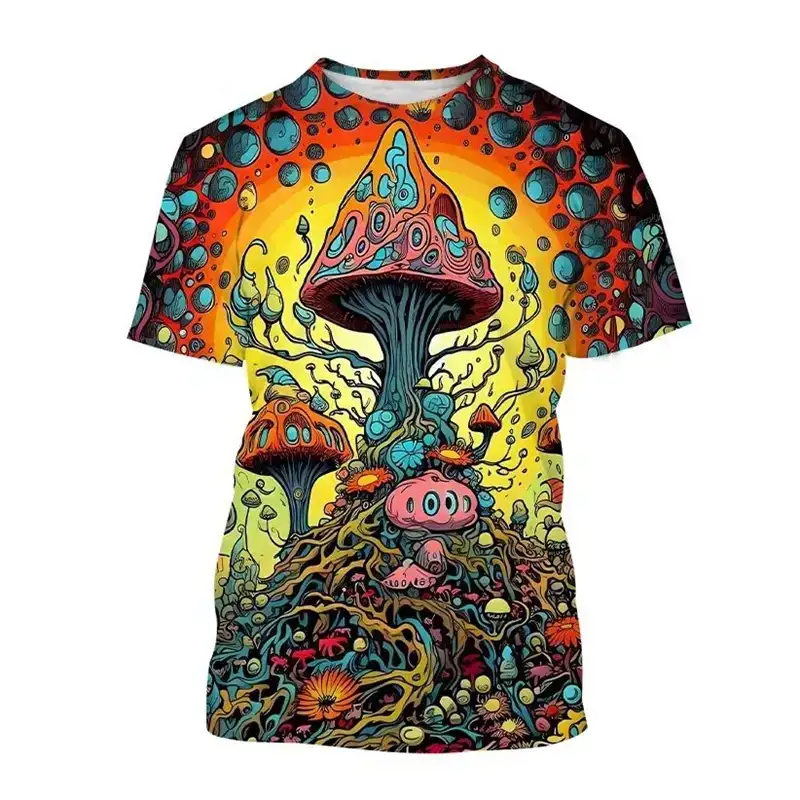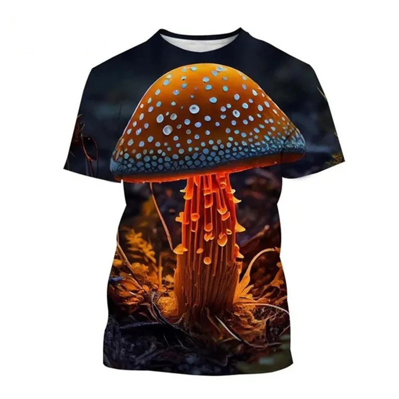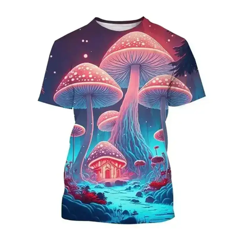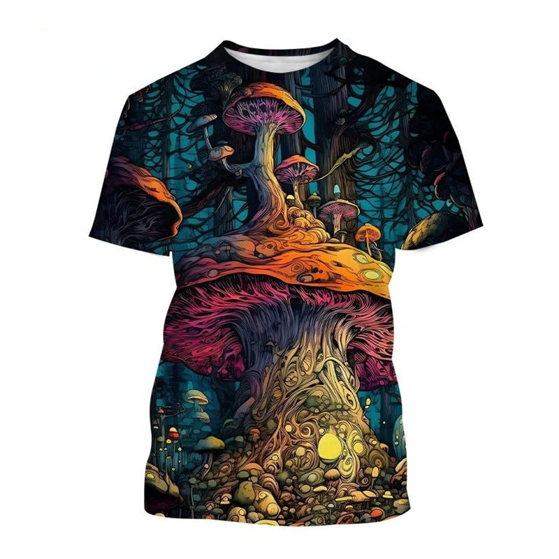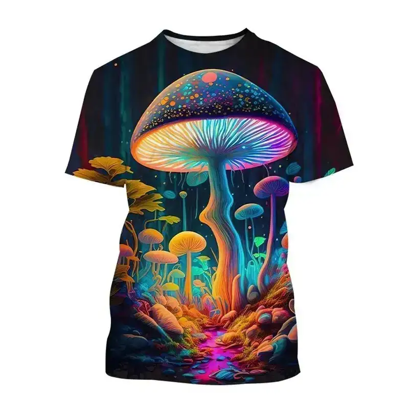 Bold plus size psychedelic mushroom 3D t-shirt with glowing neon fungi that explode under blacklight. Soft, breathable short-sleeve tee for men and women – perfect for psytrance festivals, raves, goa parties and trippy streetwear looks. All sizes, maximum comfort, pure psychedelic forest vibes.