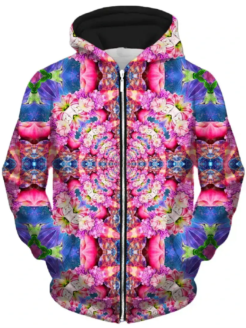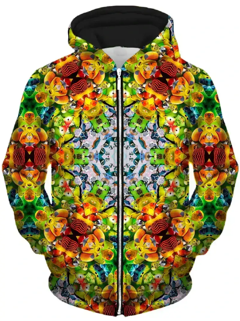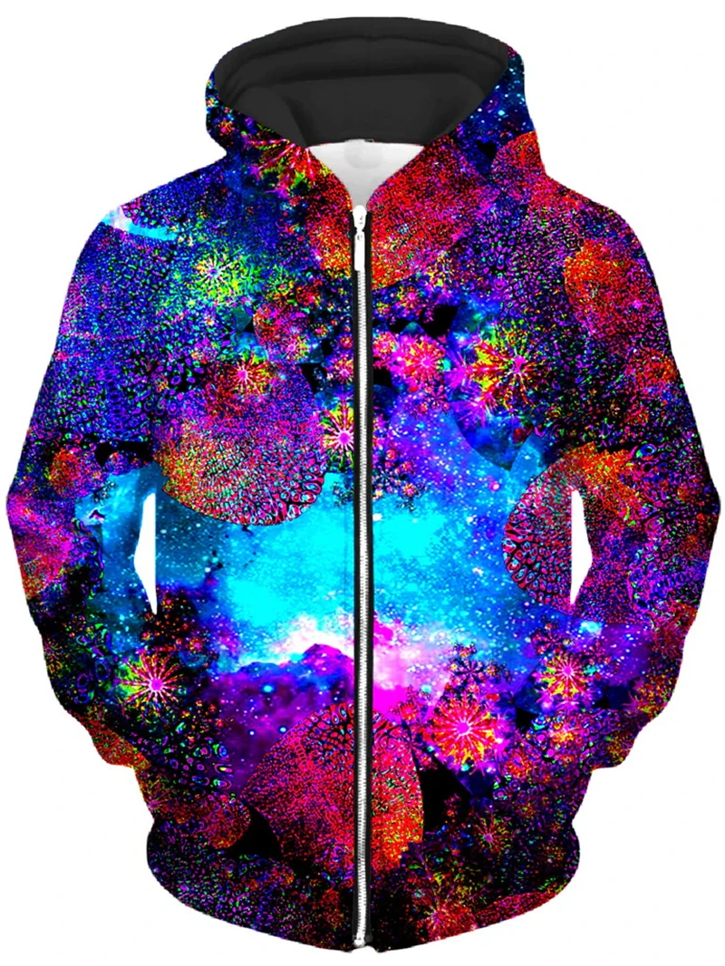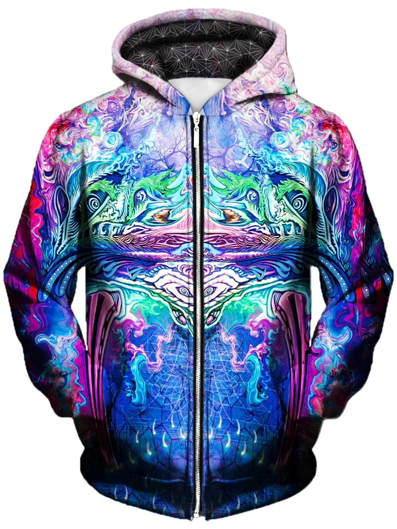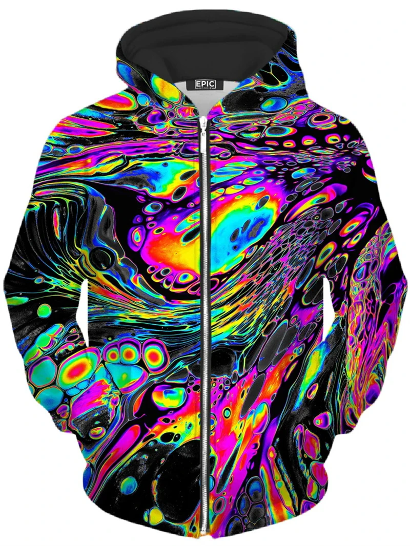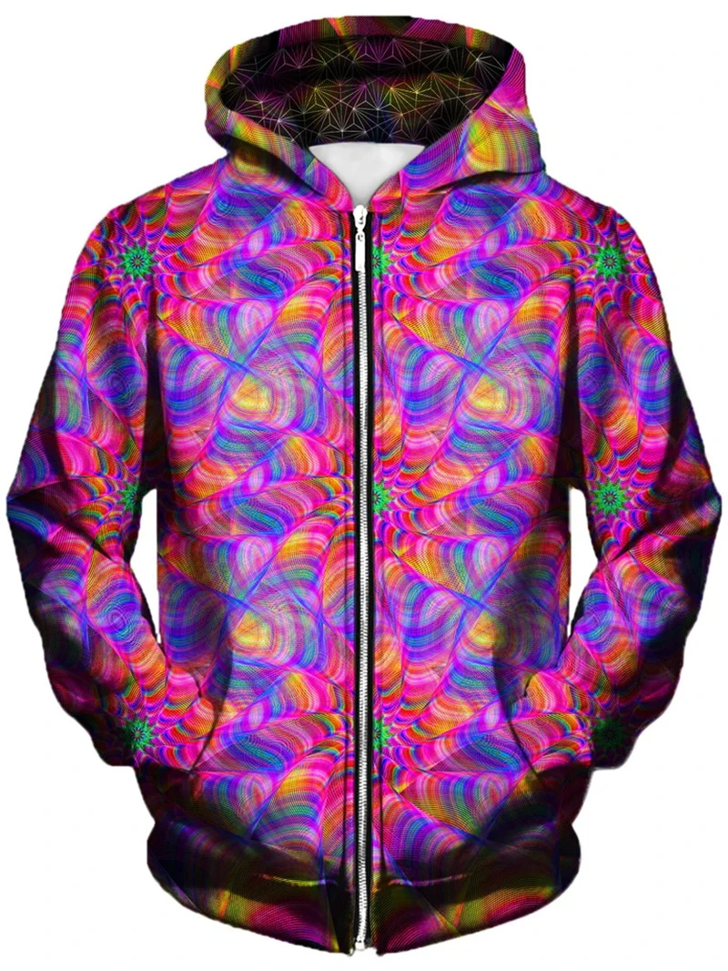 Mind-bending psychedelic 3D zip-up hoodie with glowing abstract patterns that explode under blacklight. Harajuku-style pullover for men, women & kids – perfect for psytrance festivals, rave nights, techno parties and trippy streetwear looks. Cozy, bold and ready to light up any dancefloor.