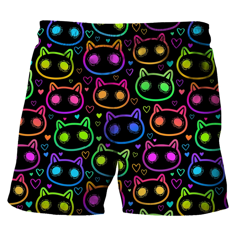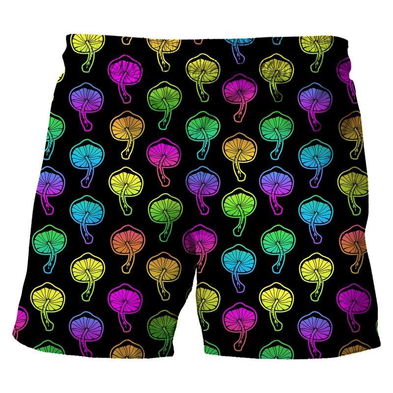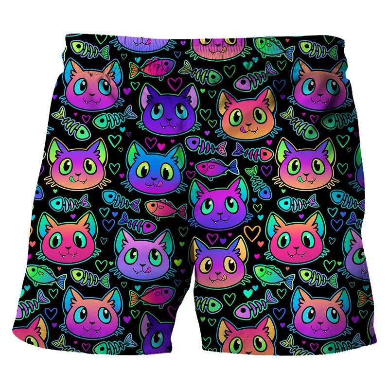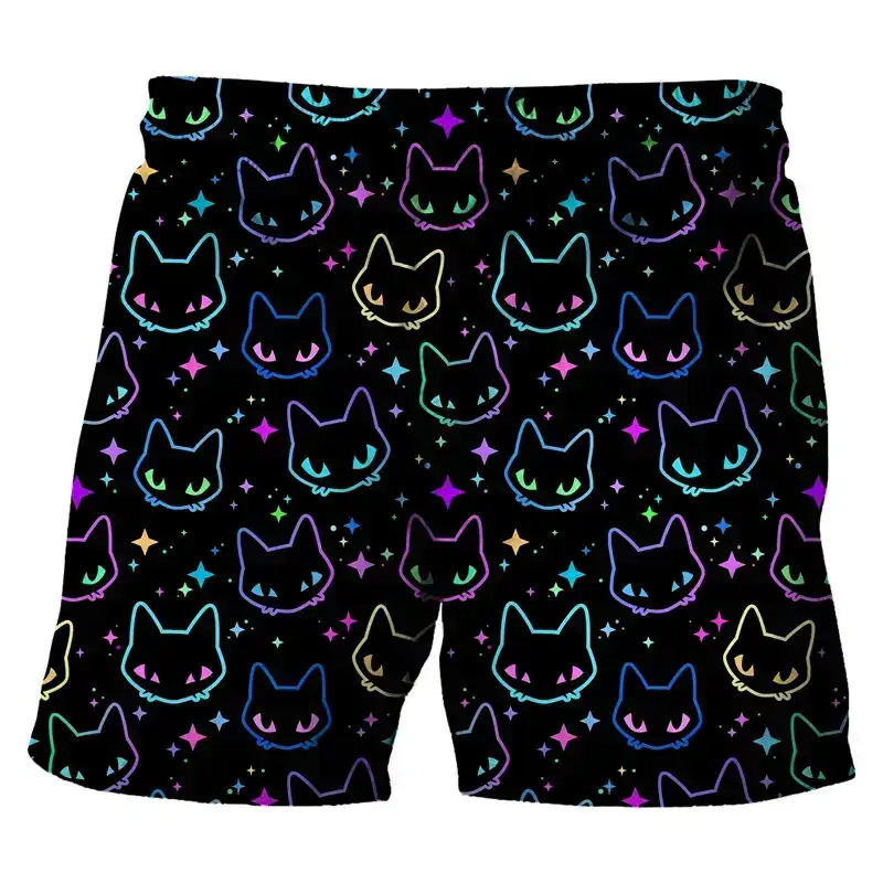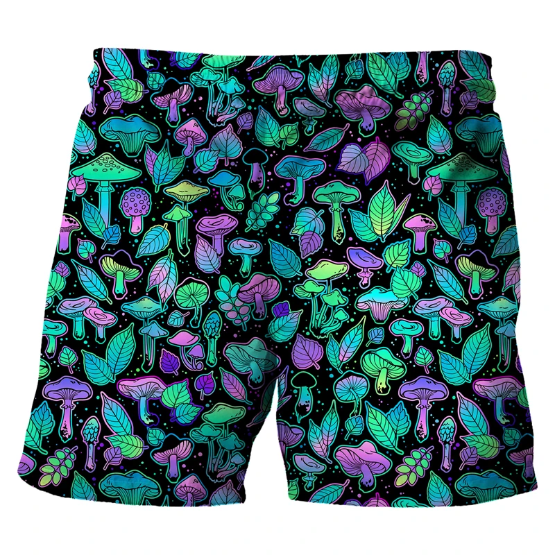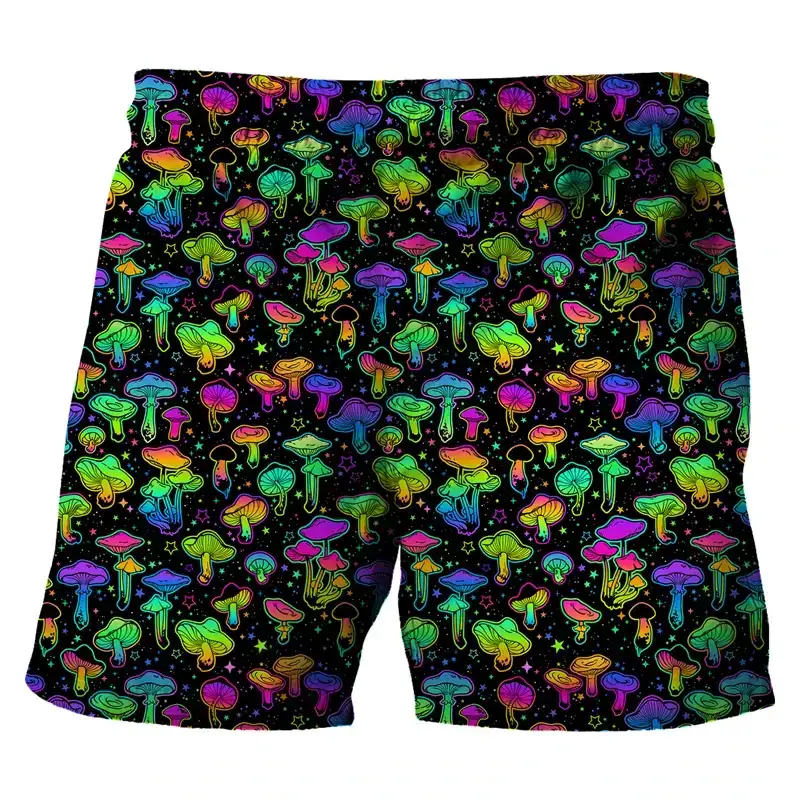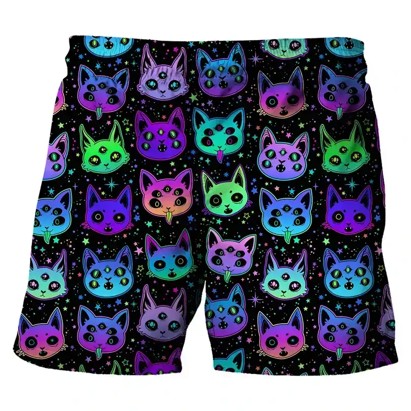Turn heads on the beach, at a psytrance festival, or in everyday summer streetwear with these Psychedelic Mushroom & Neon Cat Print Board Shorts for Men. Designed with vibrant Harajuku-inspired artwork, these shorts combine glowing neon colors, trippy mushroom graphics, and a bold cosmic cat pattern for a truly standout look.