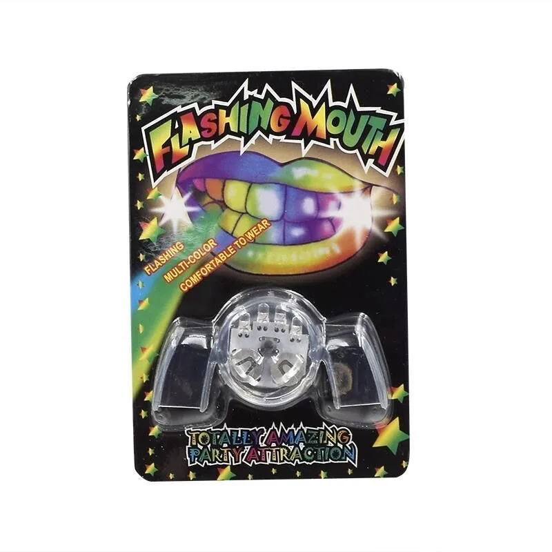 Hilarious flashing LED mouth guard that makes your teeth glow in crazy colors. The ultimate funny rave toy for kids and adults at psytrance parties, festivals, Halloween and nightclub antics. Soft silicone, instant glowing smile that steals the show every time you grin on the dancefloor.