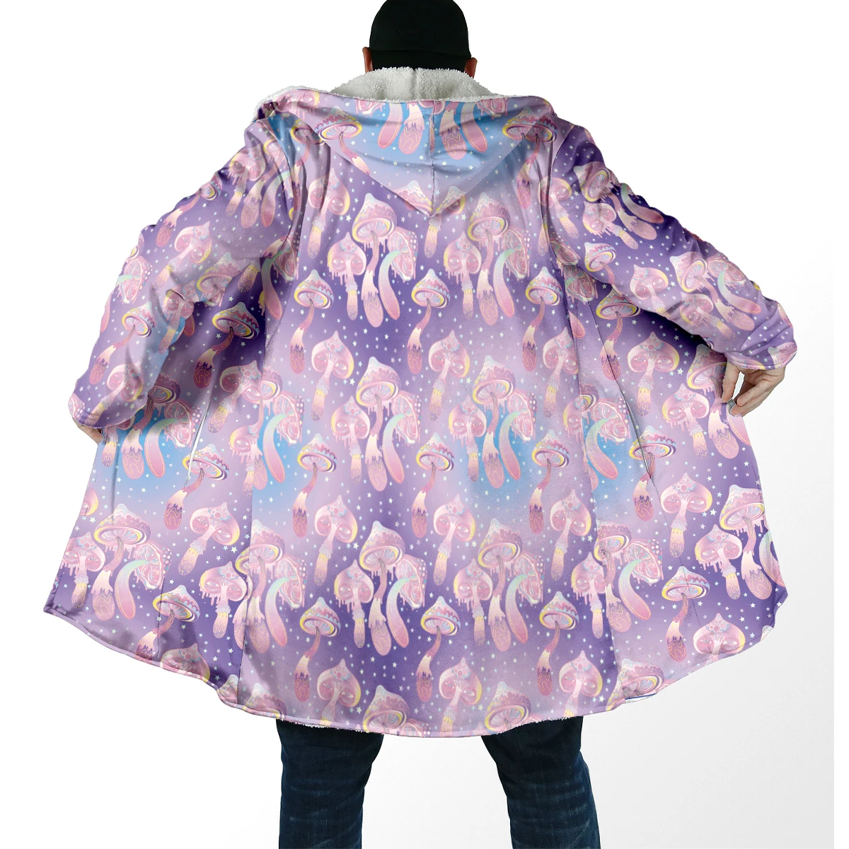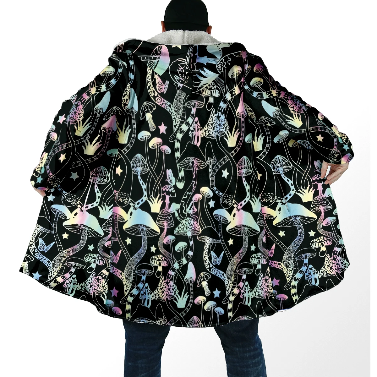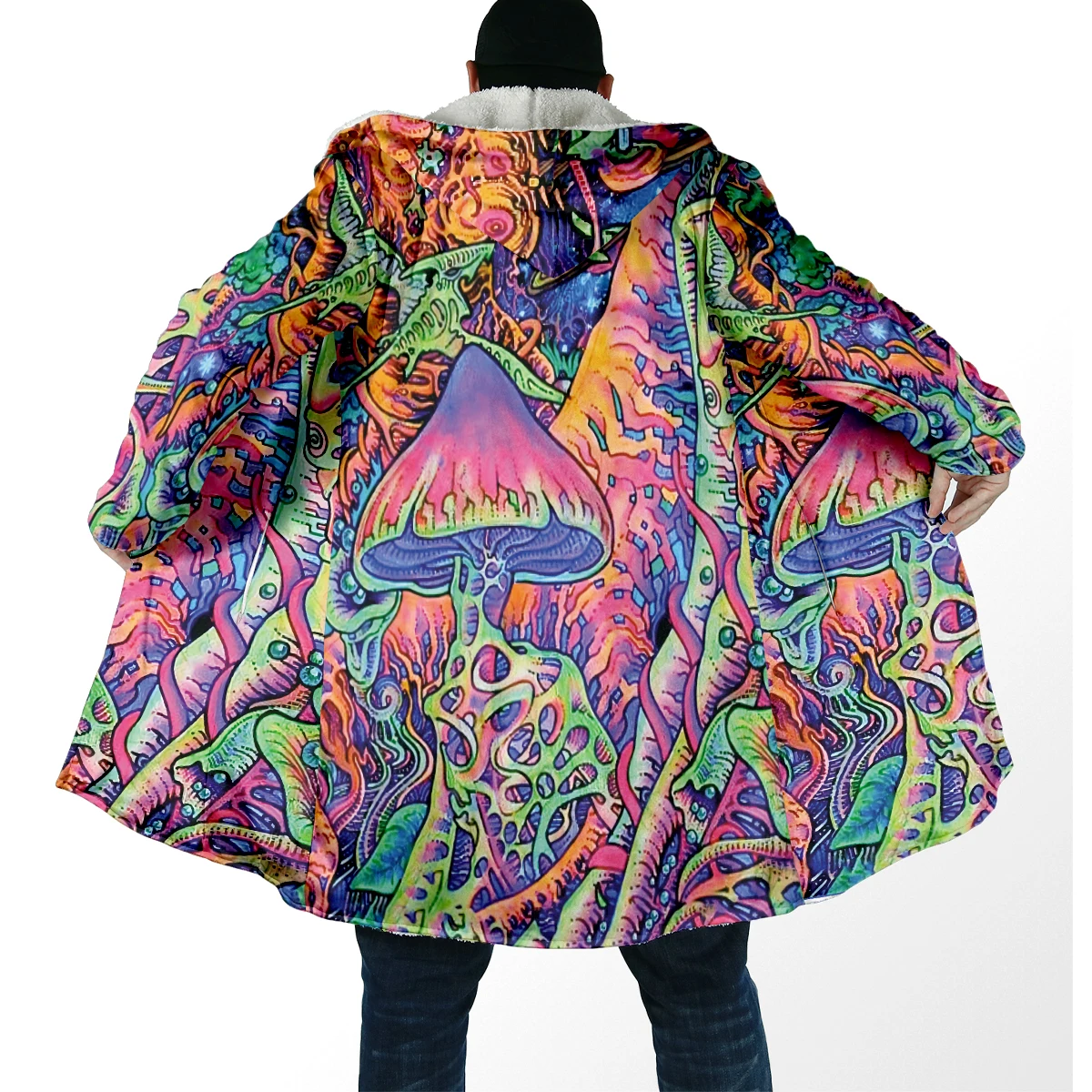Thick warm fleece hooded cloak covered in glowing psychedelic mushrooms and trippy 3D patterns that ignite under blacklight. Unisex winter cape perfect for psytrance festivals, outdoor raves, goa gatherings, and cold-night dancefloor journeys. Cozy, magical, and ready to wrap you in pure mushroom wizard energy.