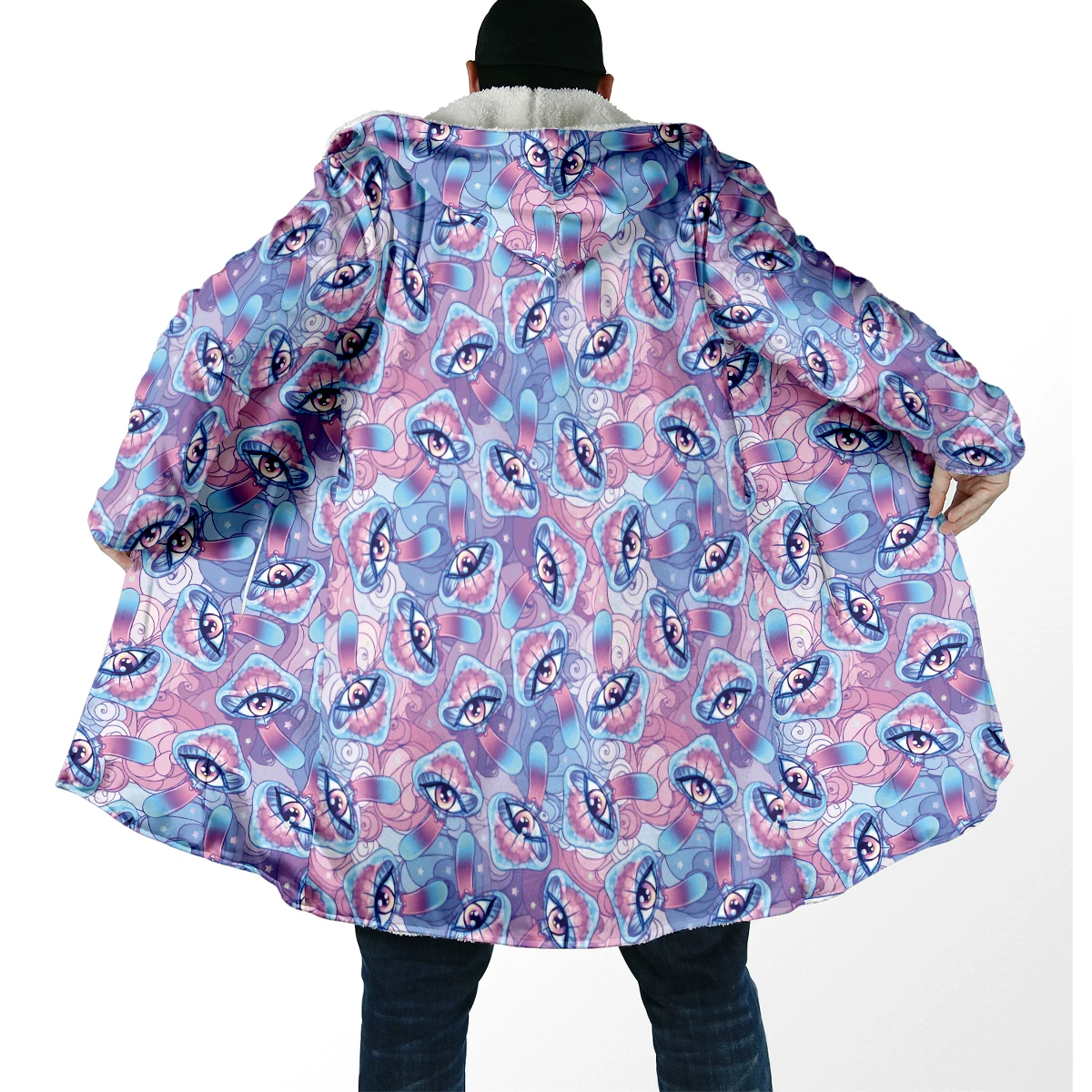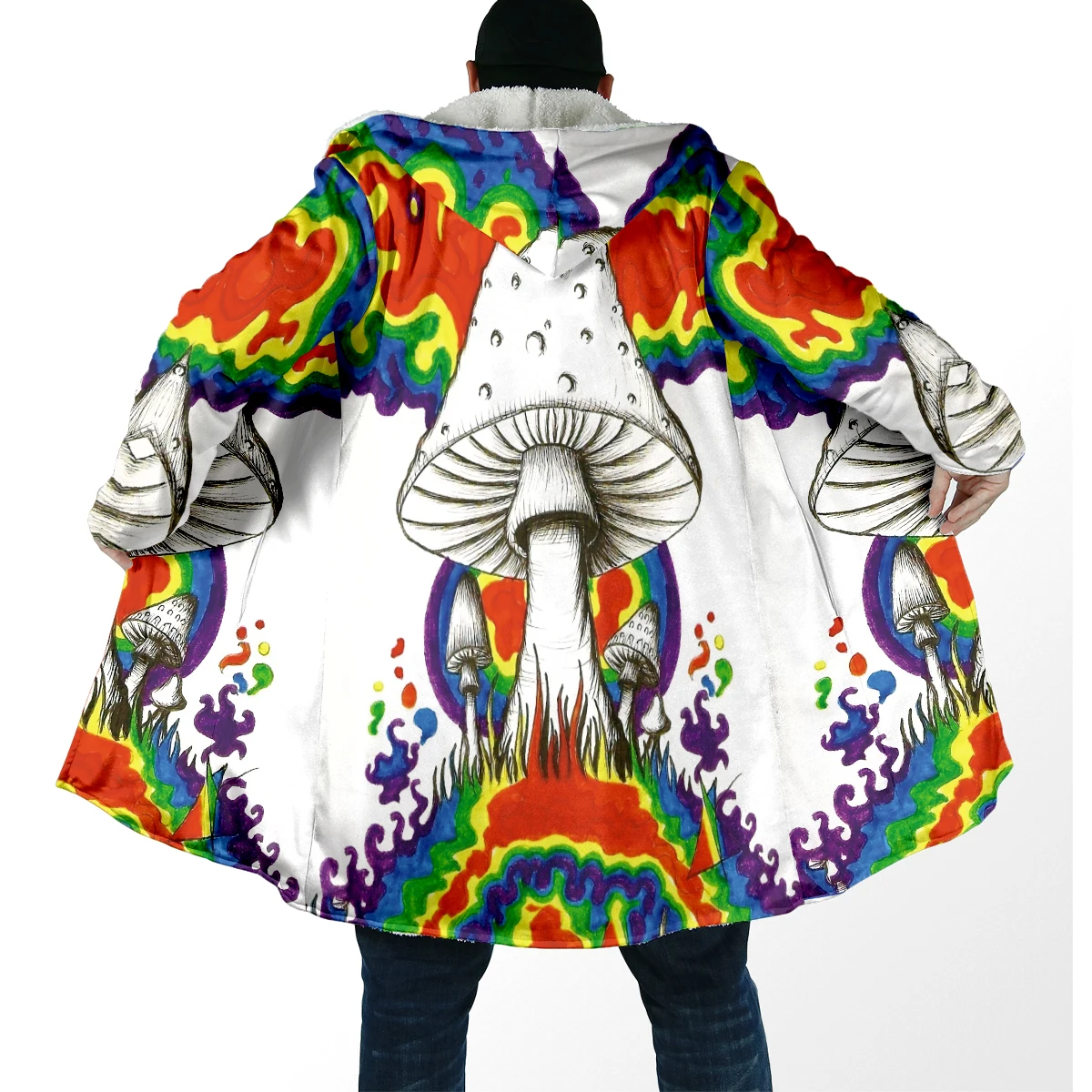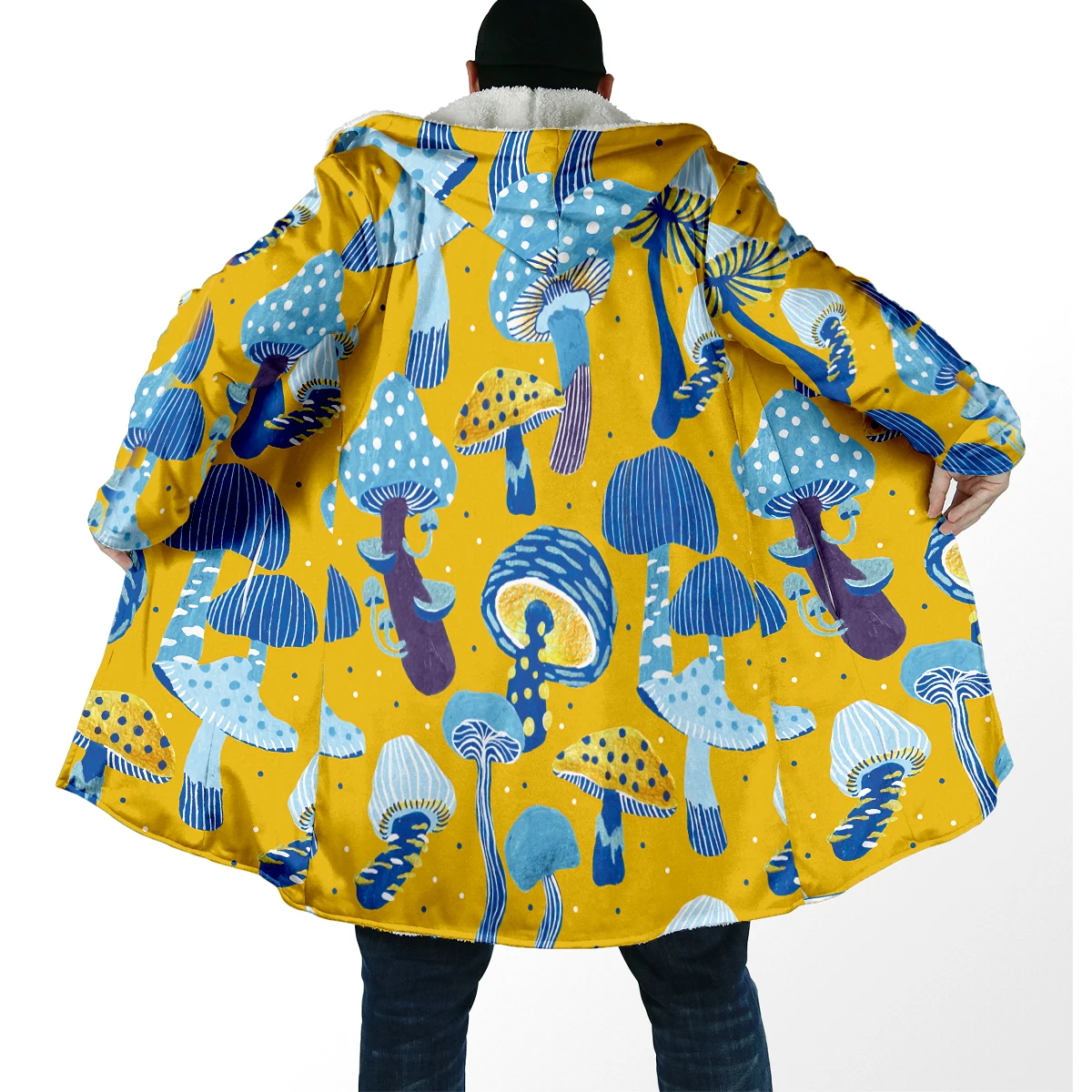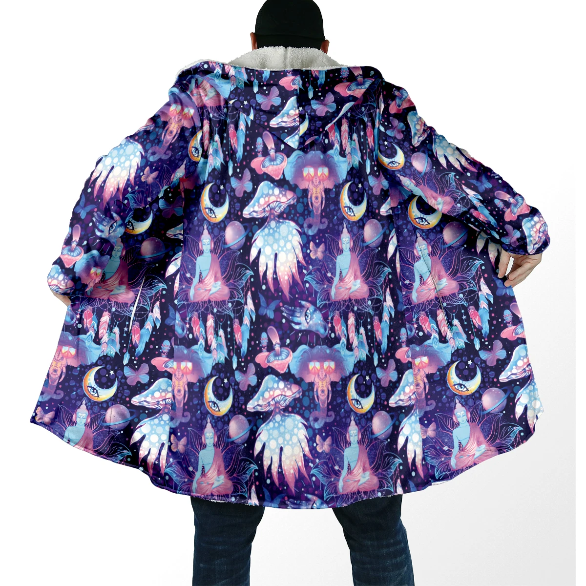 Thick warm fleece hooded cloak covered in glowing psychedelic mushrooms and trippy 3D patterns that ignite under blacklight. Unisex winter cape perfect for psytrance festivals, outdoor raves, goa gatherings, and cold-night dancefloor journeys. Cozy, magical, and ready to wrap you in pure mushroom wizard energy.