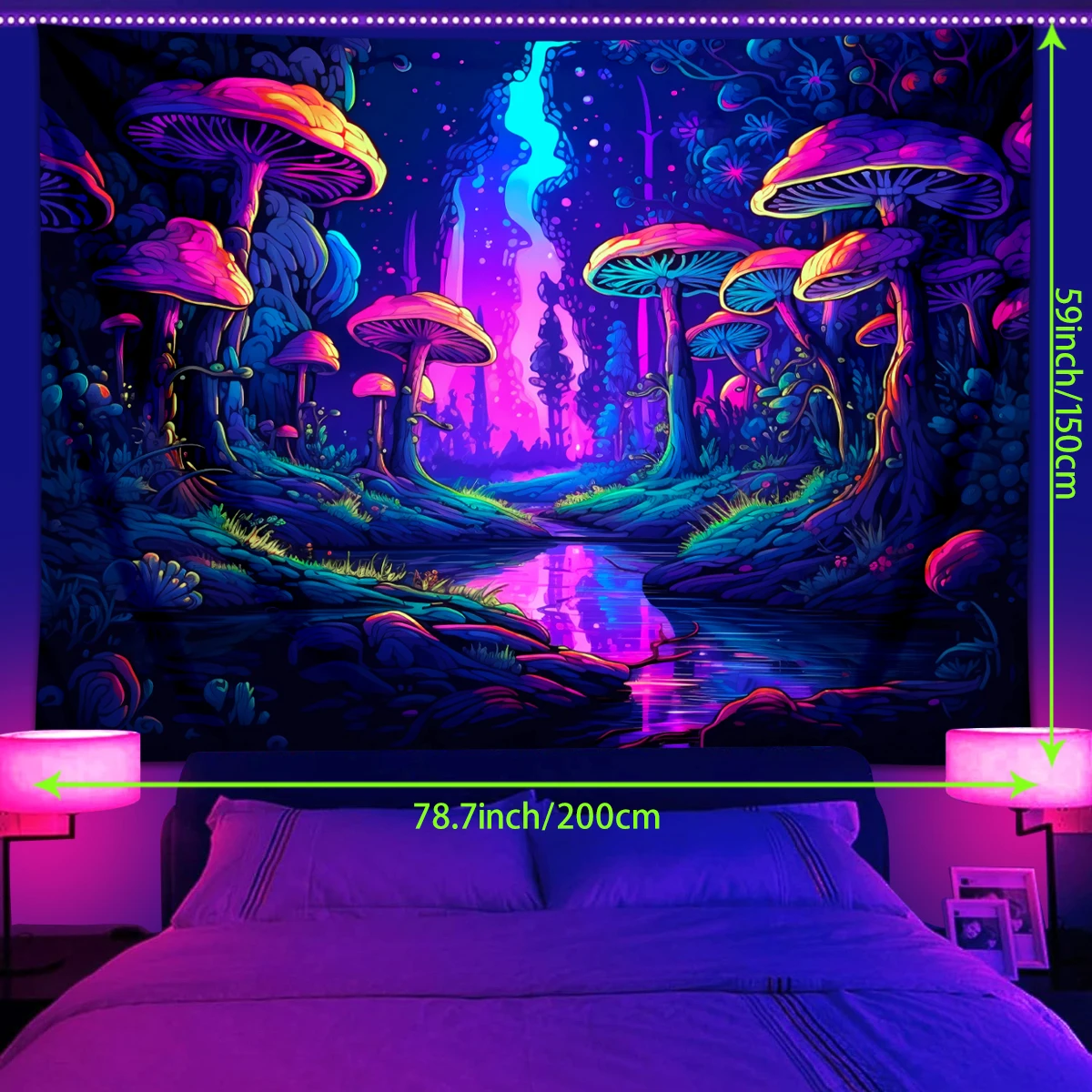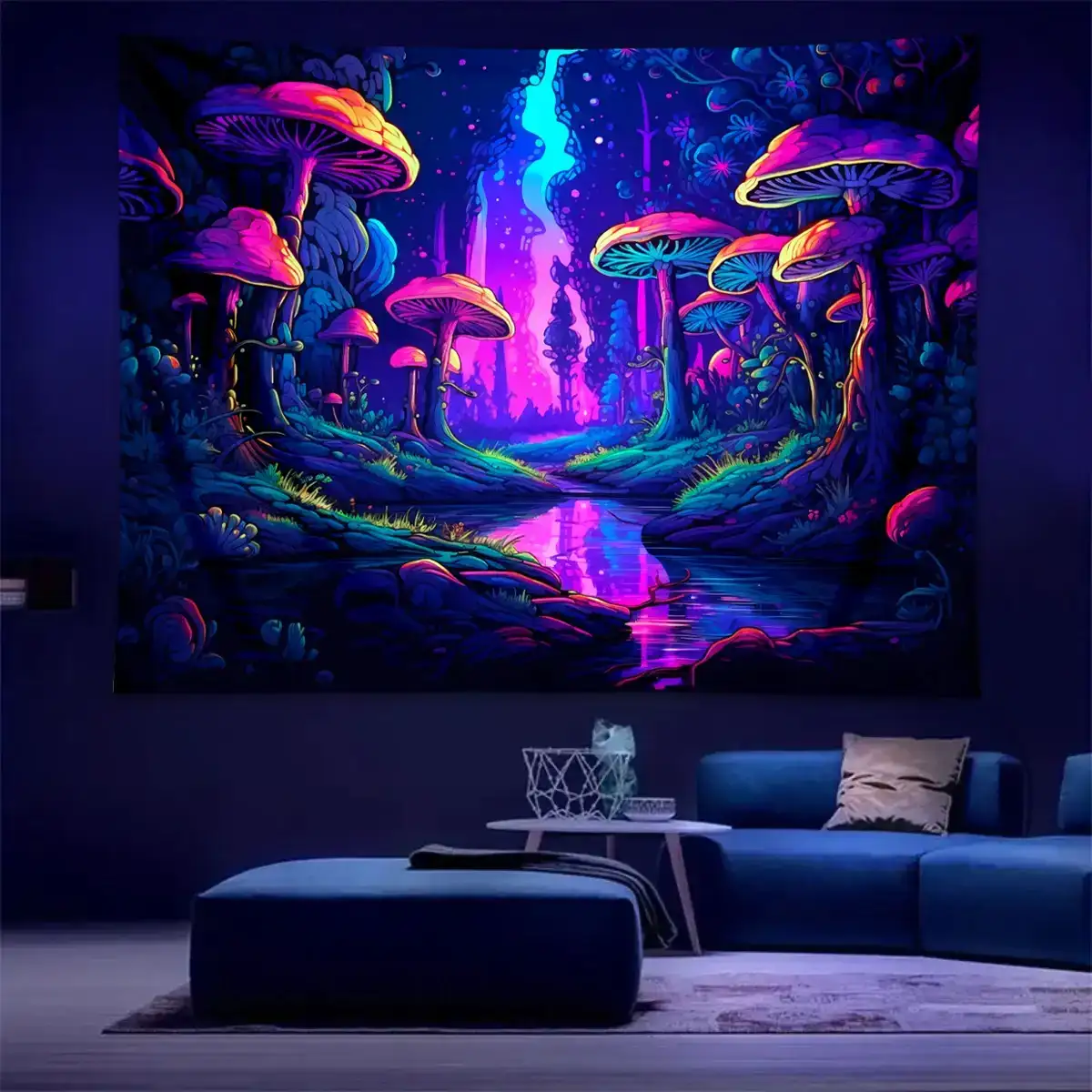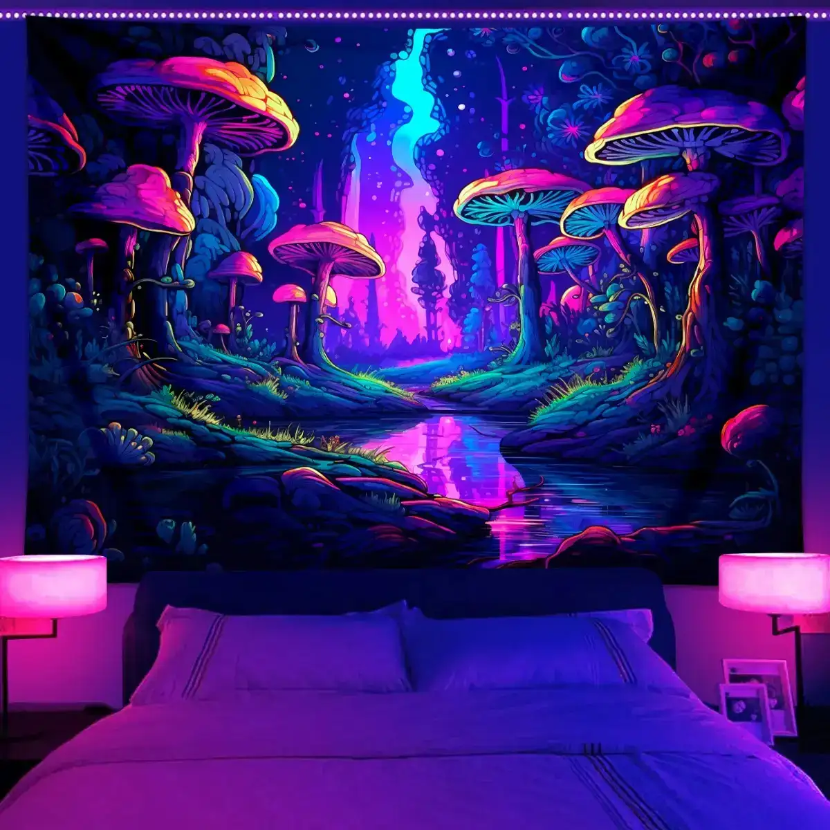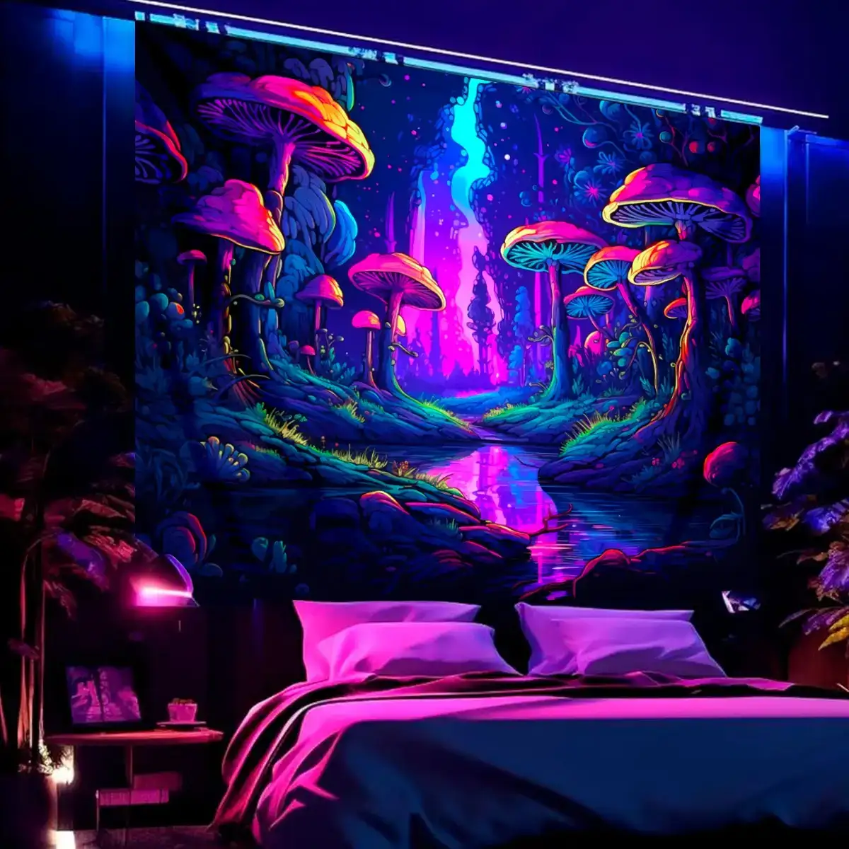Transform your space with this glowing UV-reactive mushroom forest tapestry. Vibrant neon fluorescent colors explode under blacklight – perfect for psytrance parties, rave rooms, chill corners, and festival decor. Trippy fantasy landscape with sacred mushrooms and psychedelic details that come alive at night. Large wall hanging for ultimate Goa and EDM vibes.