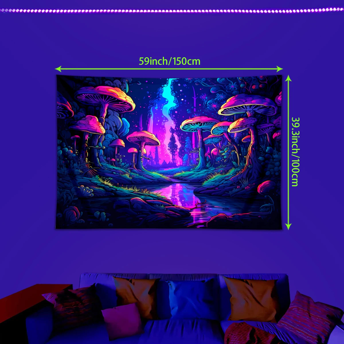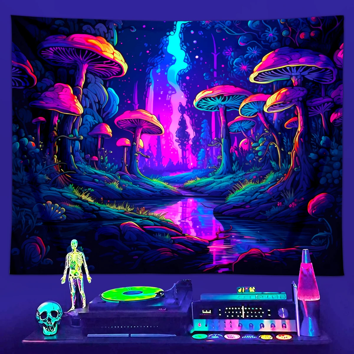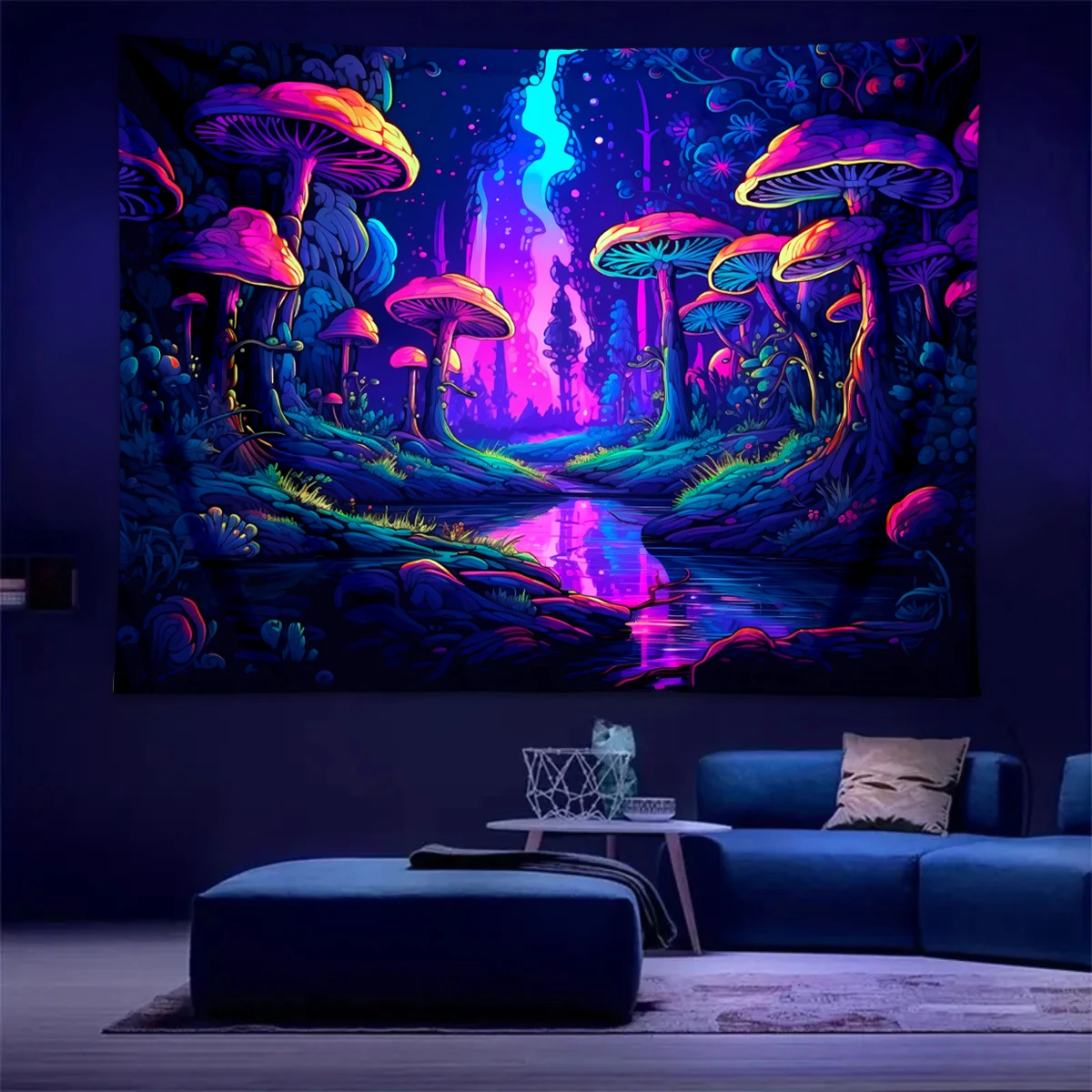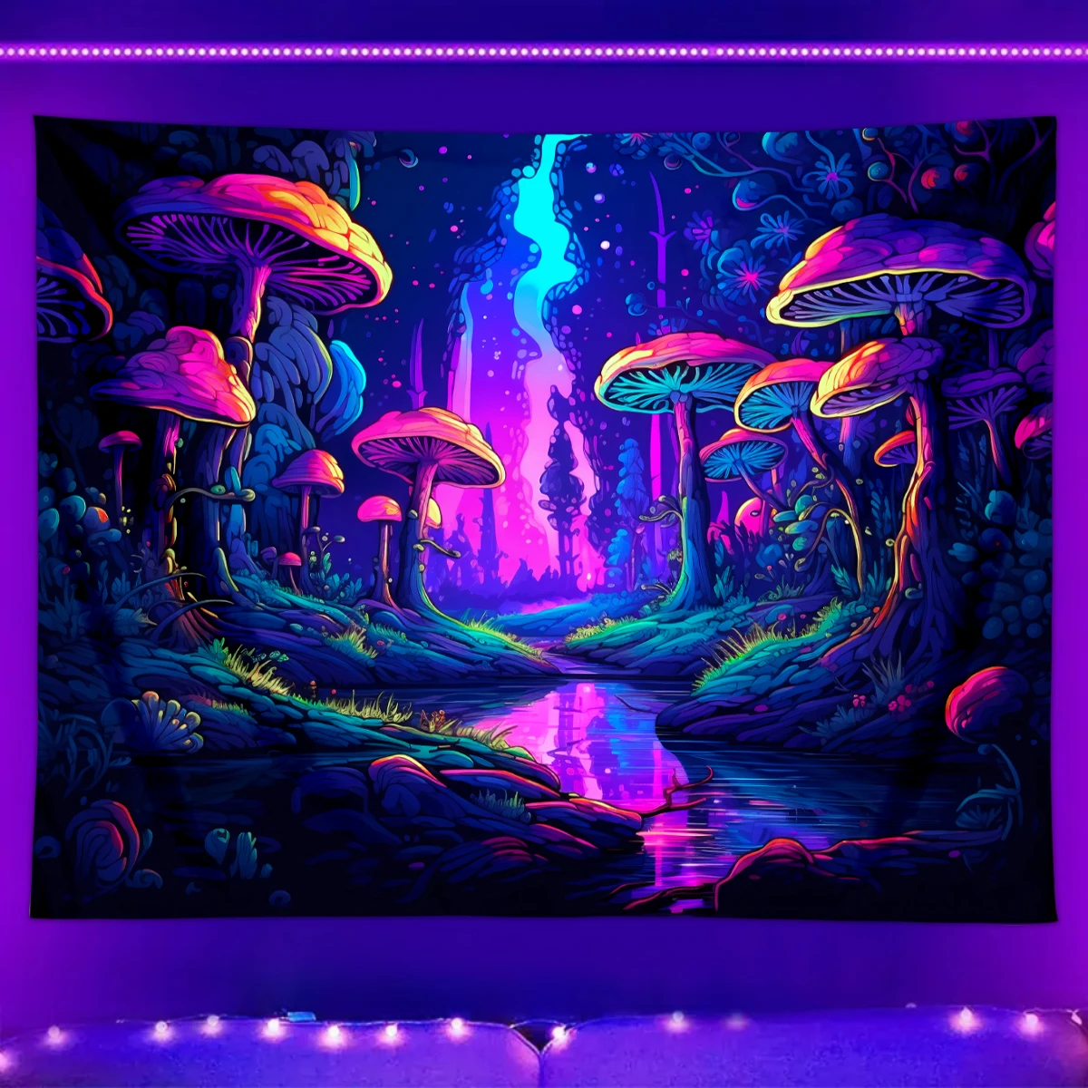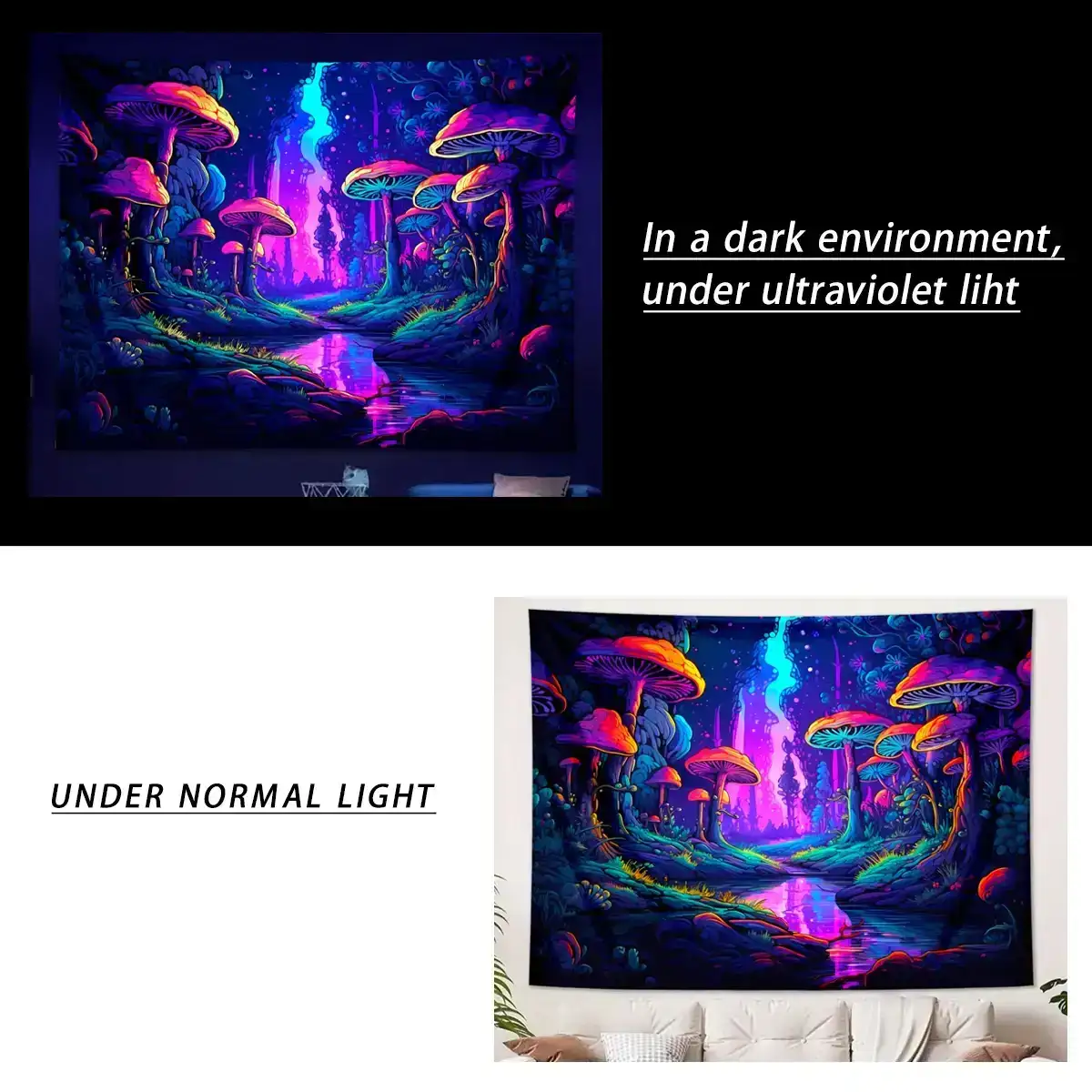 Transform your space with this glowing UV-reactive mushroom forest tapestry. Vibrant neon fluorescent colors explode under blacklight – perfect for psytrance parties, rave rooms, chill corners, and festival decor. Trippy fantasy landscape with sacred mushrooms and psychedelic details that come alive at night. Large wall hanging for ultimate Goa and EDM vibes.