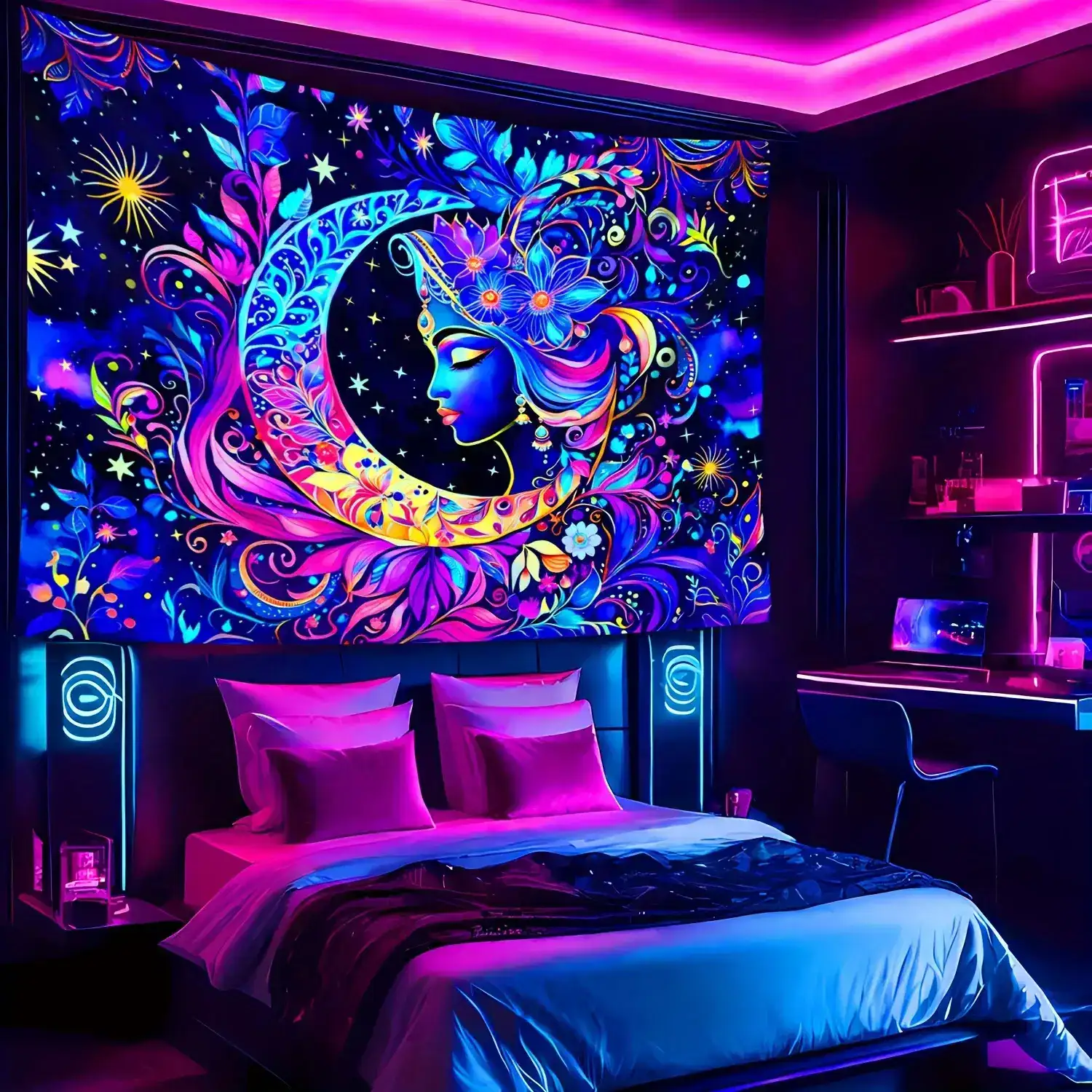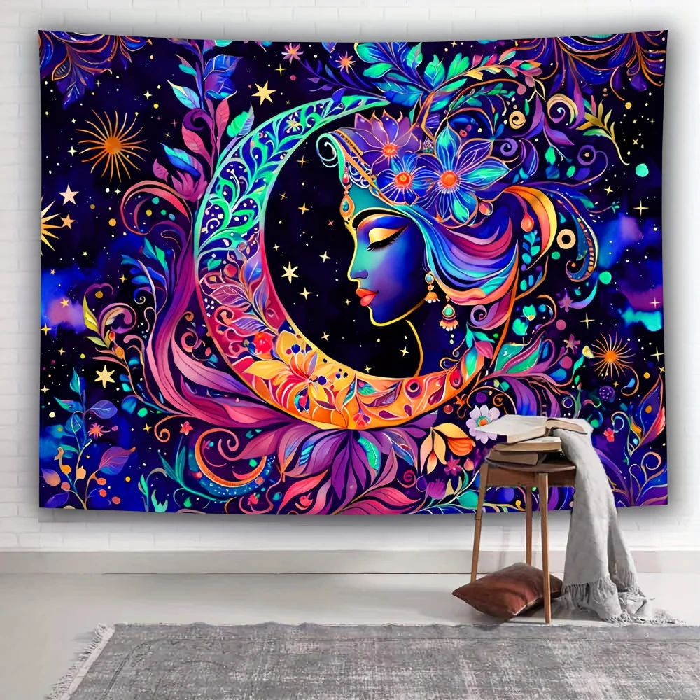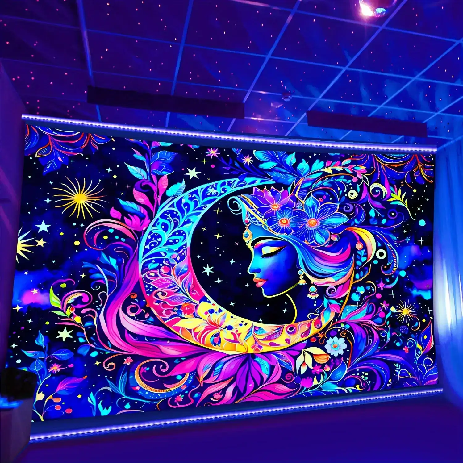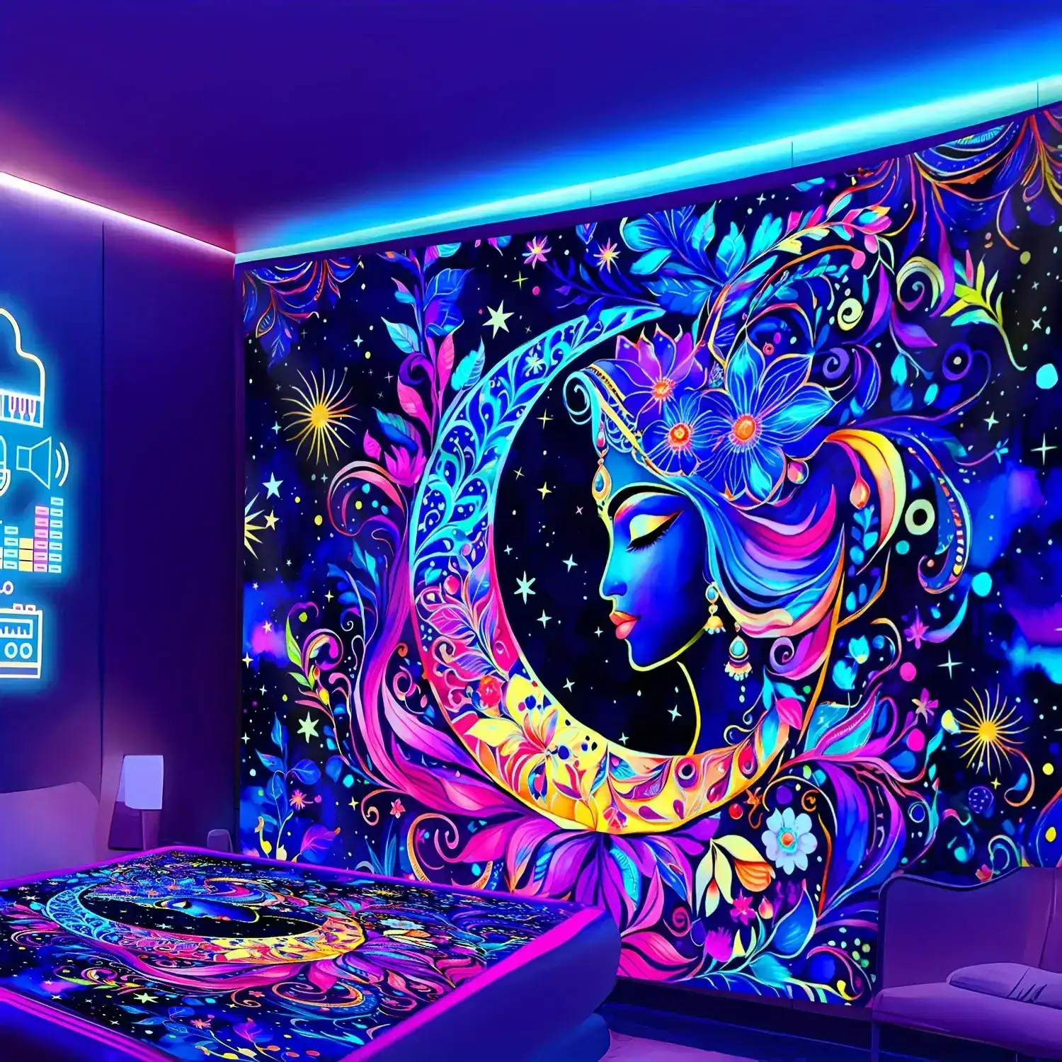 Brighten your space with this Vibrant UV Reactive Boho Tapestry featuring a colorful mandala, moon, stars, and celestial floral patterns. Made from soft polyester, it glows brilliantly under blacklight—perfect for psytrance festival décor, bedroom walls, dorm rooms, meditation corners, and trippy chillout spaces. A magical, bohemian wall hanging that brings cosmic energy and radiant neon vibes to any room.
