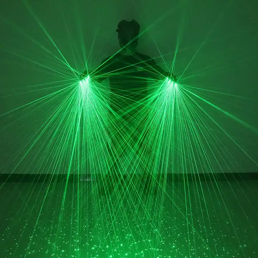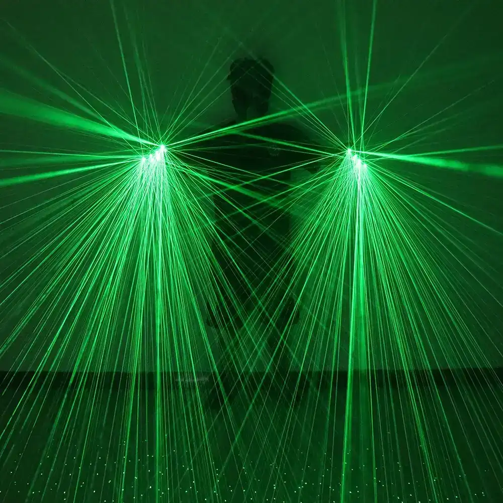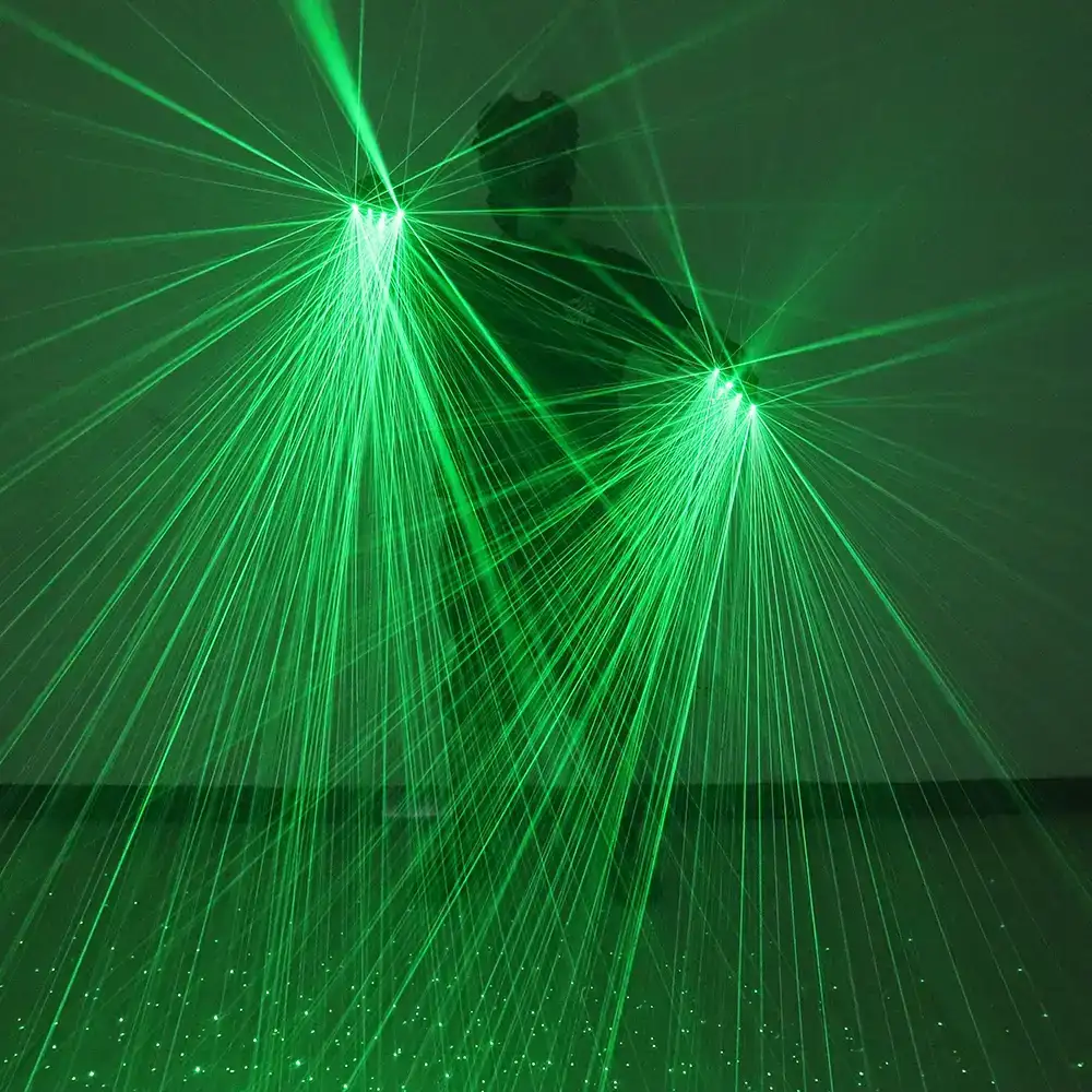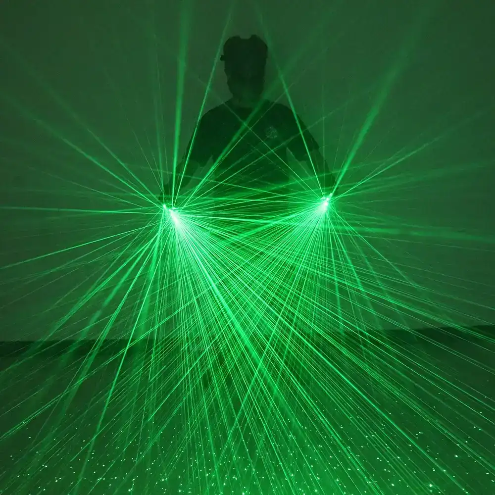 Powerful 532nm green laser gloves with four intense beams per hand. Professional LED palm-light mittens for DJs, stage performances, psytrance parties, disco shows, weddings and nightclub events. Create stunning laser vortex effects that cut through the night and own every dancefloor.