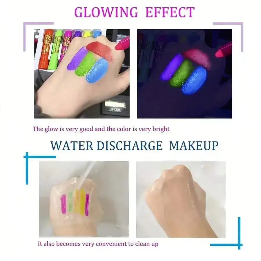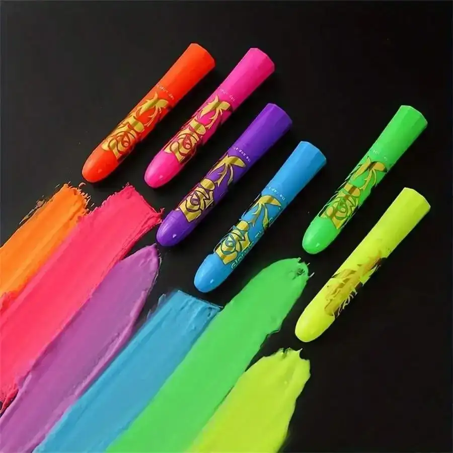 Create bold glowing looks with this 6-color UV Black Light Facial Oil Paint Crayon Set, featuring neon face and body paint sticks that shine intensely under UV and blacklight. Perfect for carnival celebrations, Halloween, masquerade makeup, raves, and psytrance festivals, these easy-to-use marker pens deliver smooth, vibrant, smudge-resistant color. Ideal for creative designs, party costumes, and luminous festival art.