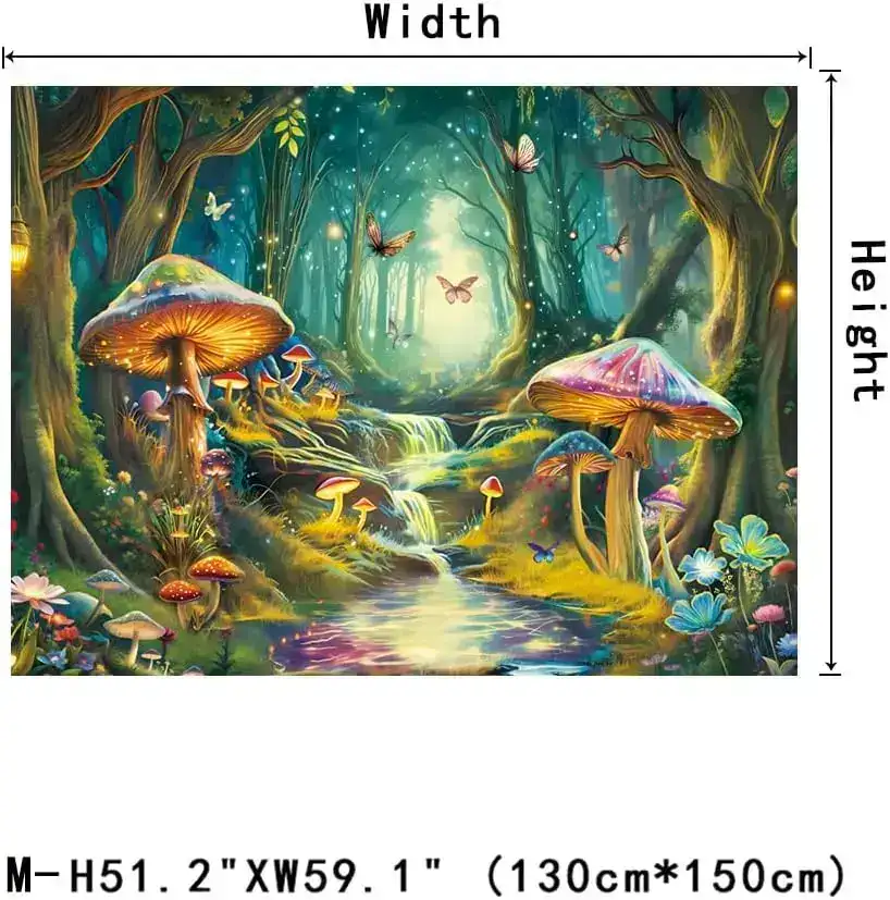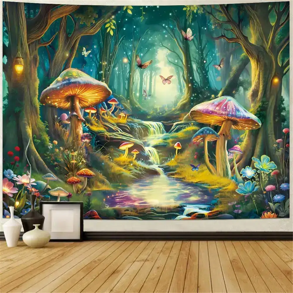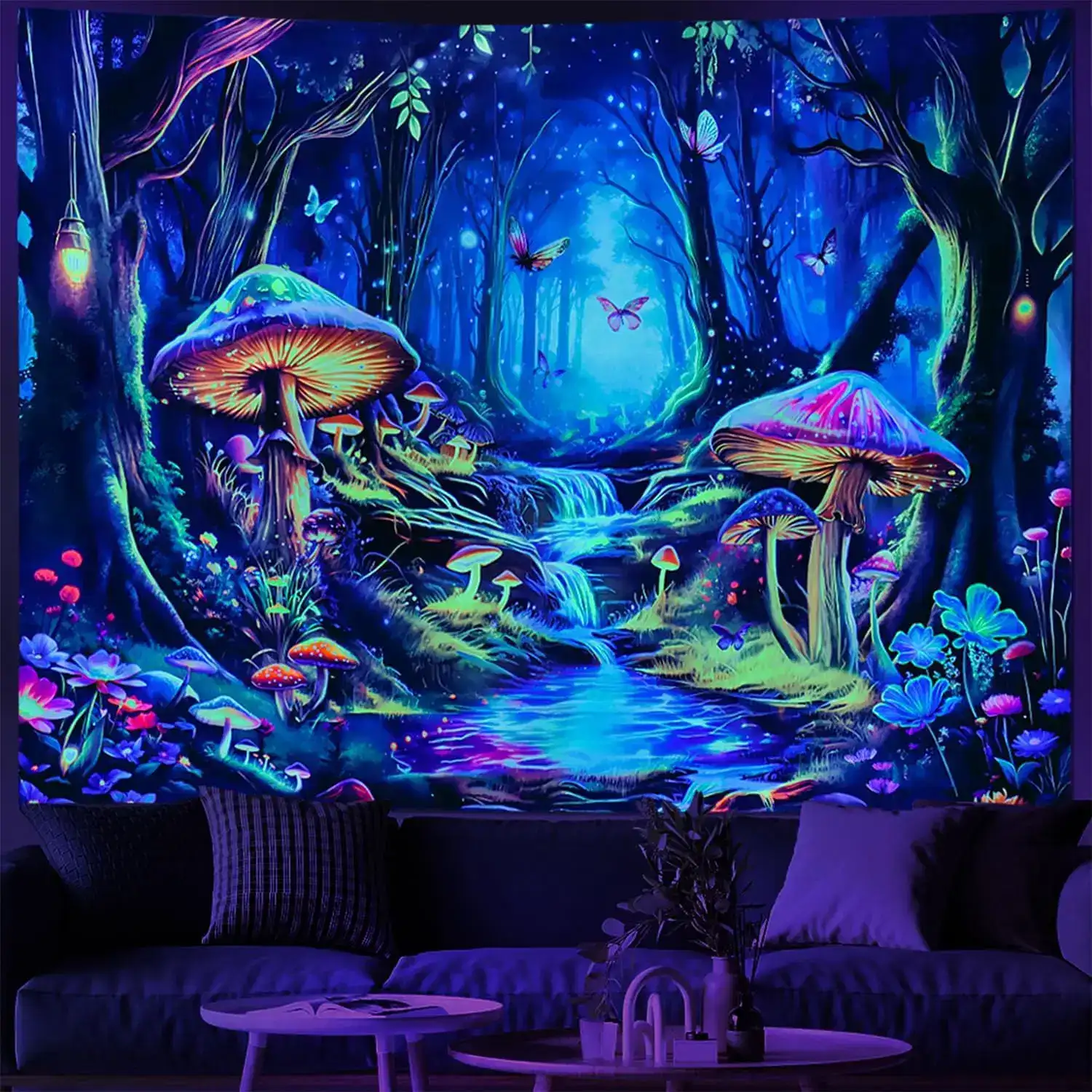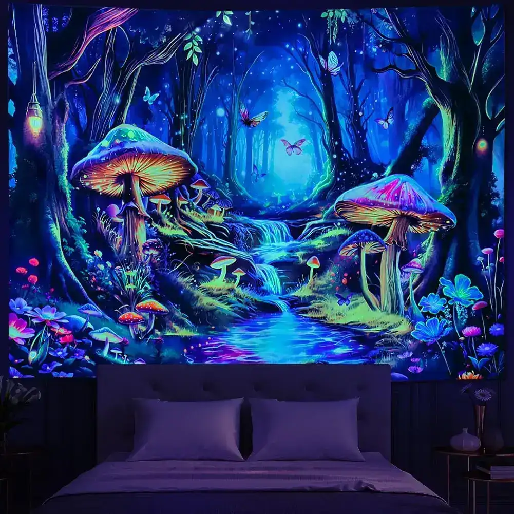 Transform your space with this Blacklight Mushroom Tapestry featuring a UV-reactive misty forest landscape, glowing mushrooms, butterflies, and dreamy fantasy vibes. Under UV light, the colors ignite with psychedelic brilliance—perfect for psytrance festival décor, rave rooms, meditation spaces, bedrooms, and creative chillout lounges. A mystical wall hanging that brings a fairy-world atmosphere and vibrant neon energy to any environment.
