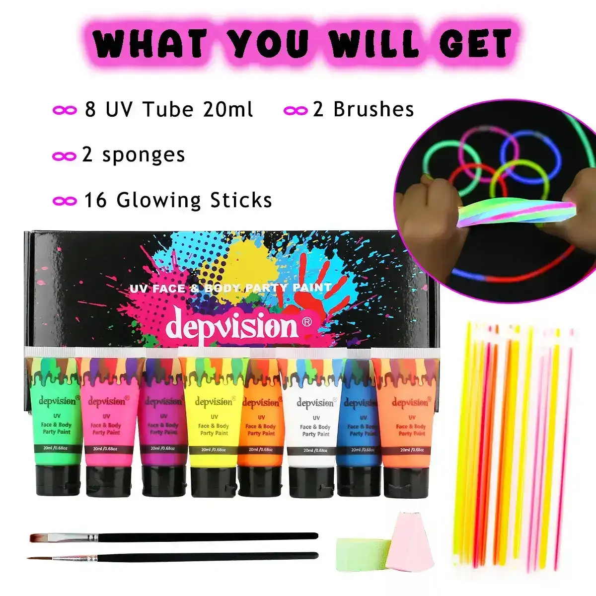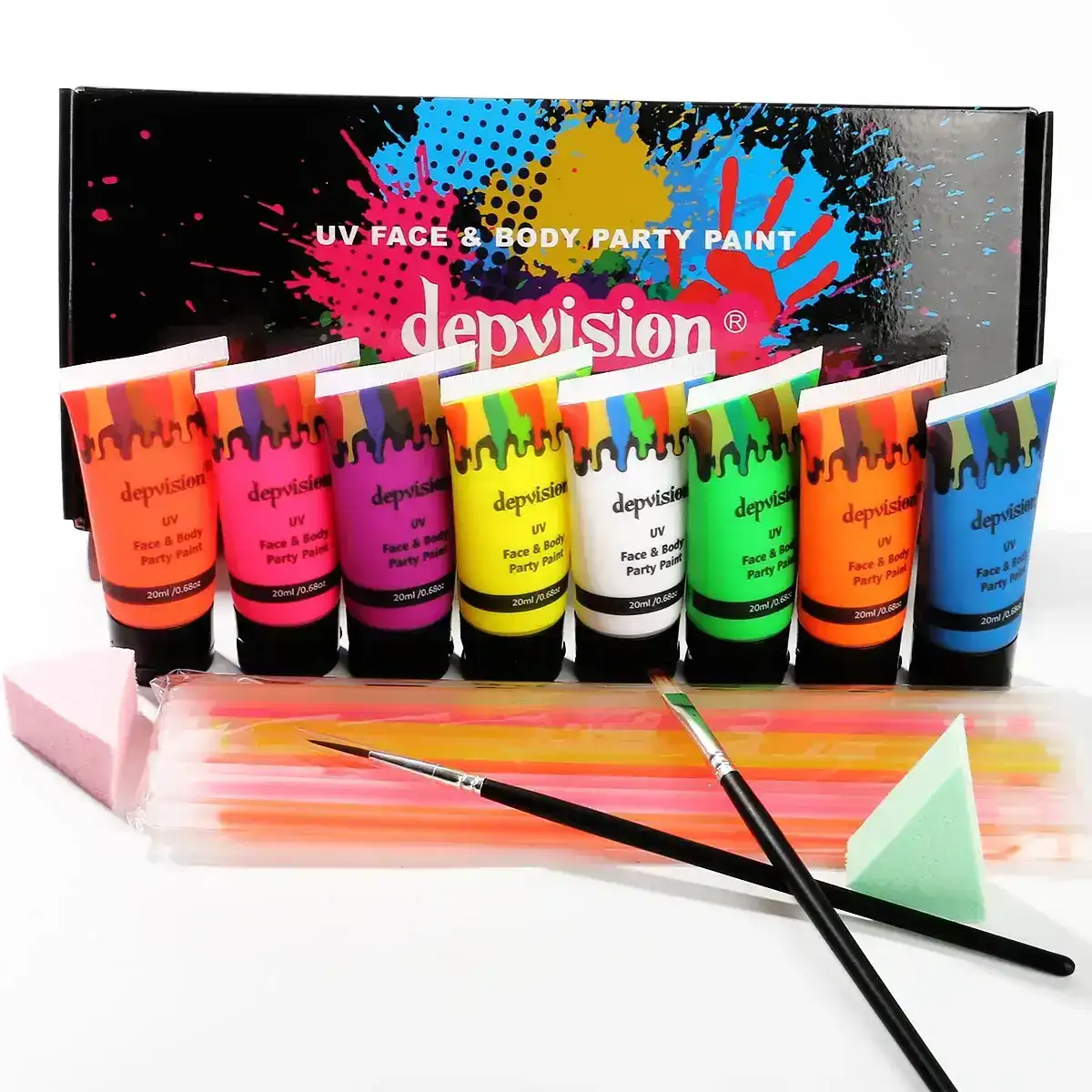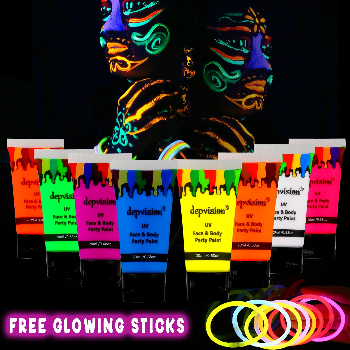 Light up any celebration with the Depvision Glow in the Dark UV Face and Body Paint set, featuring 8 vibrant 20ml tubes of neon, blacklight-reactive colors. These fluorescent paints shine brilliantly under UV light, making them perfect for psytrance festivals, raves, Christmas parties, Halloween, cosplay, and creative body art. Smooth, safe, and intensely bright—your go-to glow makeup for unforgettable night-time looks.