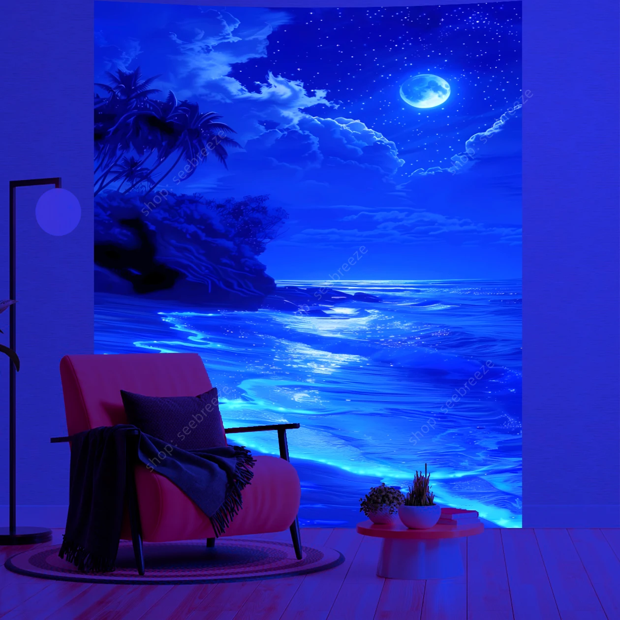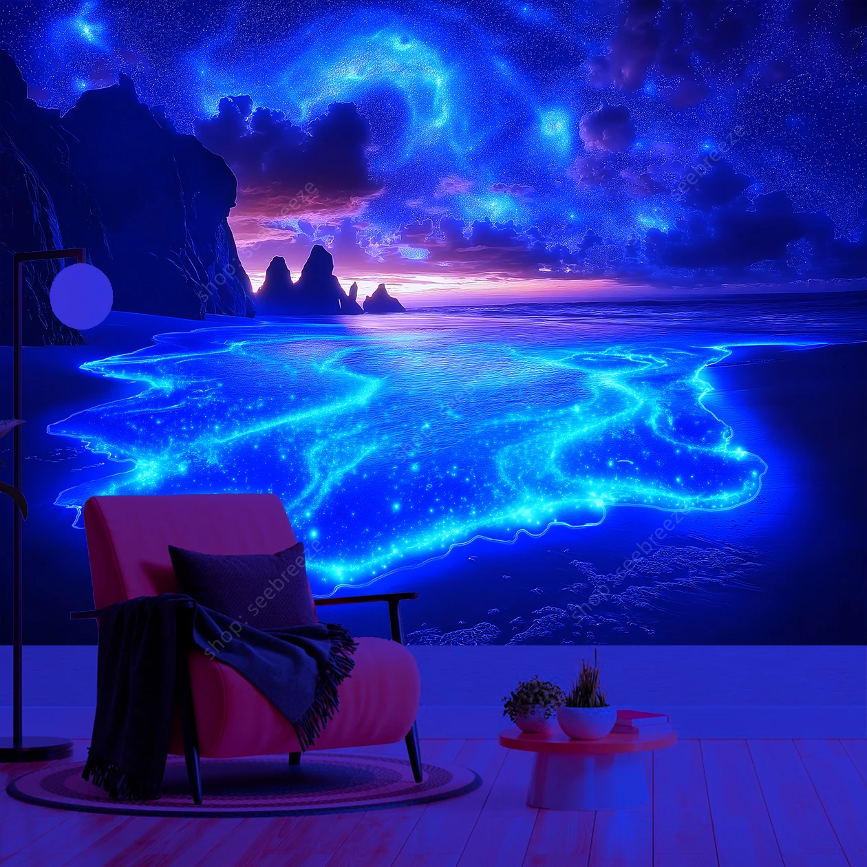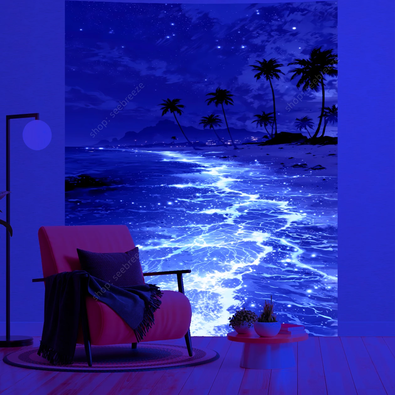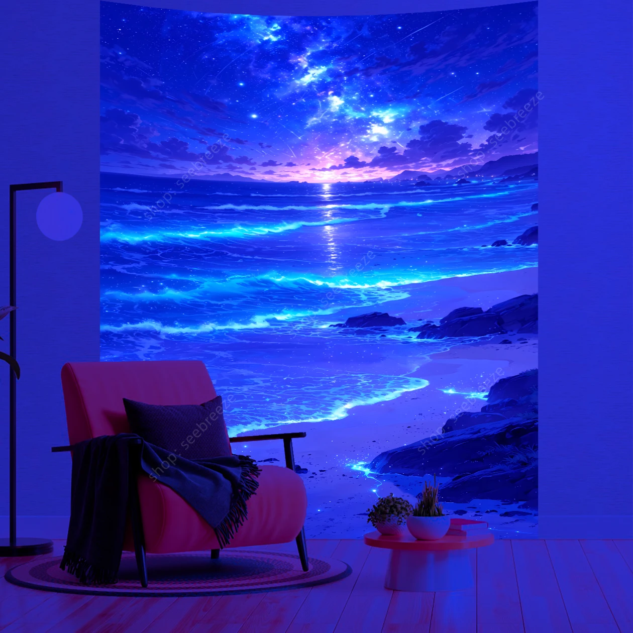 Create a dreamy, glowing atmosphere with this UV Reactive Beach & Starry Sky Tapestry, featuring a luminous ocean night scene that comes alive under blacklight. Perfect for transforming your bedroom, living room, studio, or festival chill-out space, this tapestry blends fantasy art with a serene cosmic vibe.