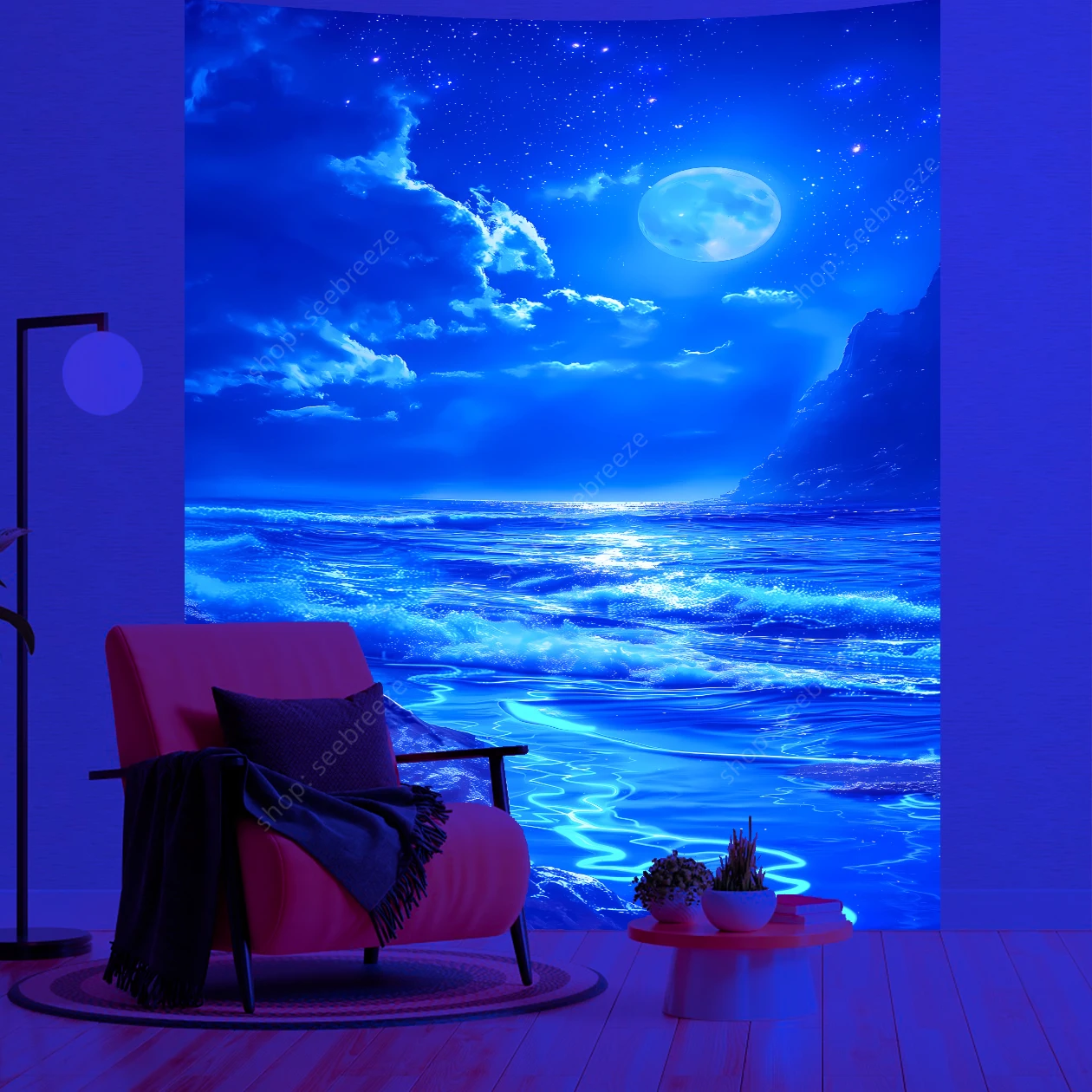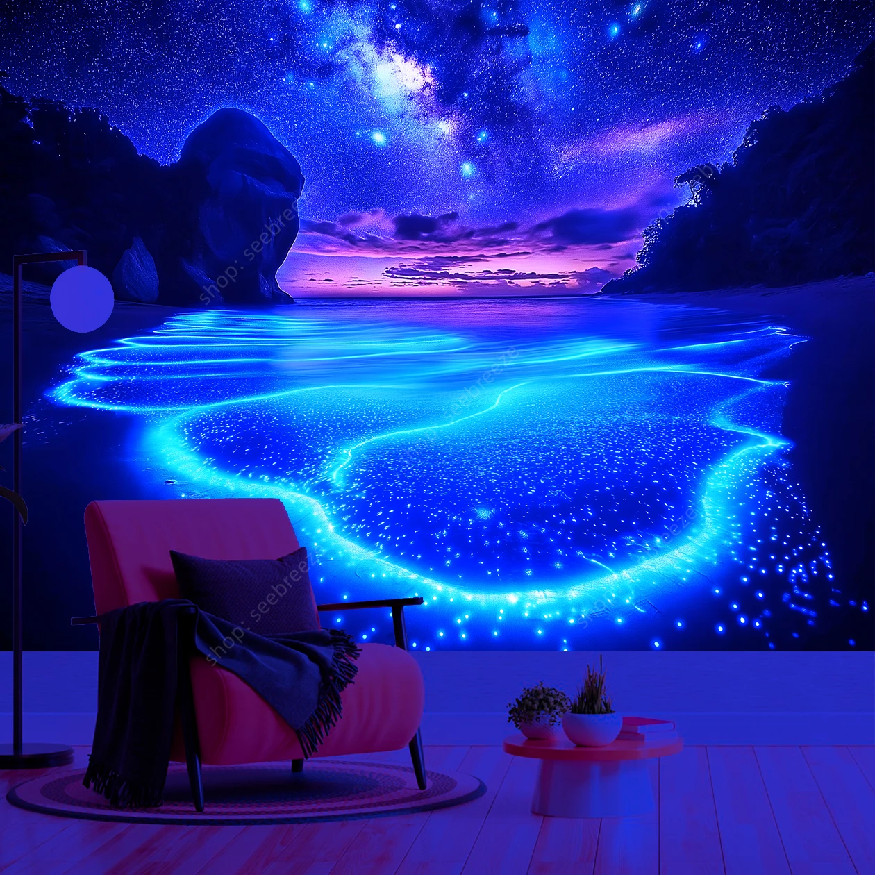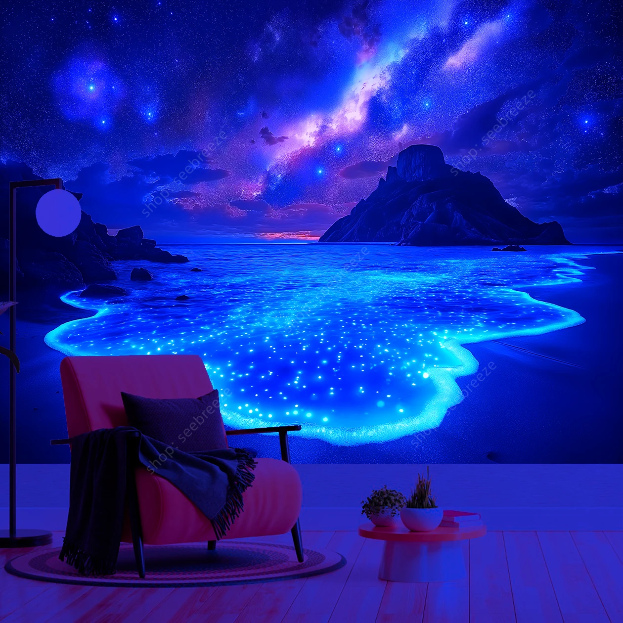 Create a dreamy, glowing atmosphere with this UV Reactive Beach & Starry Sky Tapestry, featuring a luminous ocean night scene that comes alive under blacklight. Perfect for transforming your bedroom, living room, studio, or festival chill-out space, this tapestry blends fantasy art with a serene cosmic vibe.