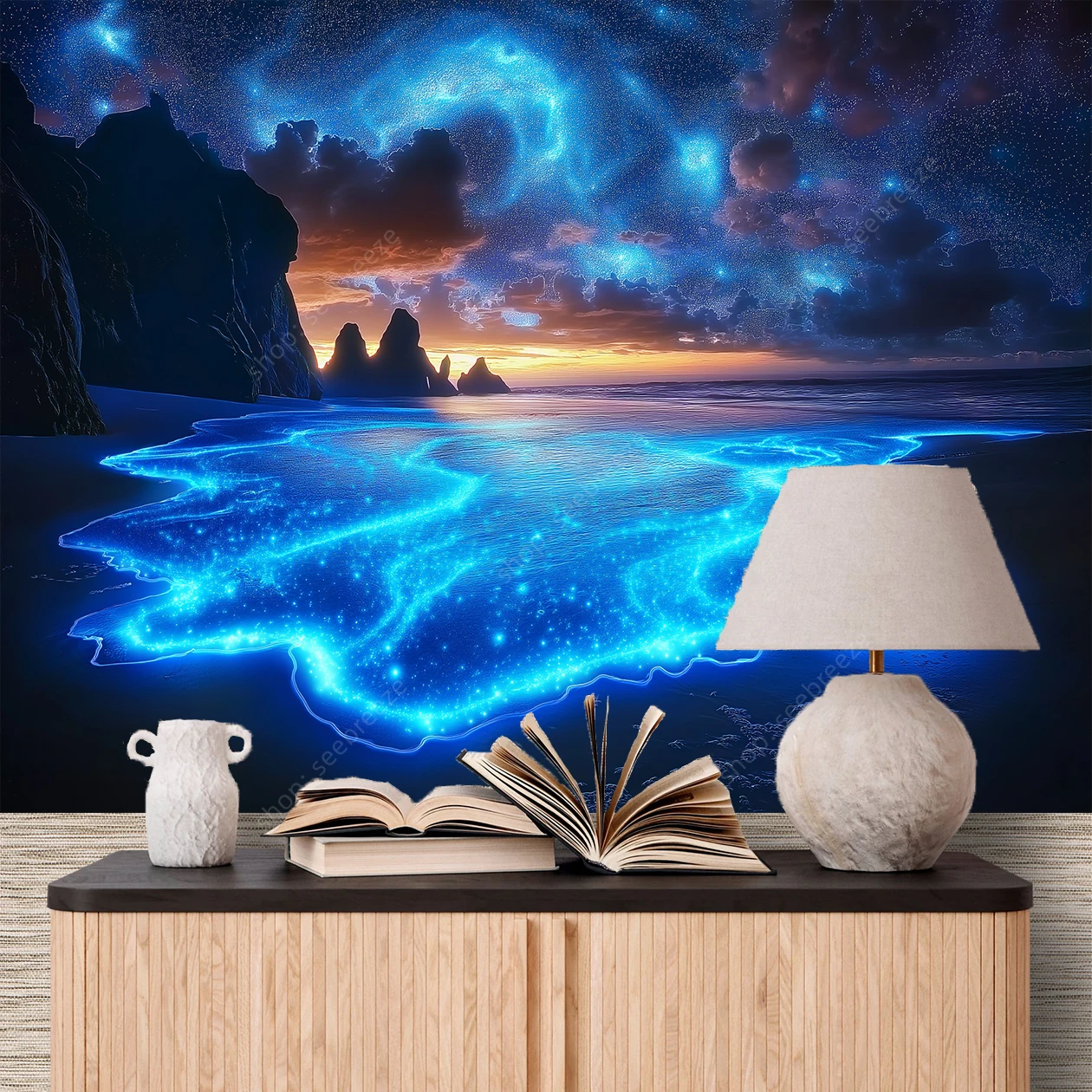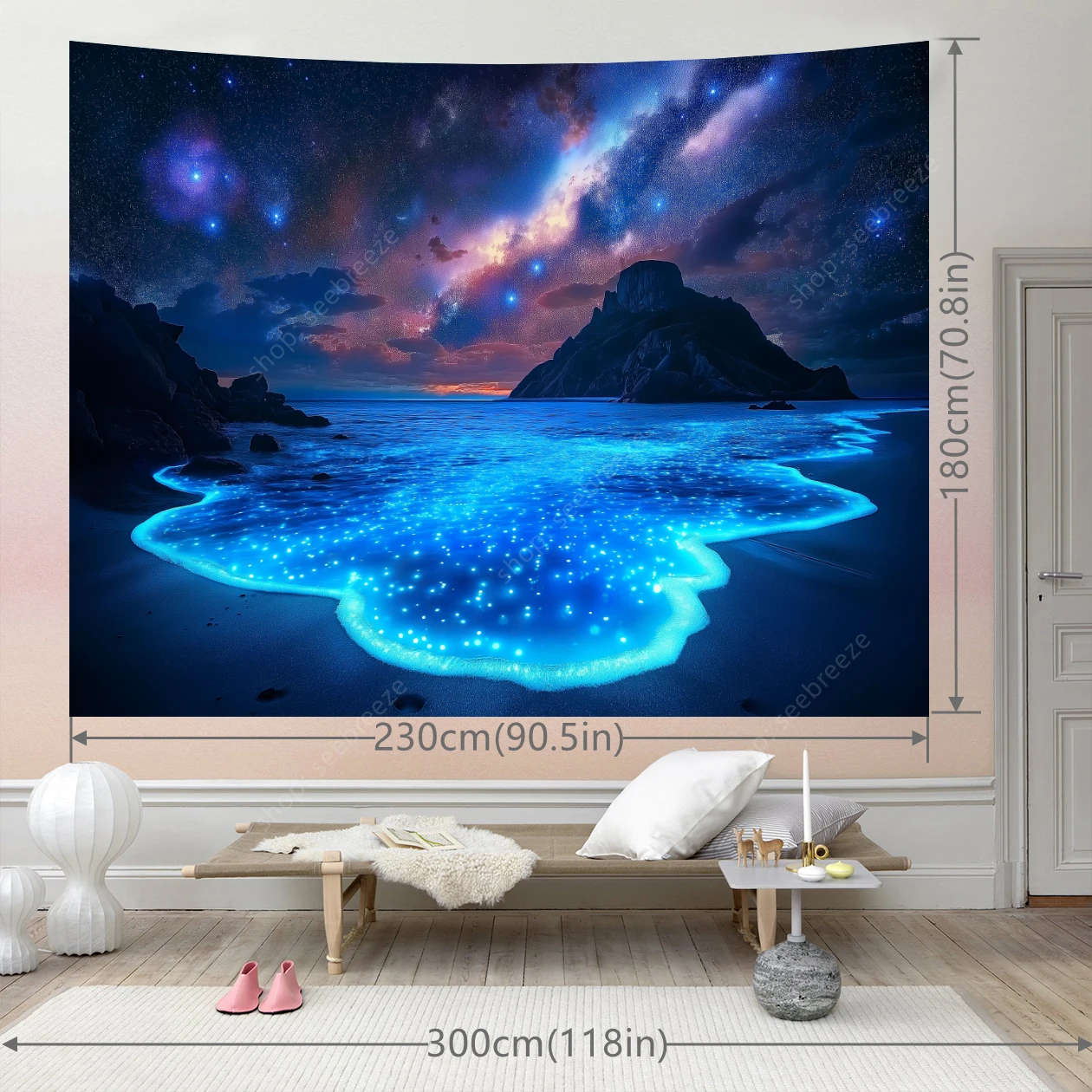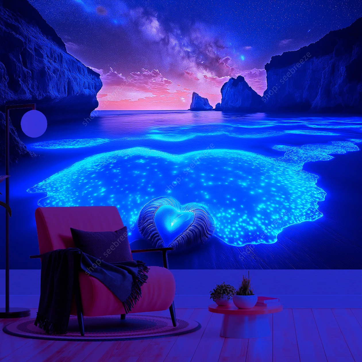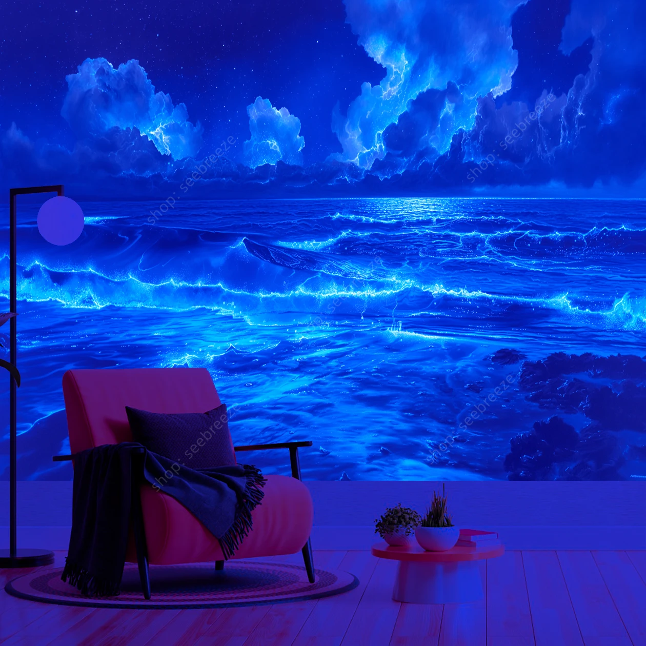 Create a dreamy, glowing atmosphere with this UV Reactive Beach & Starry Sky Tapestry, featuring a luminous ocean night scene that comes alive under blacklight. Perfect for transforming your bedroom, living room, studio, or festival chill-out space, this tapestry blends fantasy art with a serene cosmic vibe.