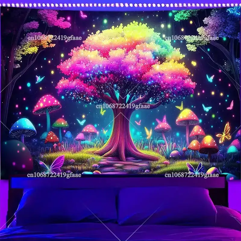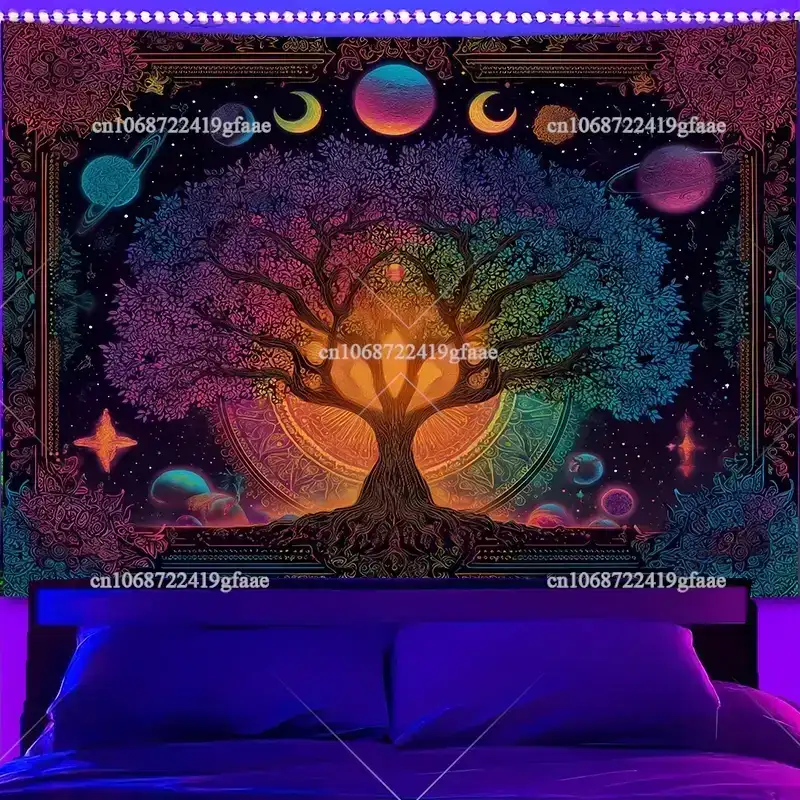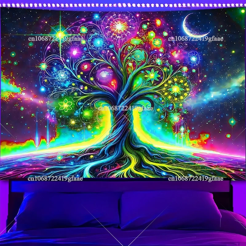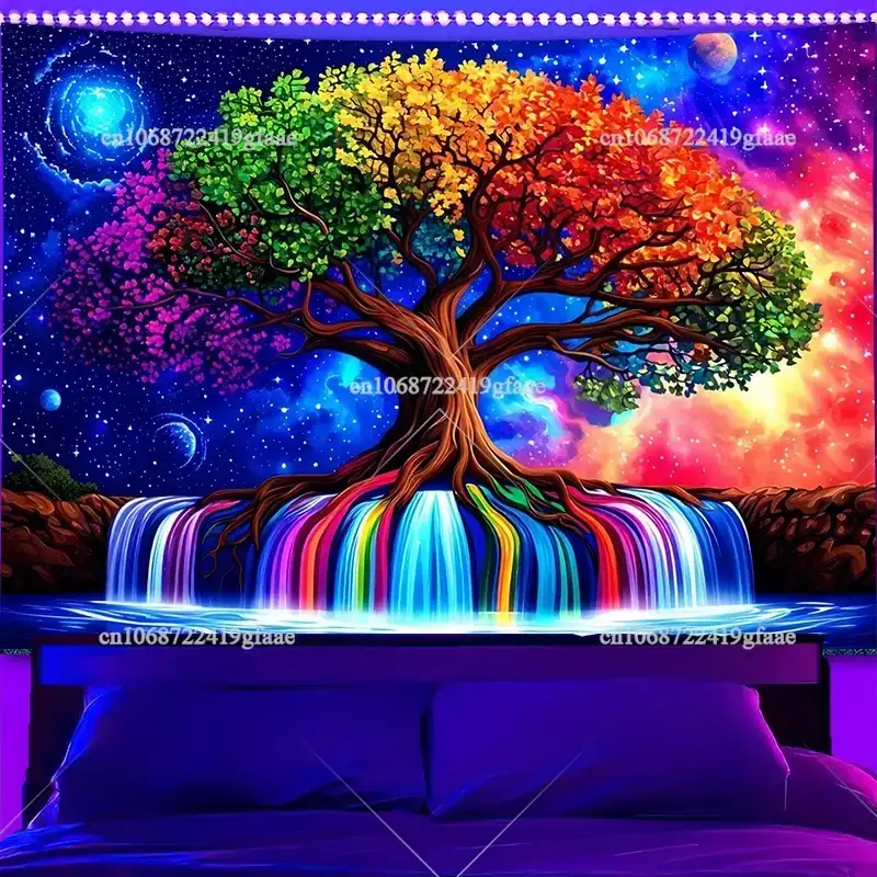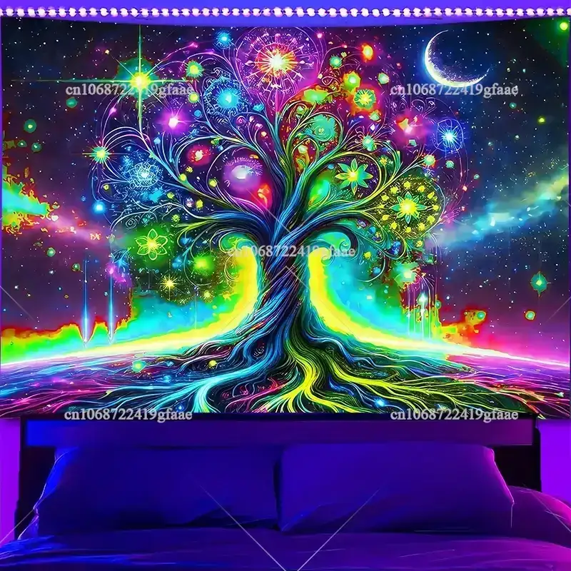 Printed with bright fluorescent inks, this tapestry brings a trippy galaxy vibe with a glowing rainbow tree that feels alive under UV light. Lightweight and durable, it hangs easily and transforms any room into a psychedelic sanctuary.
