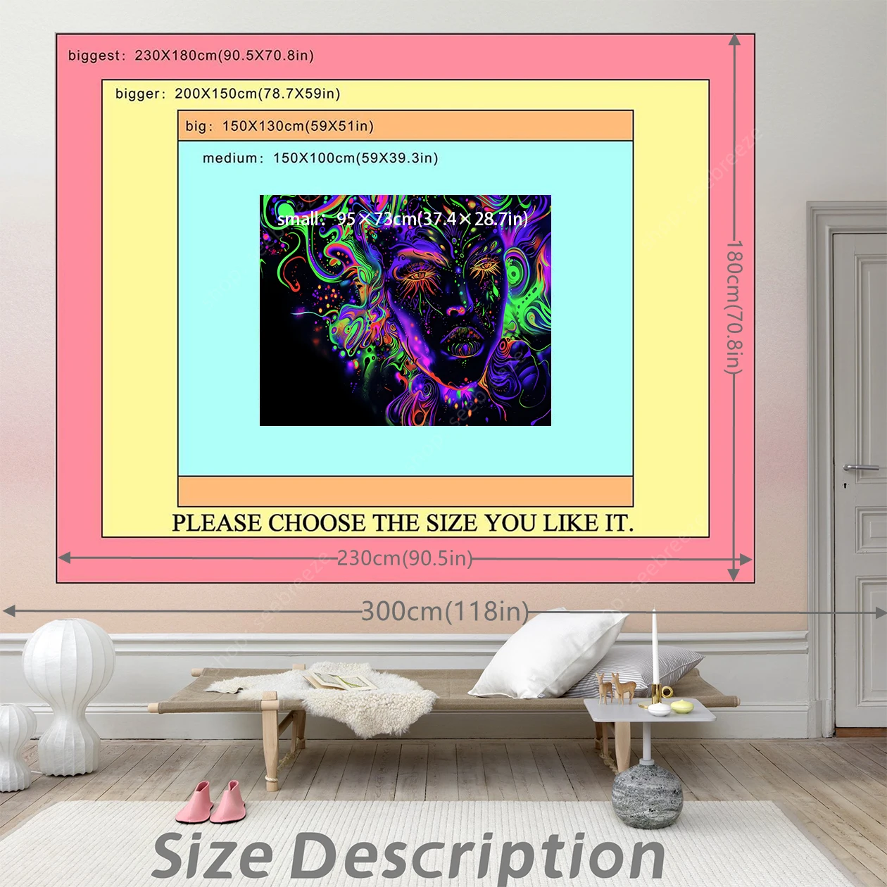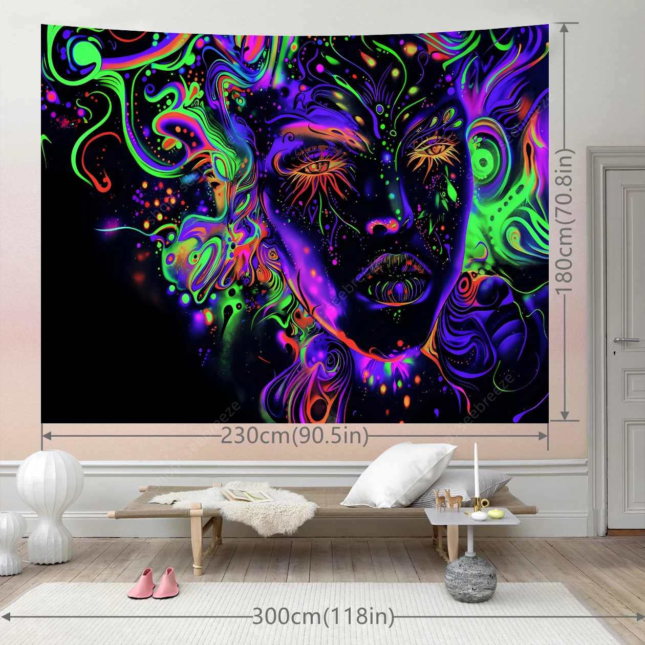 Hypnotic UV-reactive psychedelic face tapestry with vivid neon mystic patterns that ignite under blacklight. Abstract vibrant design on dark background – perfect for rave rooms, psytrance chill spaces, bedroom walls, and festival decor. Transform any space into a glowing third-eye portal.
