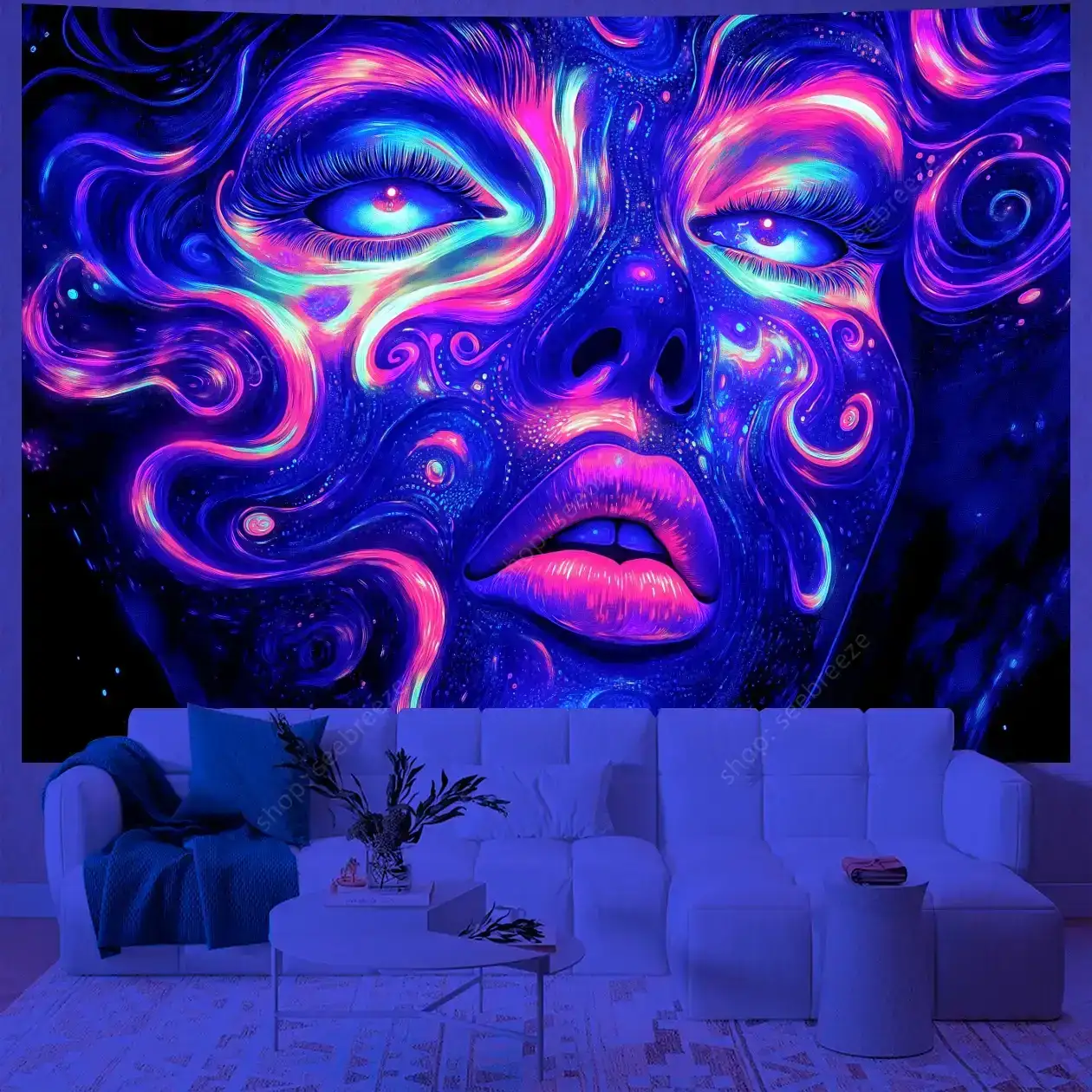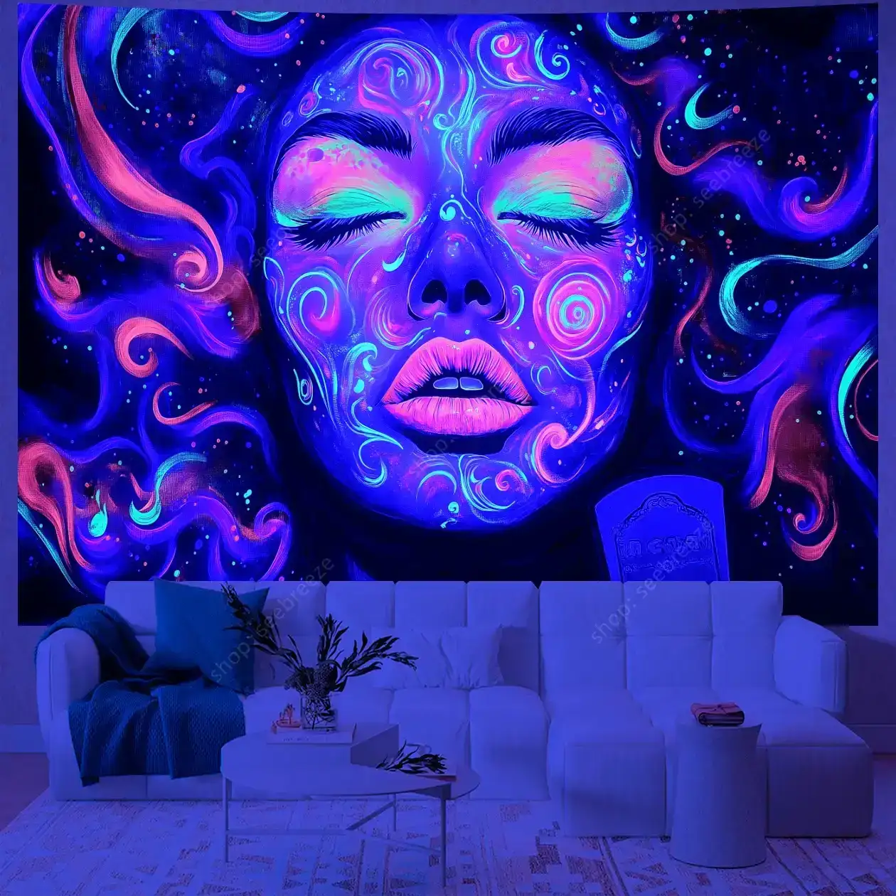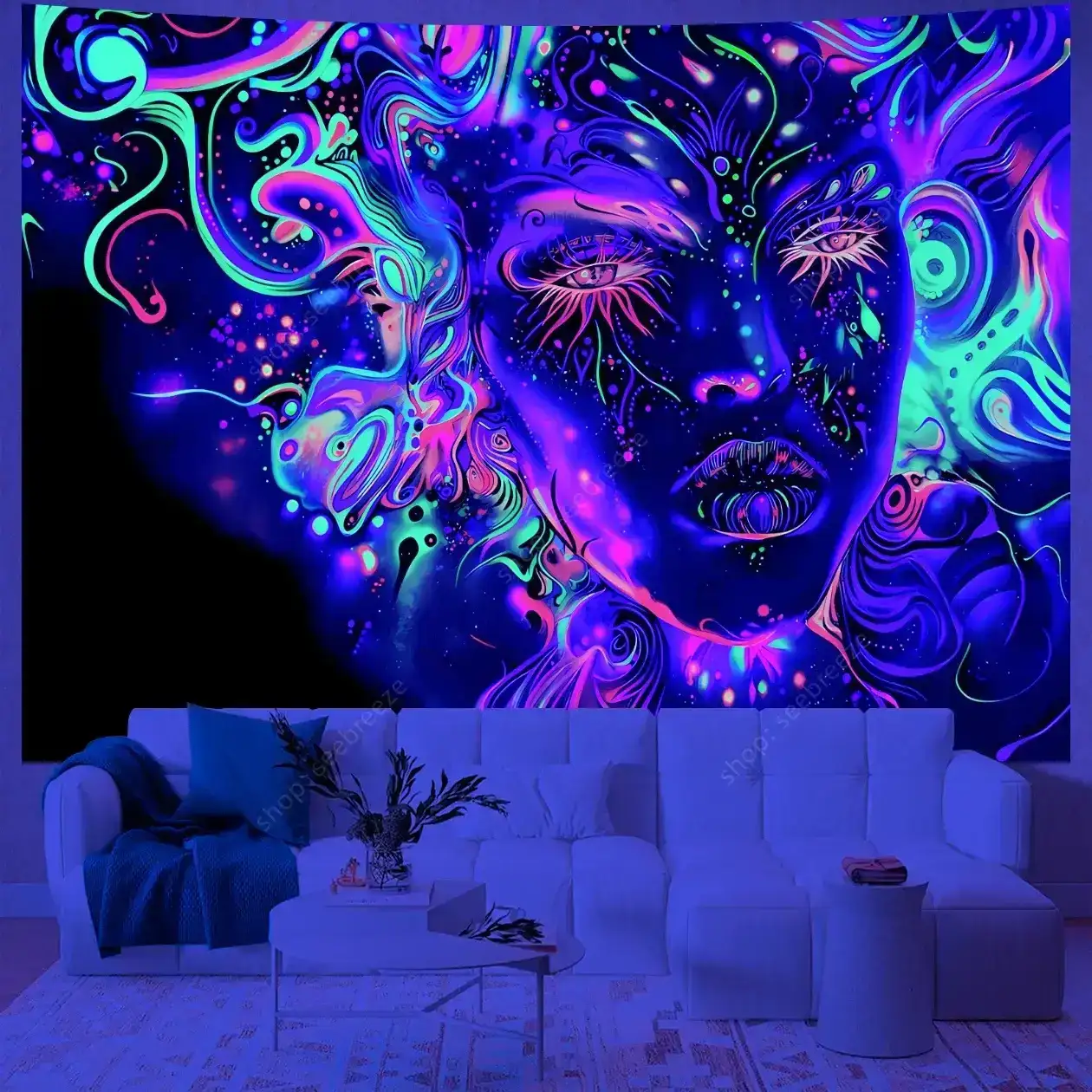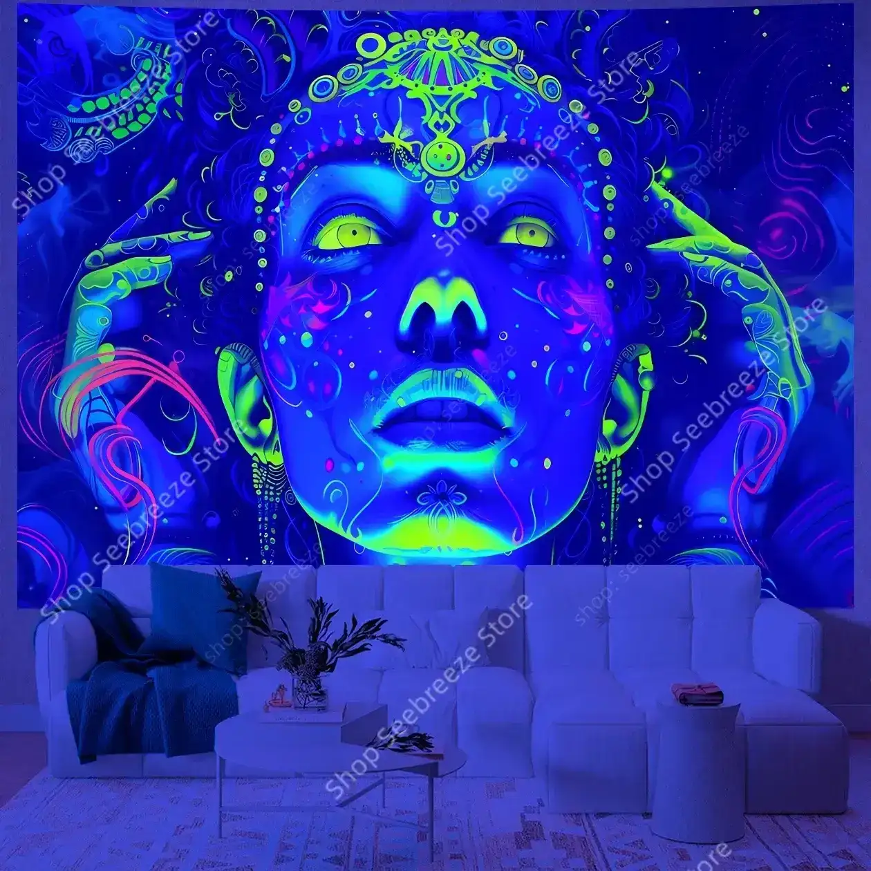 Hypnotic UV-reactive psychedelic face tapestry with vivid neon mystic patterns that ignite under blacklight. Abstract vibrant design on dark background – perfect for rave rooms, psytrance chill spaces, bedroom walls, and festival decor. Transform any space into a glowing third-eye portal.