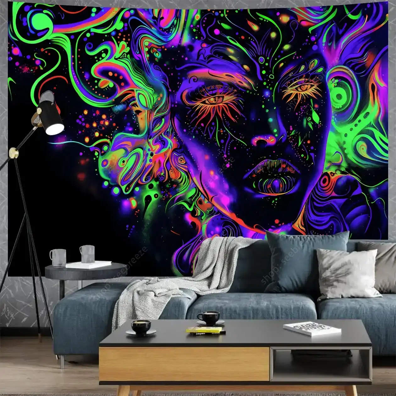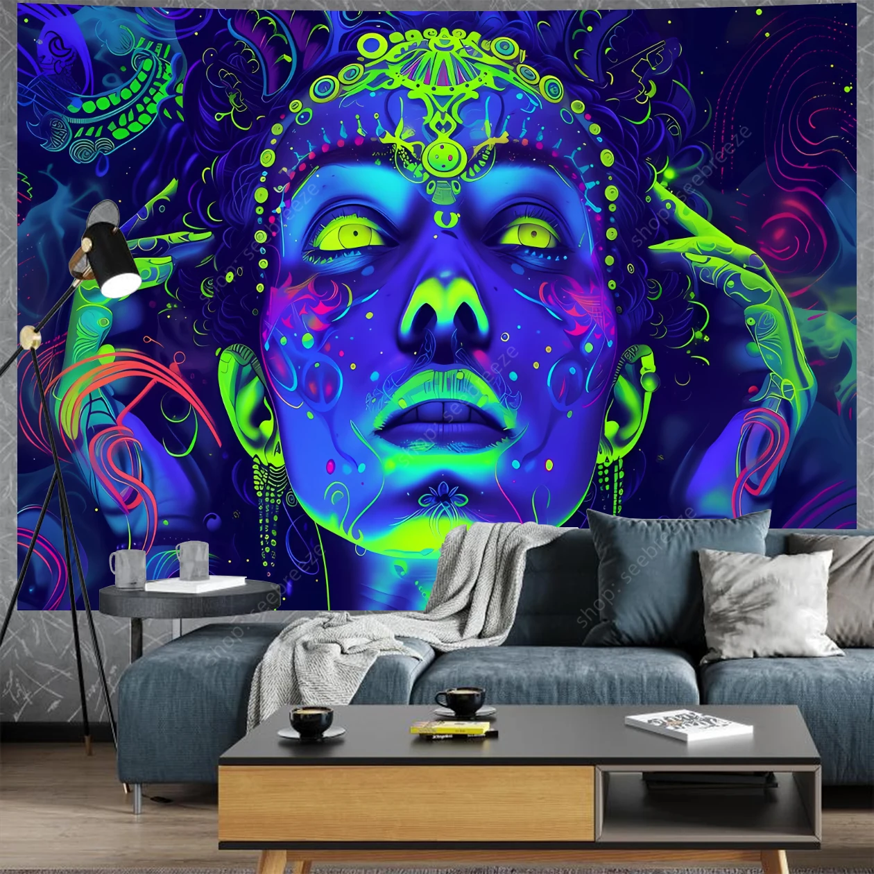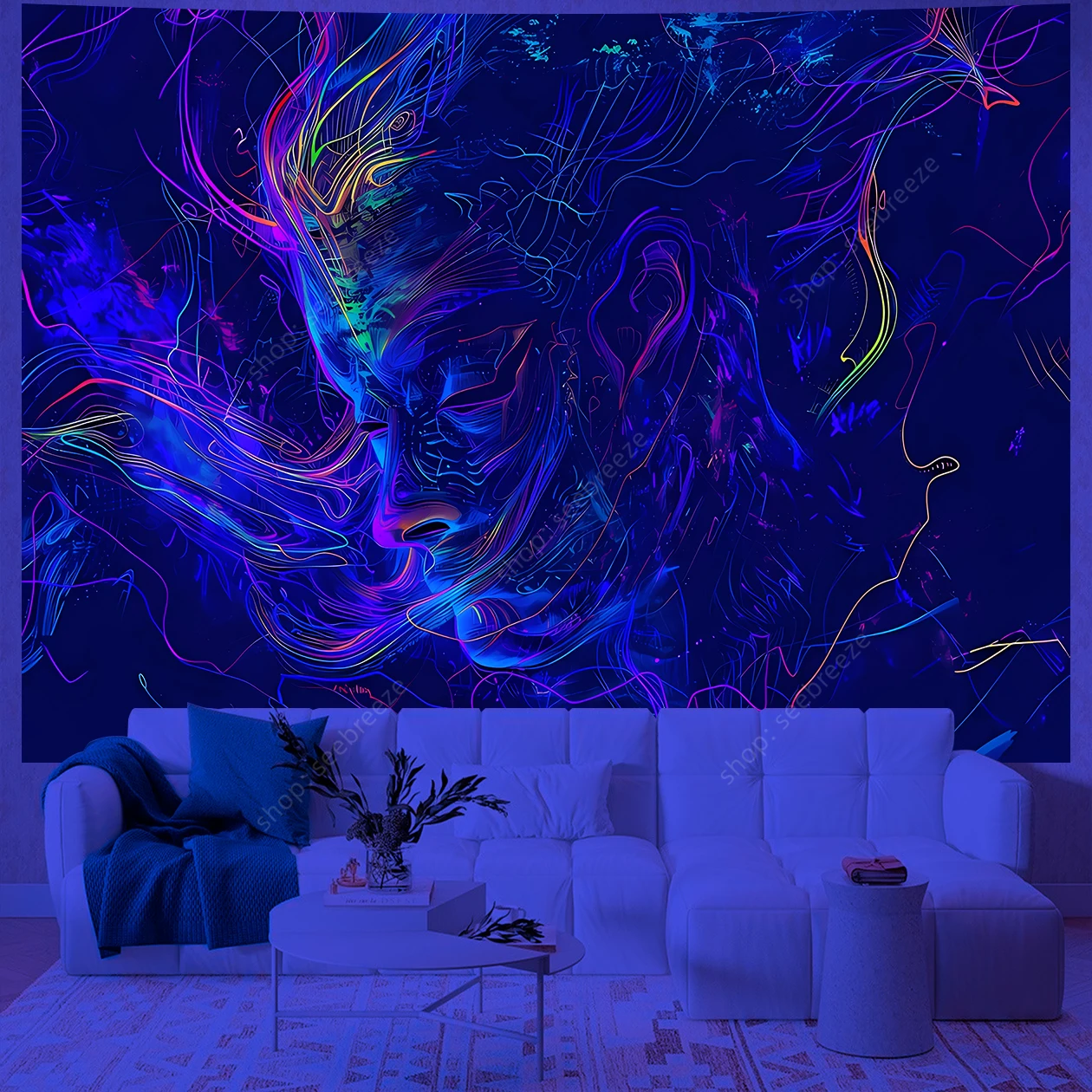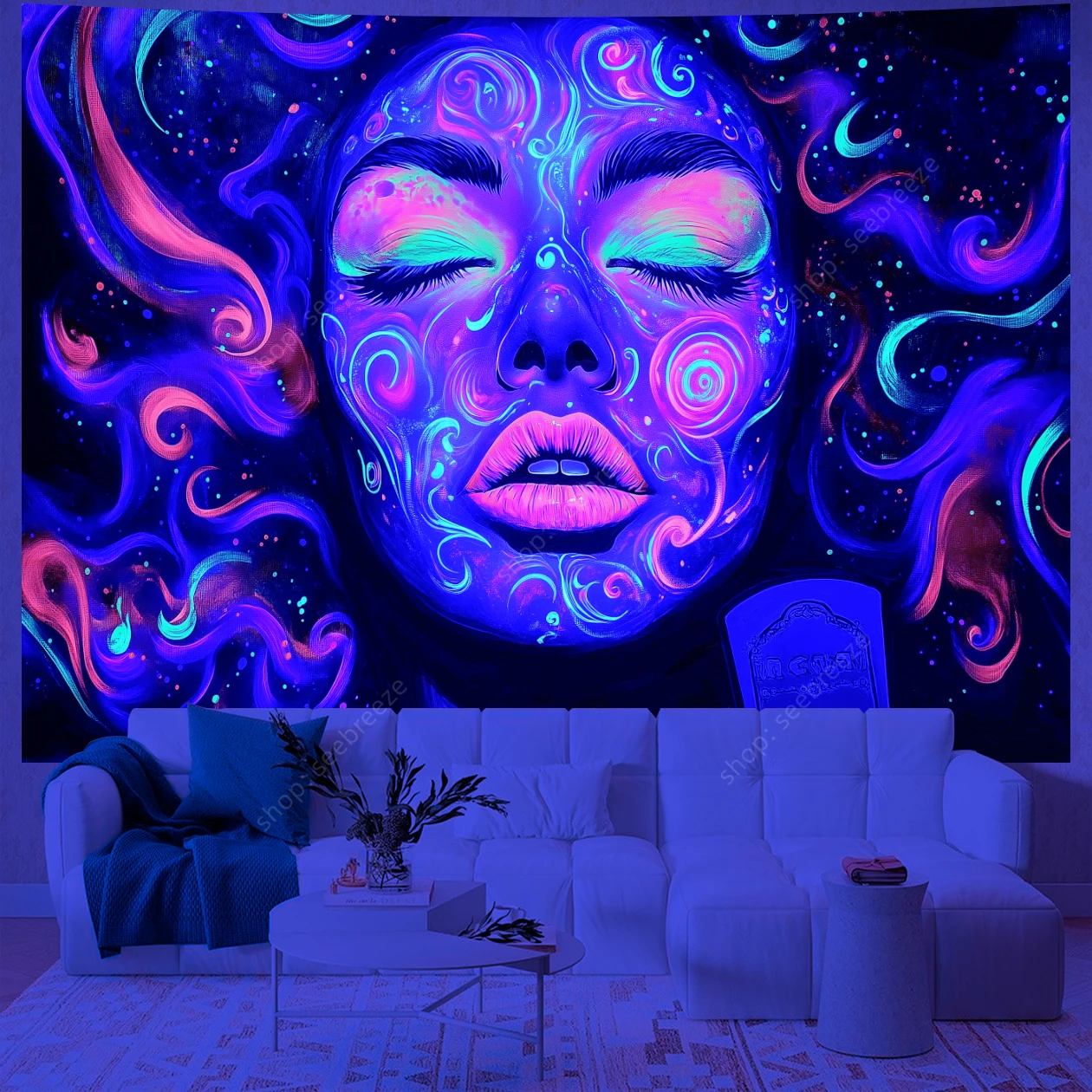 Hypnotic UV-reactive psychedelic face tapestry with vivid neon mystic patterns that ignite under blacklight. Abstract vibrant design on dark background – perfect for rave rooms, psytrance chill spaces, bedroom walls, and festival decor. Transform any space into a glowing third-eye portal.