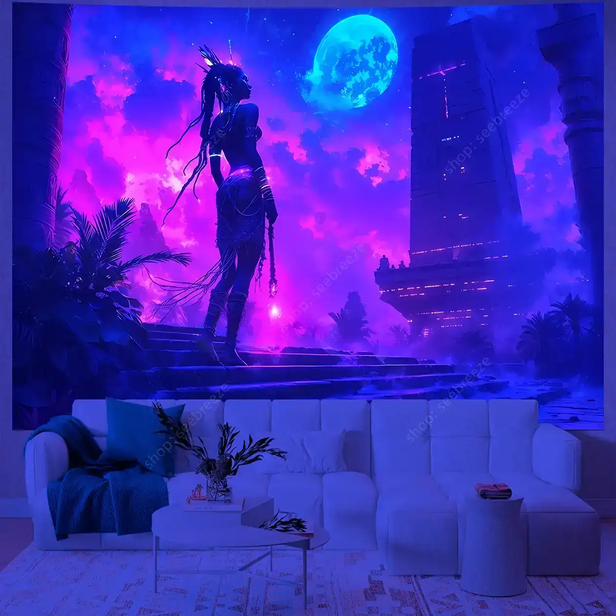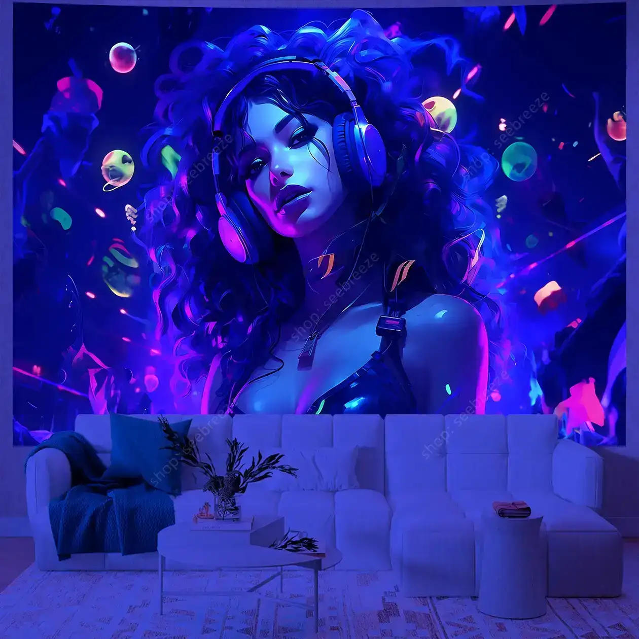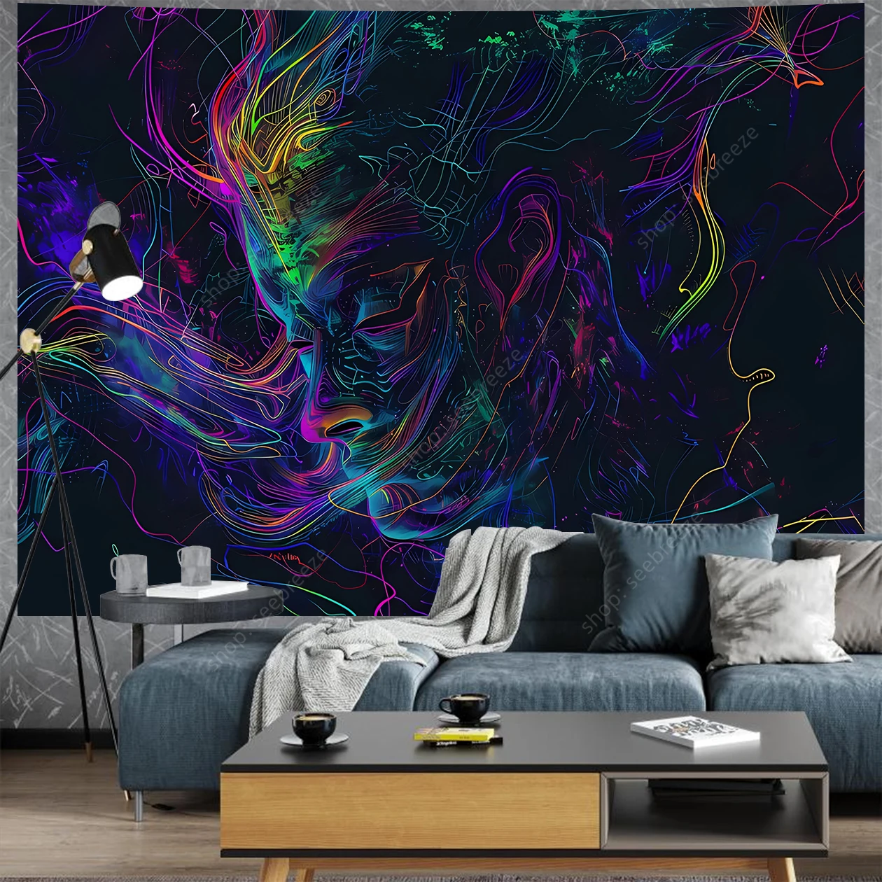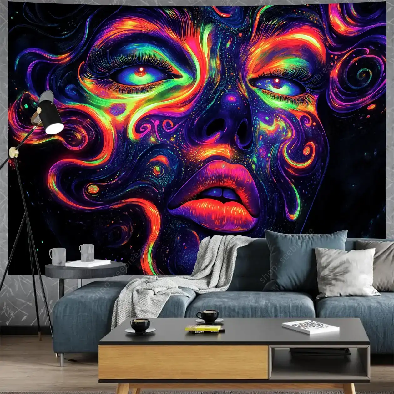 Hypnotic UV-reactive psychedelic face tapestry with vivid neon mystic patterns that ignite under blacklight. Abstract vibrant design on dark background – perfect for rave rooms, psytrance chill spaces, bedroom walls, and festival decor. Transform any space into a glowing third-eye portal.