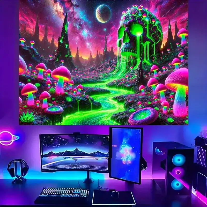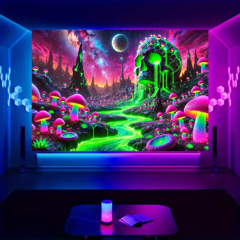 Elevate your space with the VIKAMA Alien Skull Tapestry featuring a trippy mushroom nebula design that glows with cosmic, psychedelic energy. Perfect for gaming setups, esports rooms, music party décor, and any space that craves bold extraterrestrial vibes. This vibrant wall hanging adds depth, color, and a futuristic sci-fi atmosphere to your room’s theme.