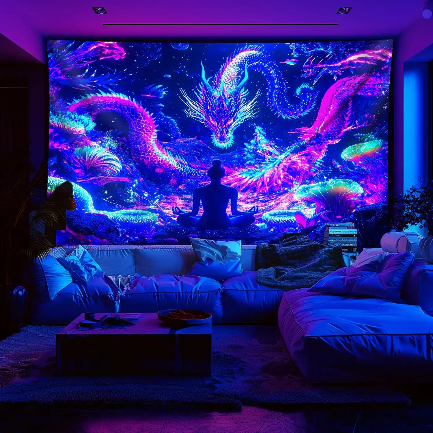 Light up your space with this UV reactive Cyber Dragon Soul Tapestry, designed for psychedelic environments and trance lovers. The vibrant neon colors burst to life under blacklight, revealing glowing dragon scales, cosmic gradients, and hypnotic patterns—perfect for rave rooms, psytrance festivals, chillout zones, DJ booths, and UV-decorated spaces.
