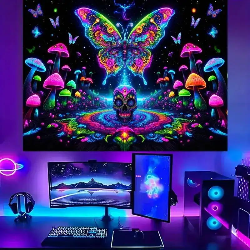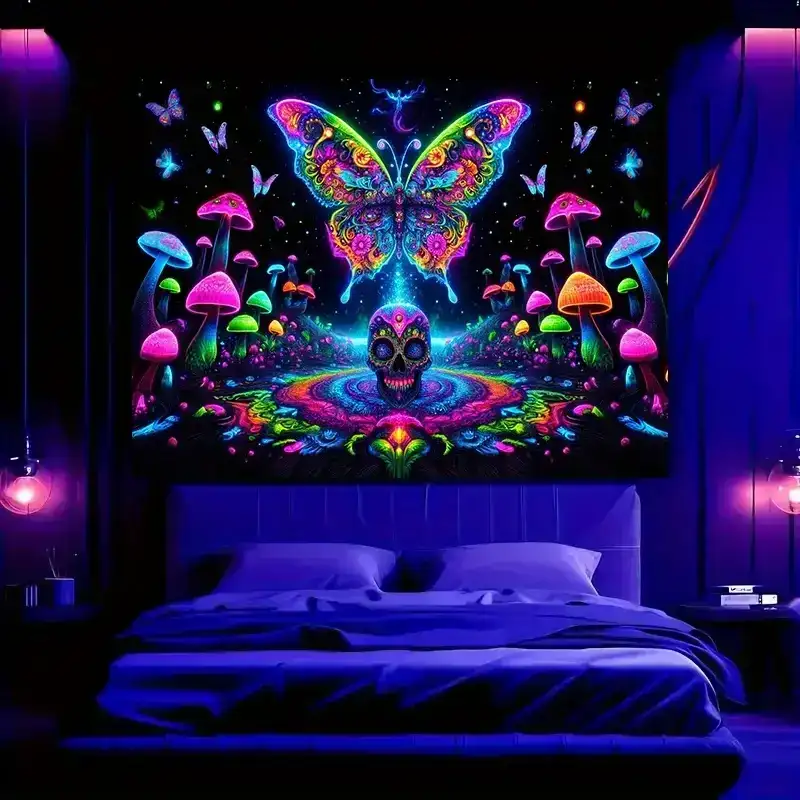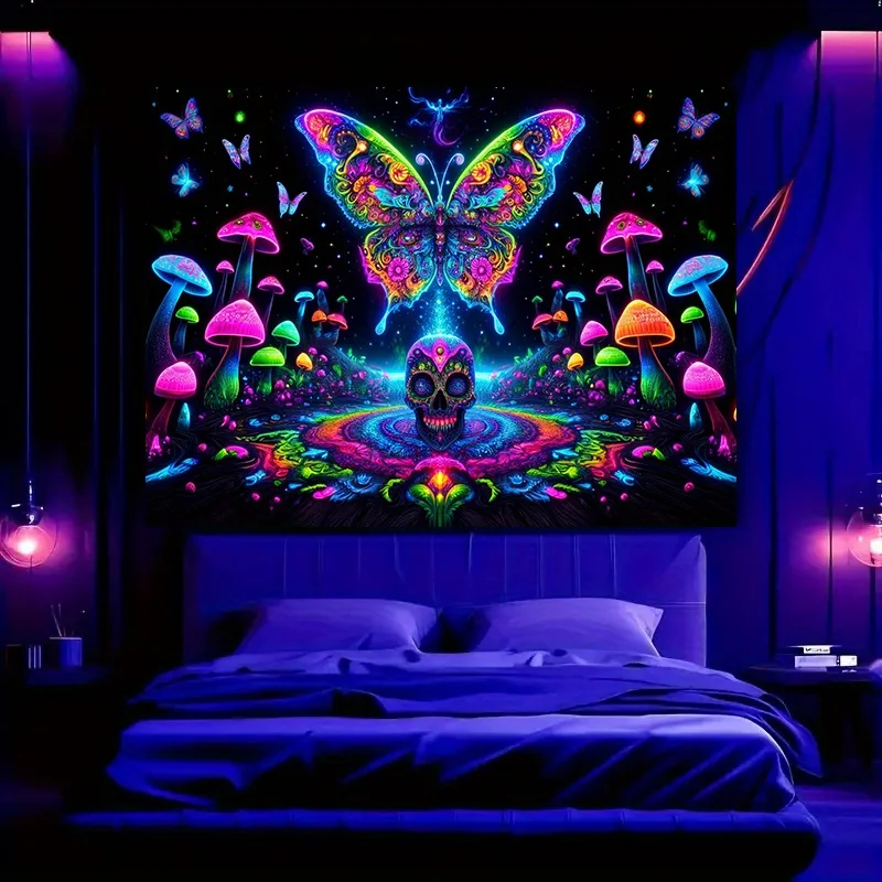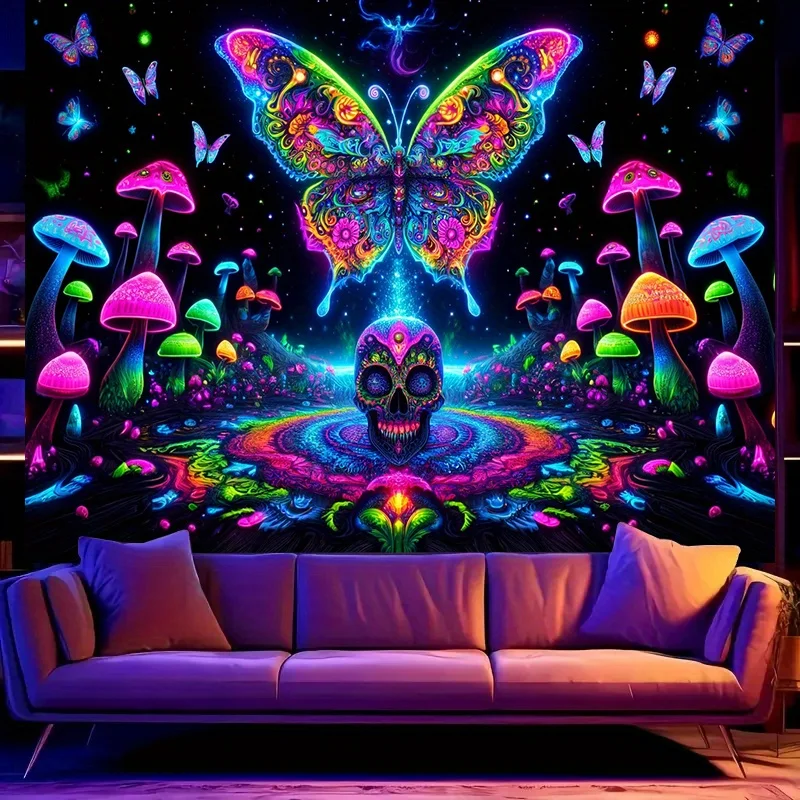 Immerse your space in glowing psychedelic energy with the VIKAMA Halloween tapestry, featuring a UV-reactive butterfly skull surrounded by a neon mushroom forest. This trippy wall hanging ignites under blacklight, making it perfect for esports rooms, rave setups, Halloween décor, and music festival vibes. Bold, surreal, and intensely colorful—designed for anyone who loves luminous artwork and cosmic atmospheres.