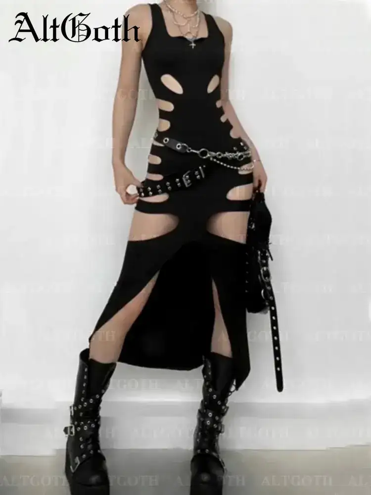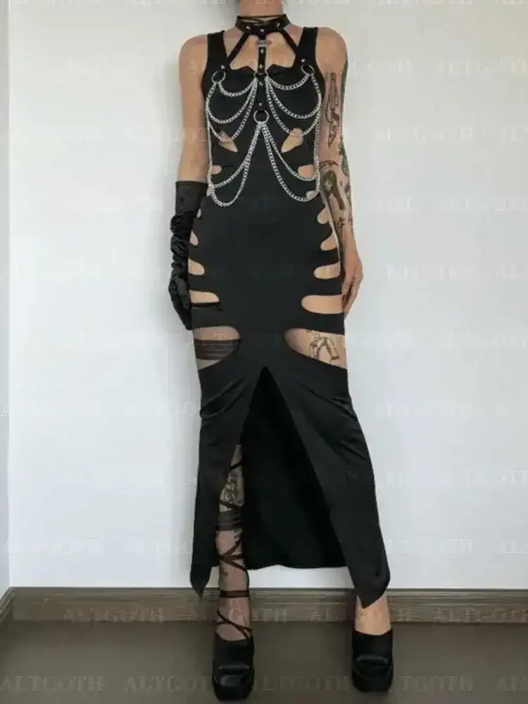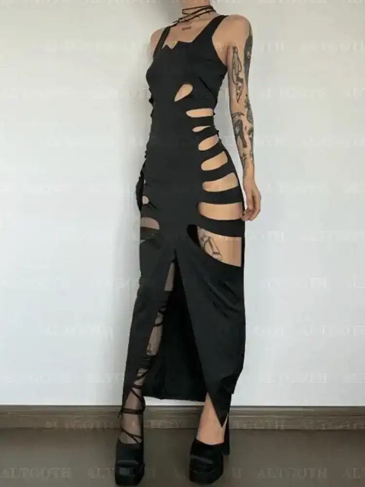 Dark Harajuku gothic bodycon dress with sexy hollow-out details and high waist cut. Perfect Y2K cyberpunk e-girl streetwear for rave nights, alt parties, dark psytrance events and techno clubs. Stretchy grunge style that hugs every curve and screams underground attitude.