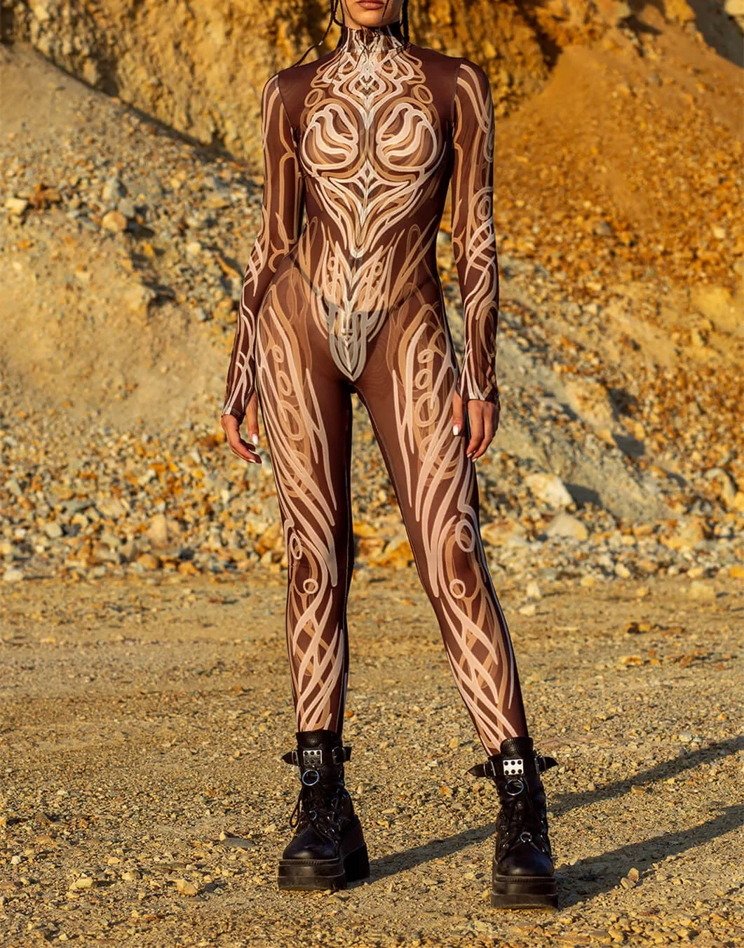 Mind-bending psychedelic line-art zentai suit that covers head to toe in trippy optical patterns. Ultra-stretchy full-body catsuit for women – perfect for Burning Man, psytrance festivals, Halloween cosplay, rave performances and all-night dance immersion. Become living art on the playa and dancefloor.
