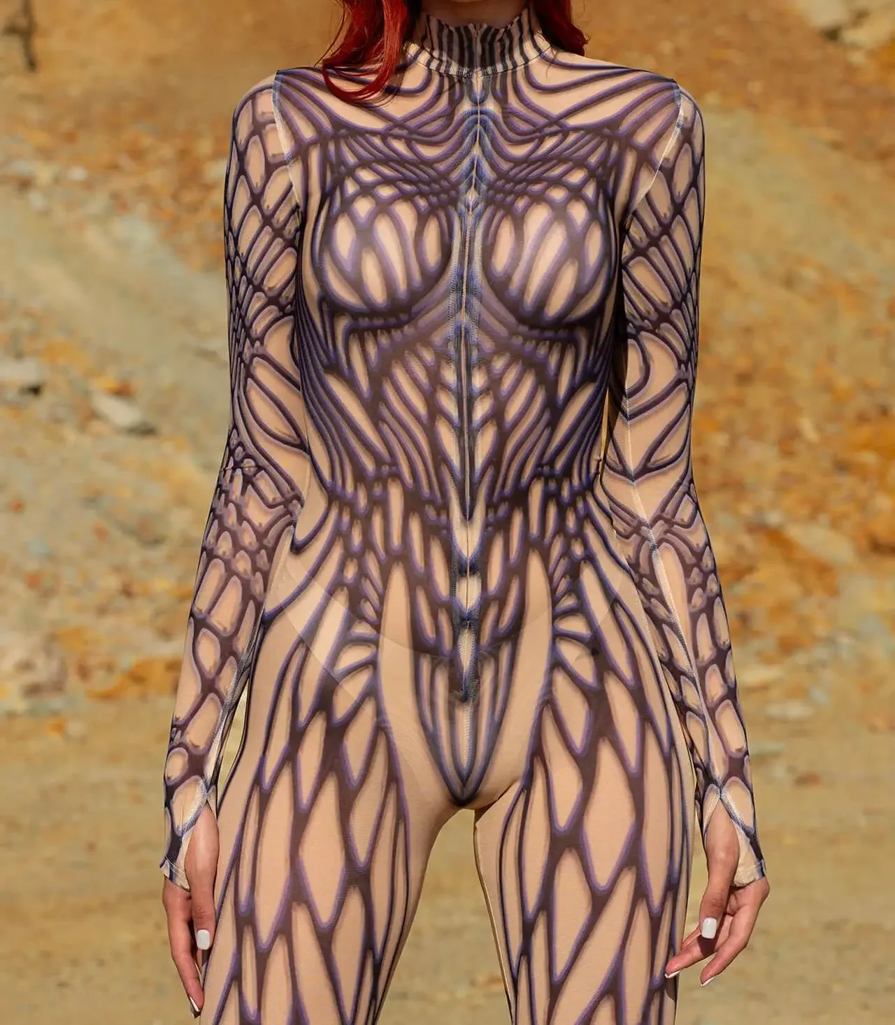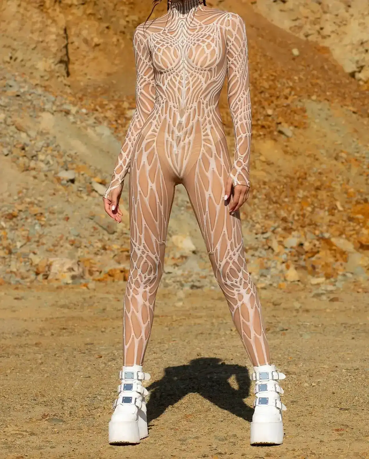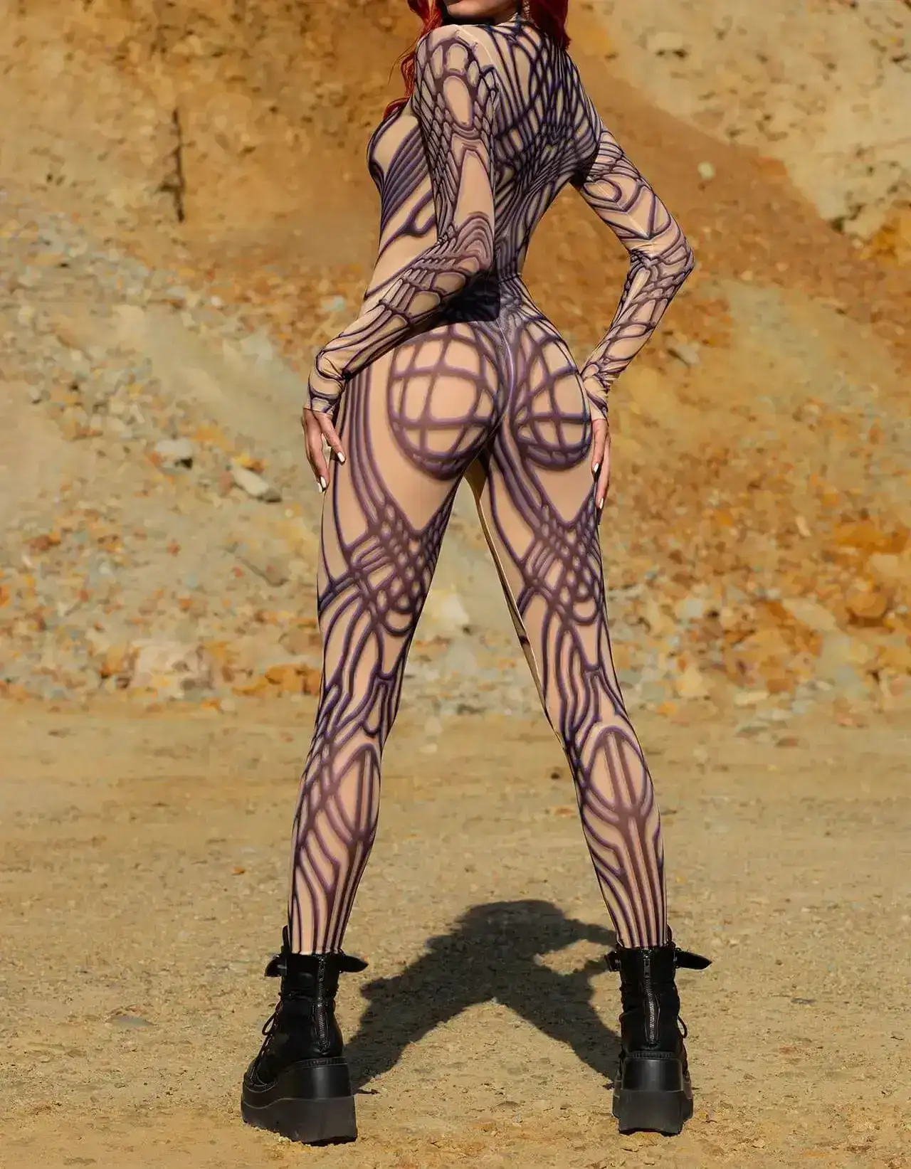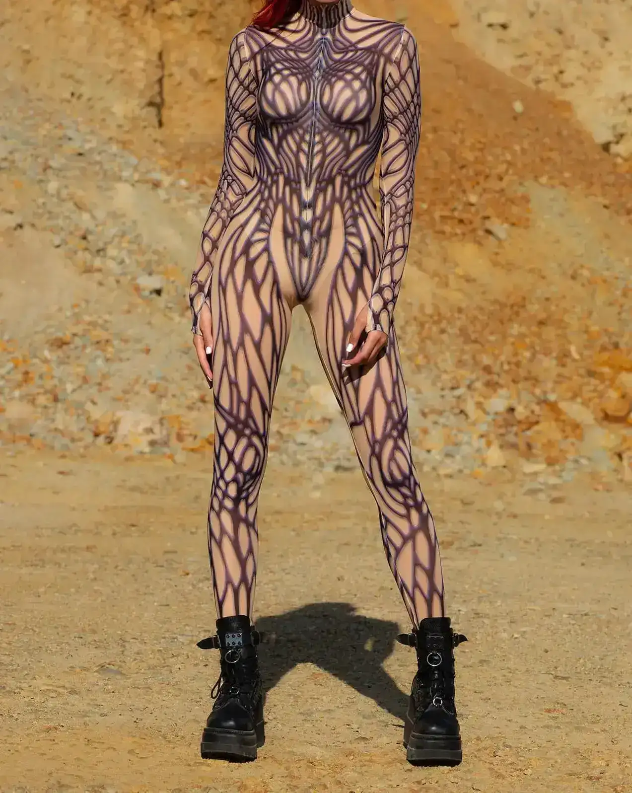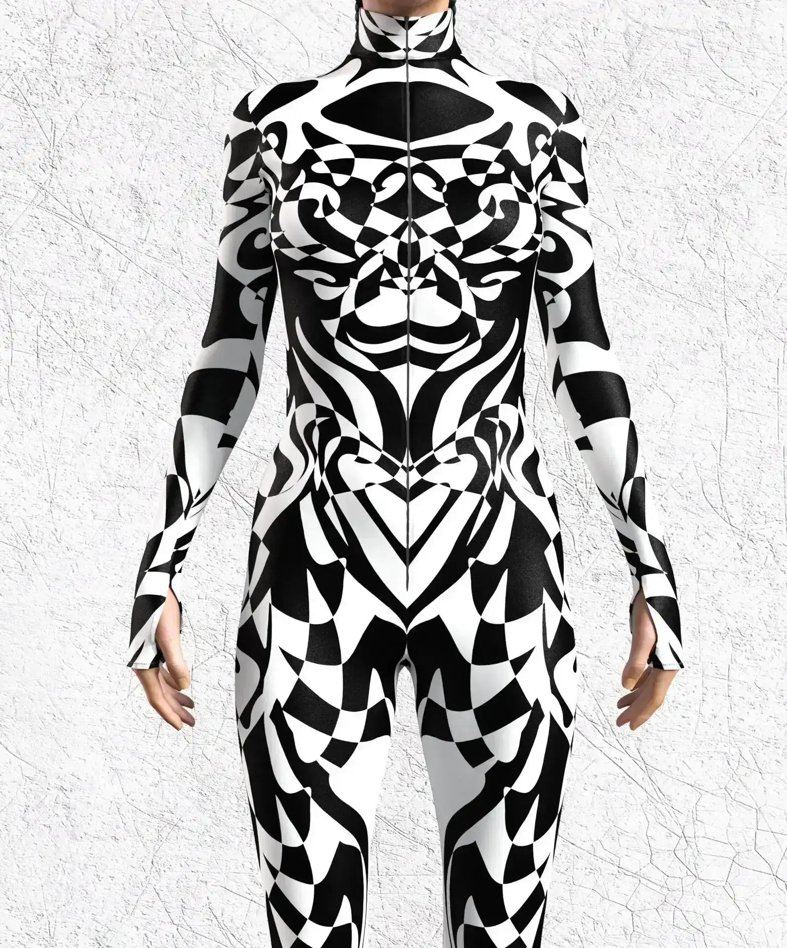 Mind-bending psychedelic line-art zentai suit that covers head to toe in trippy optical patterns. Ultra-stretchy full-body catsuit for women – perfect for Burning Man, psytrance festivals, Halloween cosplay, rave performances and all-night dance immersion. Become living art on the playa and dancefloor.