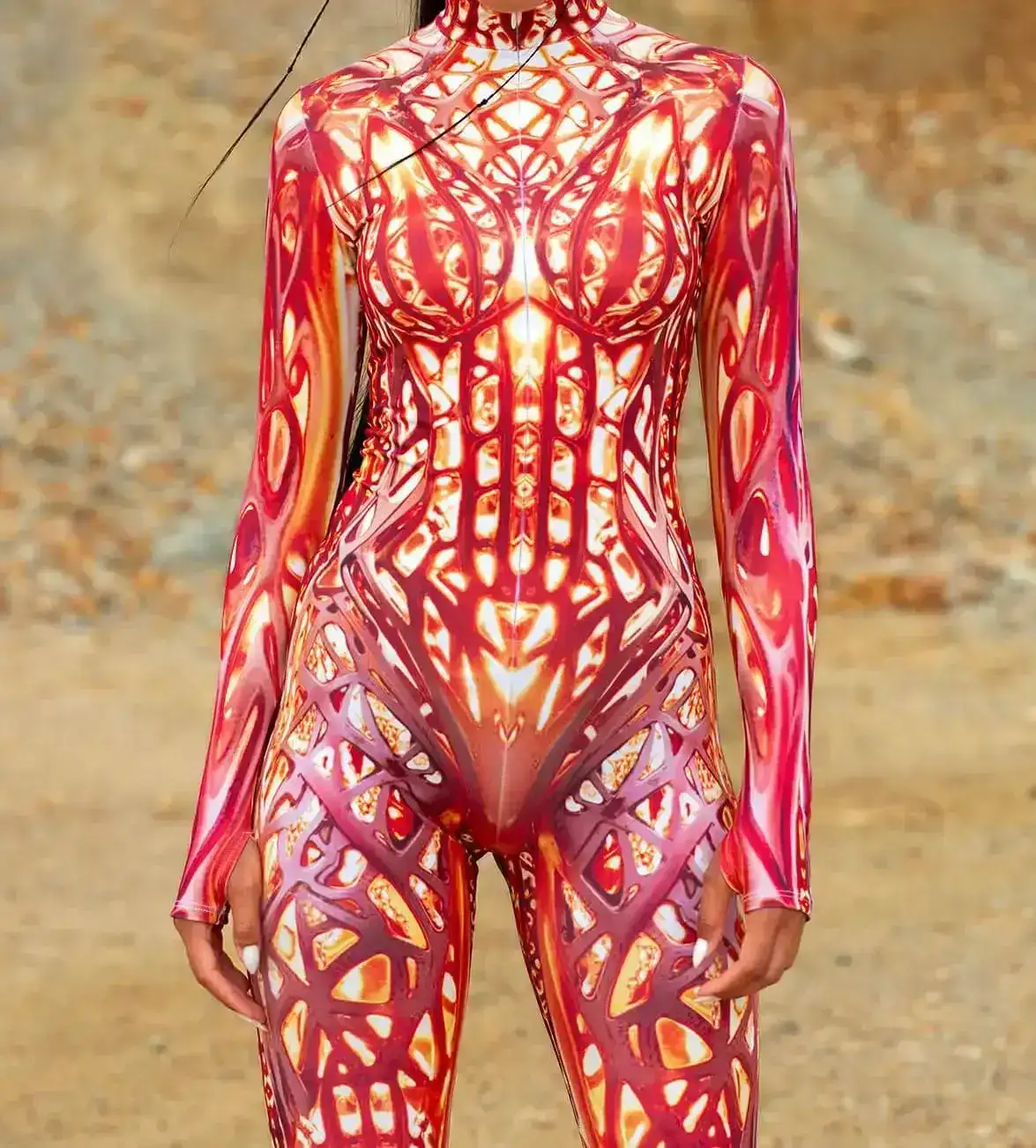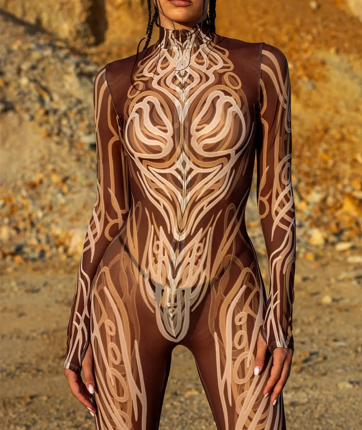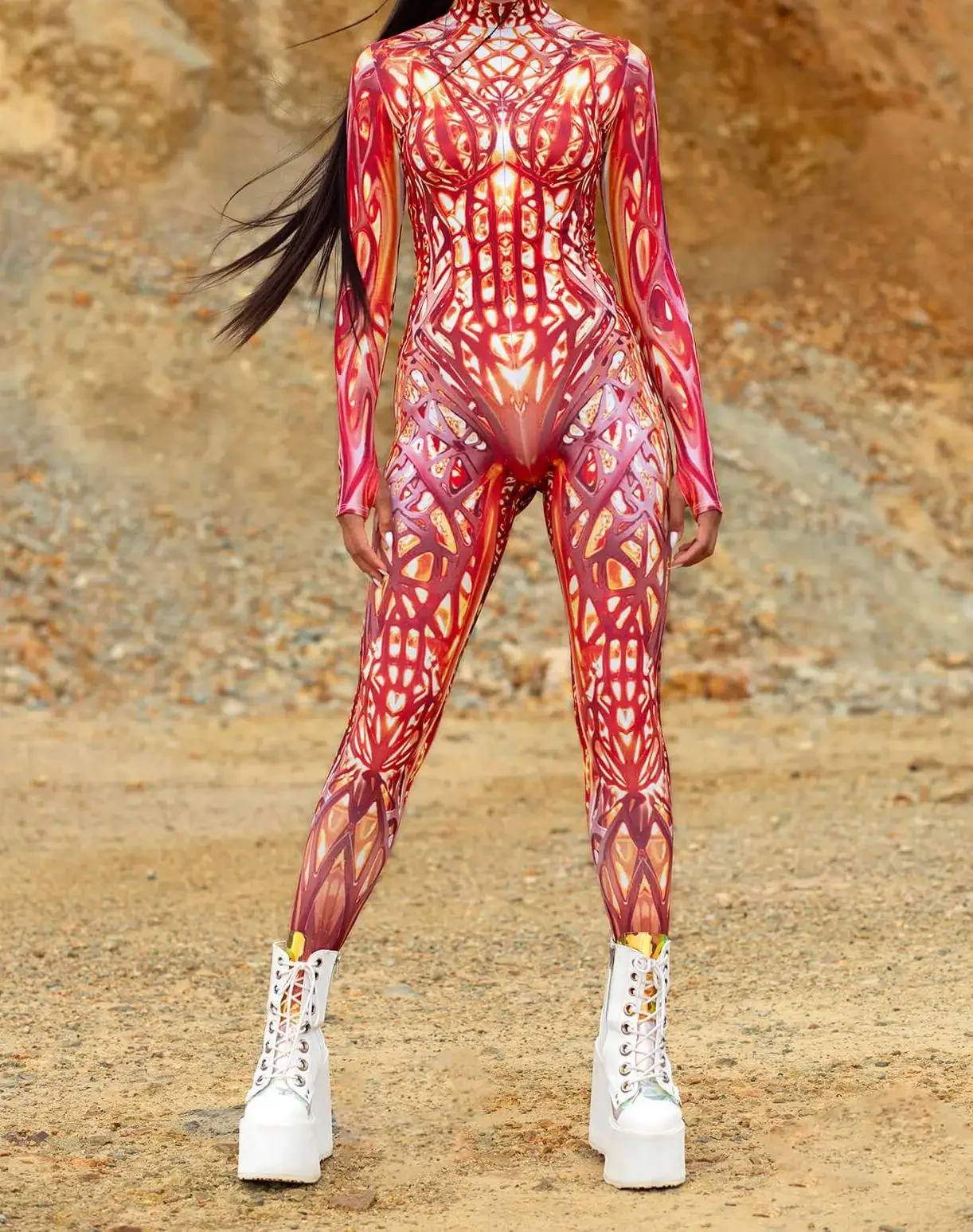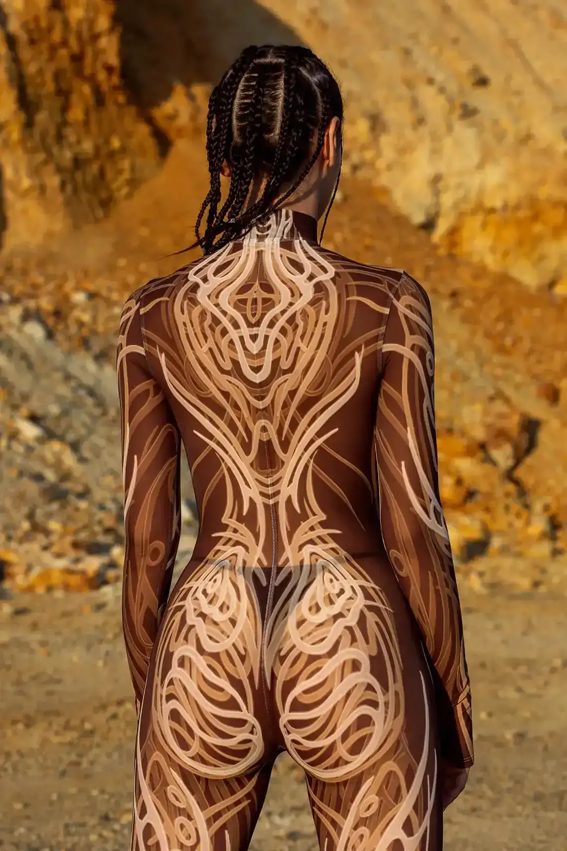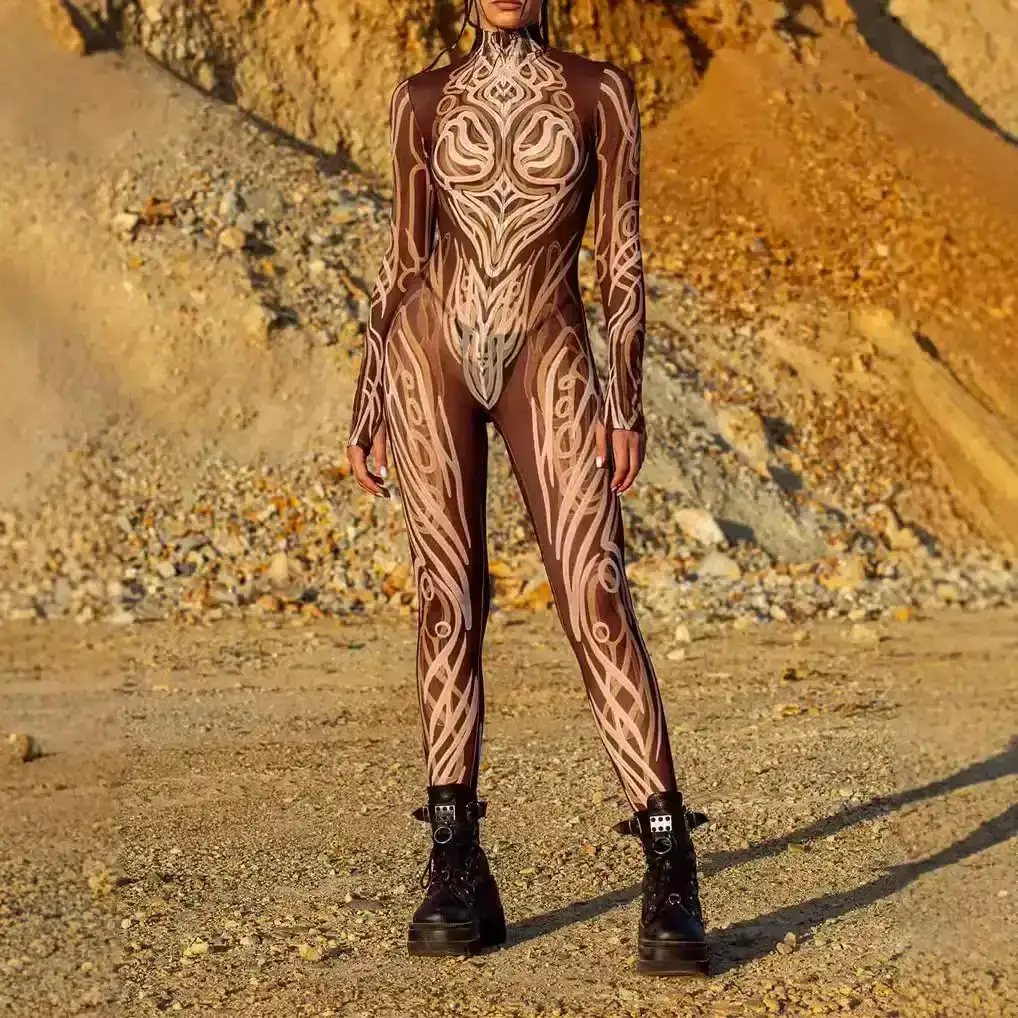 Mind-bending psychedelic line-art zentai suit that covers head to toe in trippy optical patterns. Ultra-stretchy full-body catsuit for women – perfect for Burning Man, psytrance festivals, Halloween cosplay, rave performances and all-night dance immersion. Become living art on the playa and dancefloor.