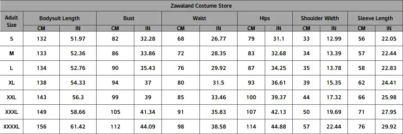 | Adult Size | Bodysuit Length | Bust | Waist | Hips | Shoulder Width | Sleeve Length | ||||||
