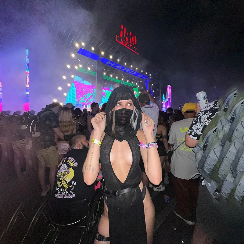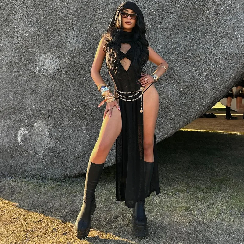 Seductive dark gothic hooded dress with sheer mesh panels, daring cut-outs and thigh-high side splits. High-waist knitted bodycon fit blending Y2K cyberpunk and coquette vibes – perfect for underground raves, psytrance nights, dark festival looks and late-night techno rituals. Mysterious, sexy and unapologetically bold.