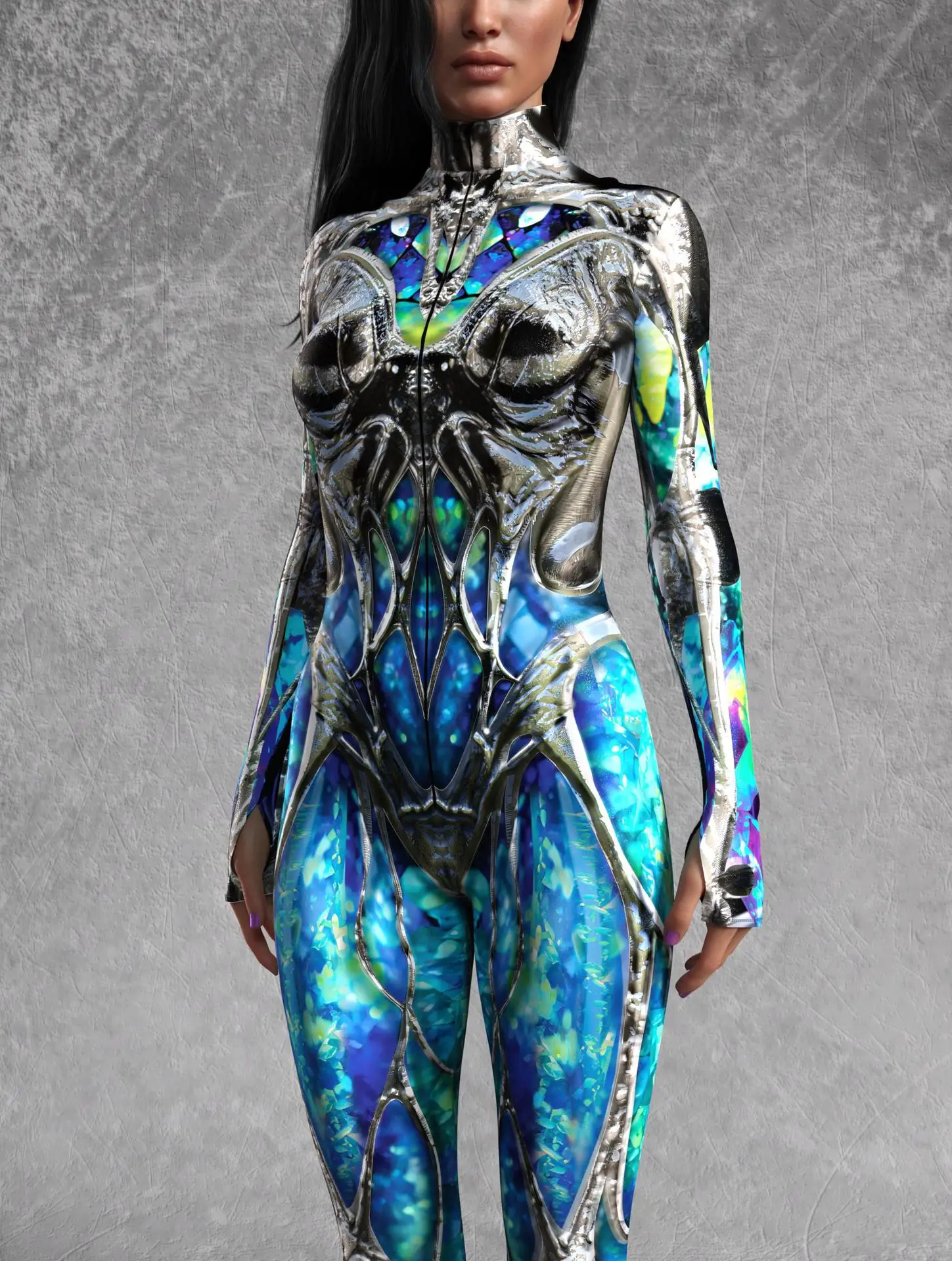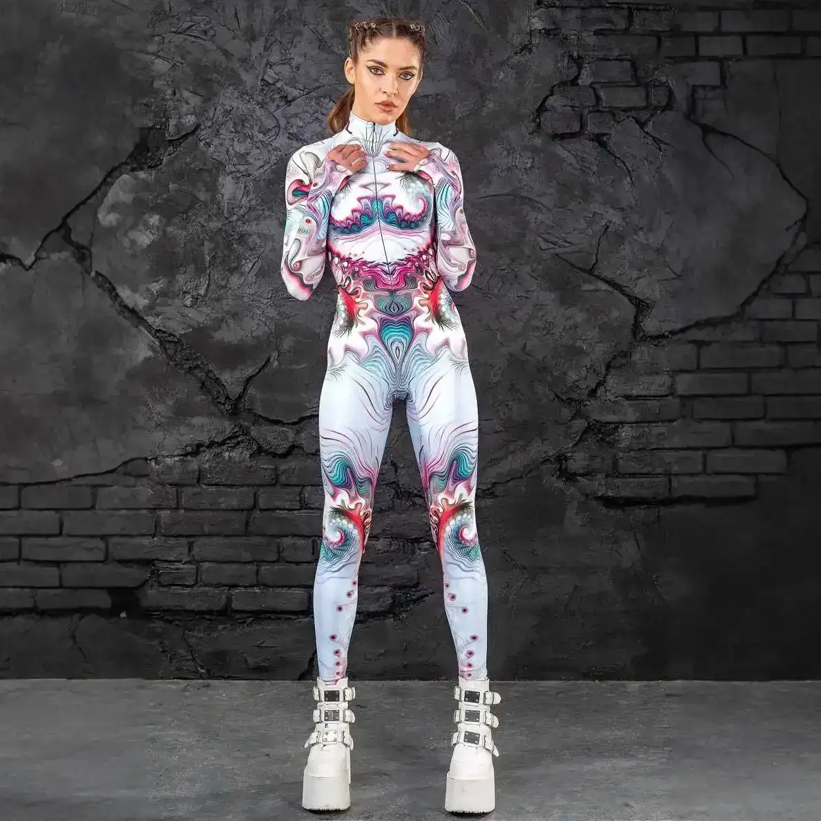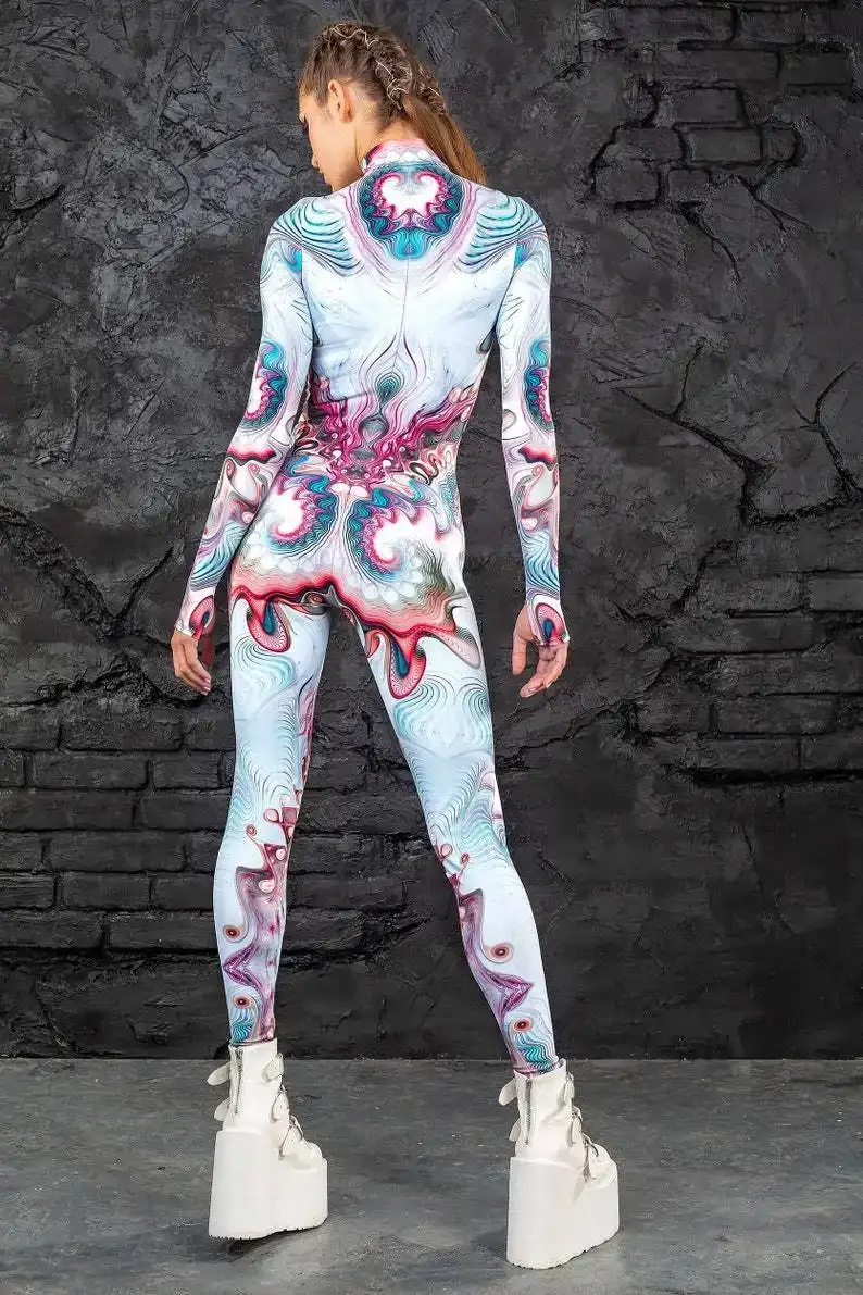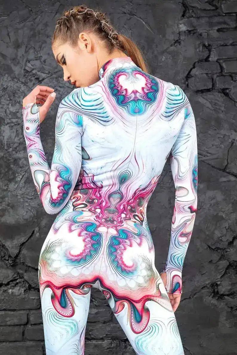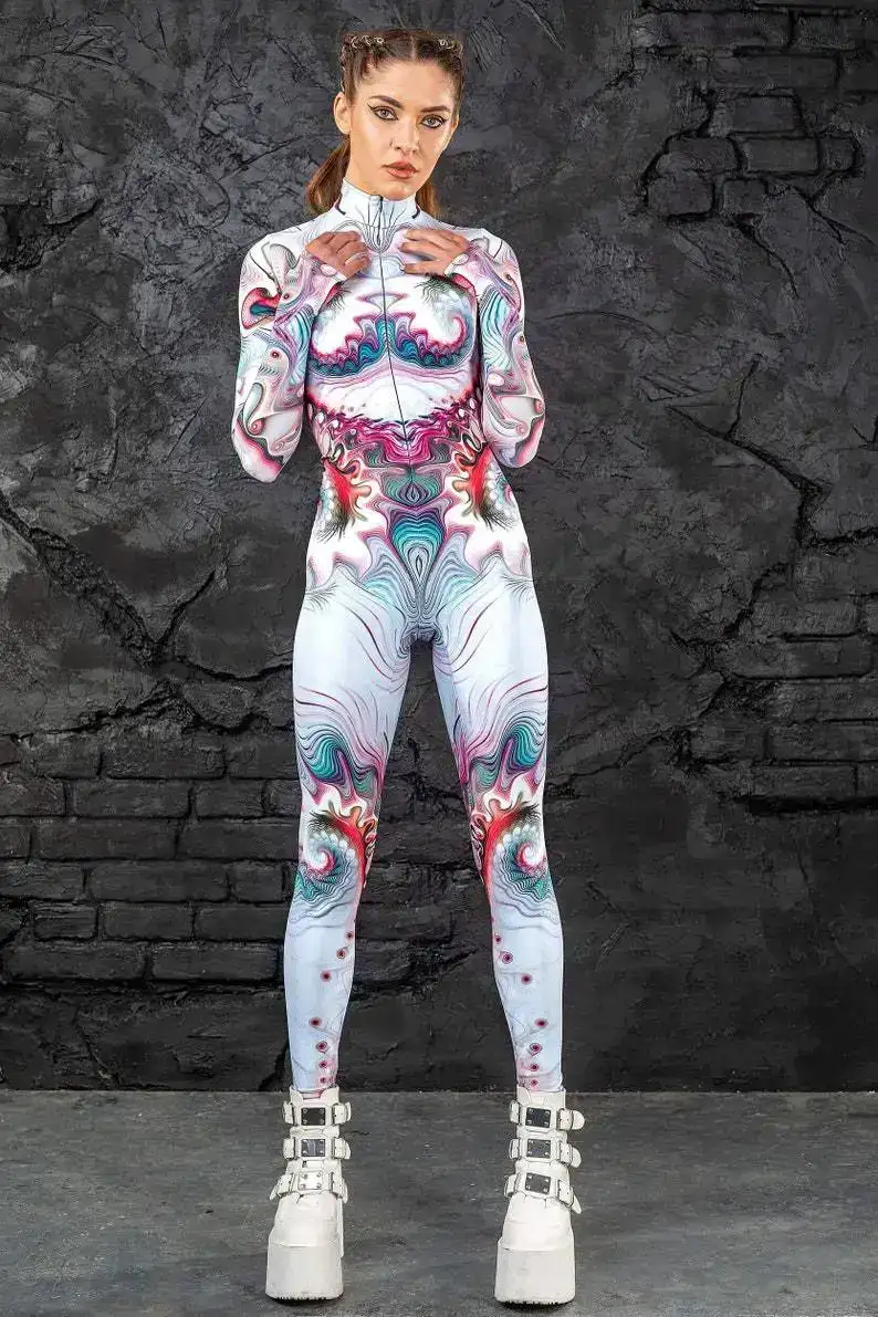Vibrant multicolor psychedelic zentai suit that covers head to toe in wild gothic patterns. Ultra-stretchy second-skin fit – perfect for rave parties, Halloween morphsuit looks, psytrance festivals, techno events and all-night dancefloor immersion. Become a living kaleidoscope under the blacklights.