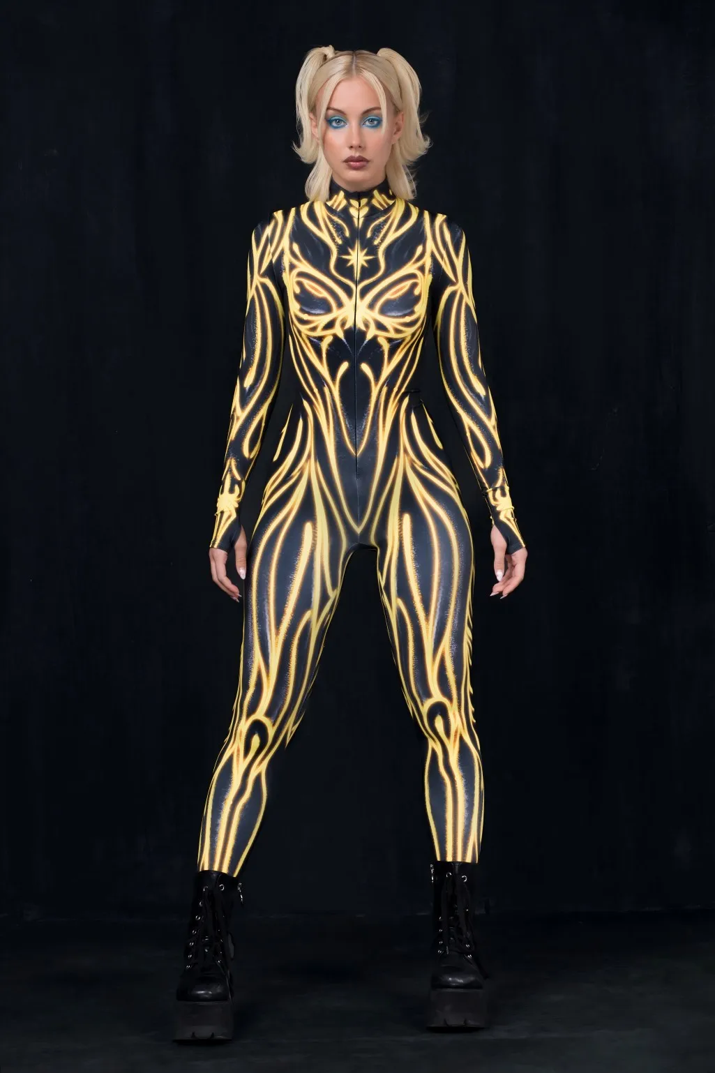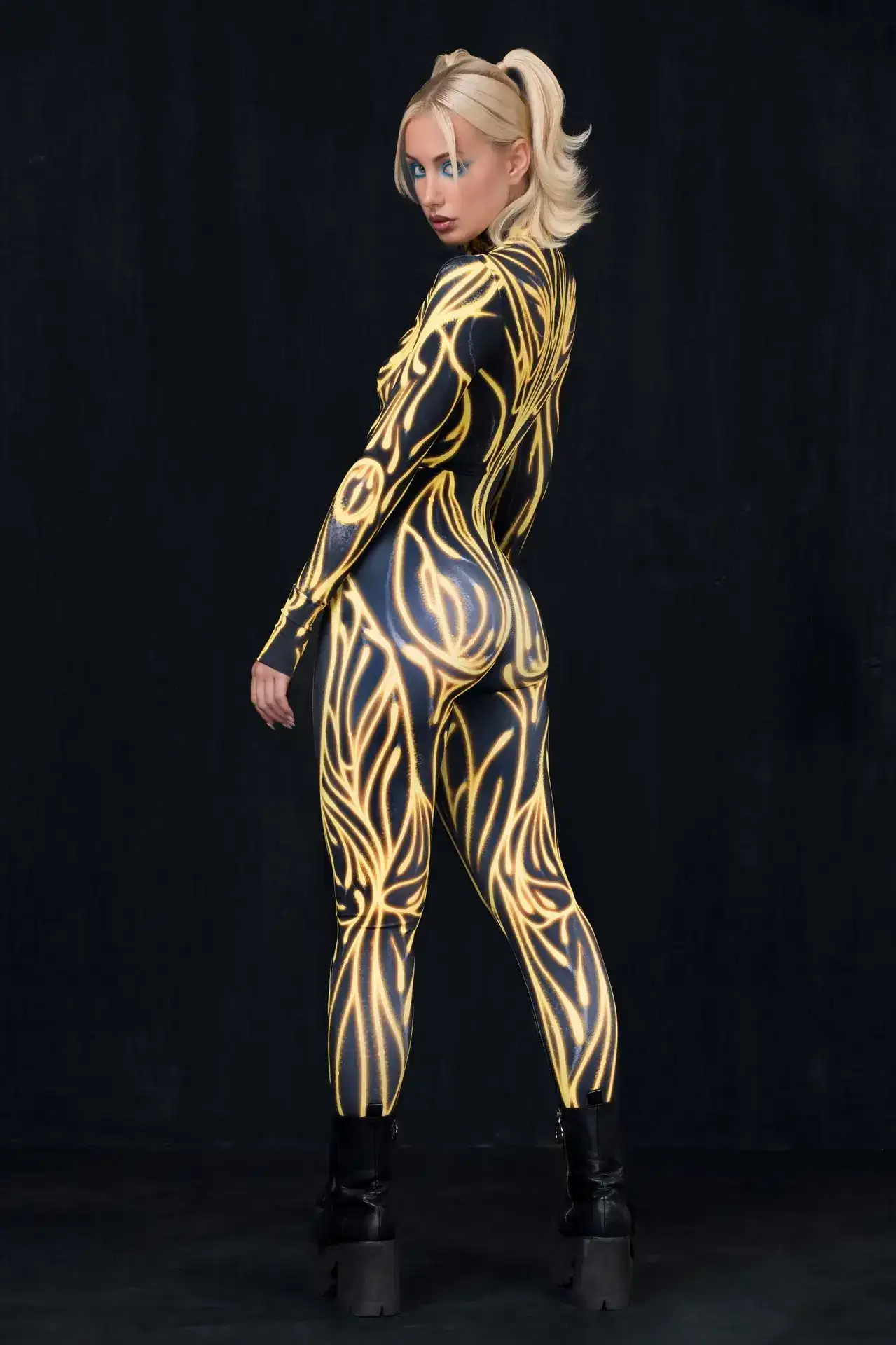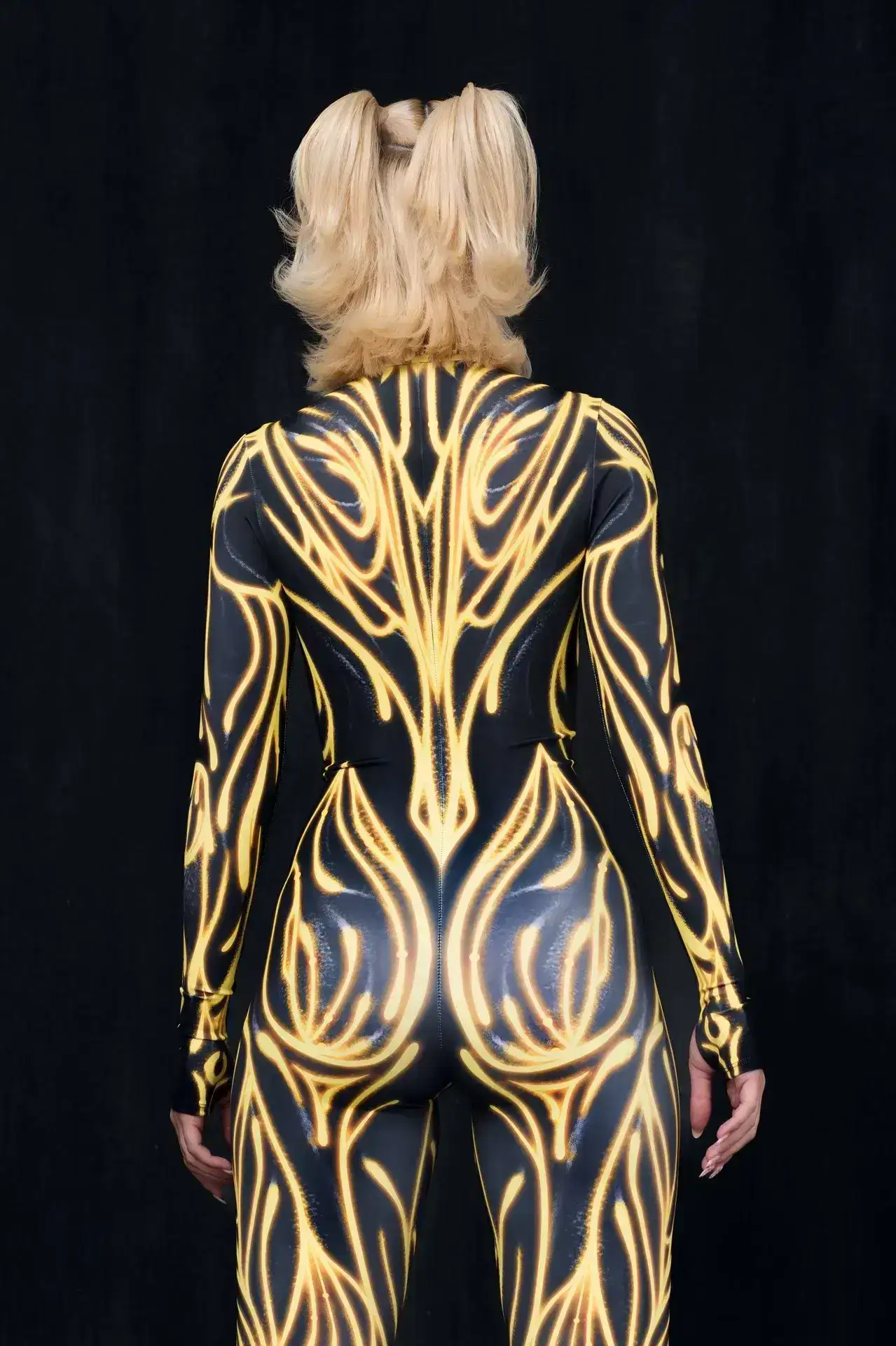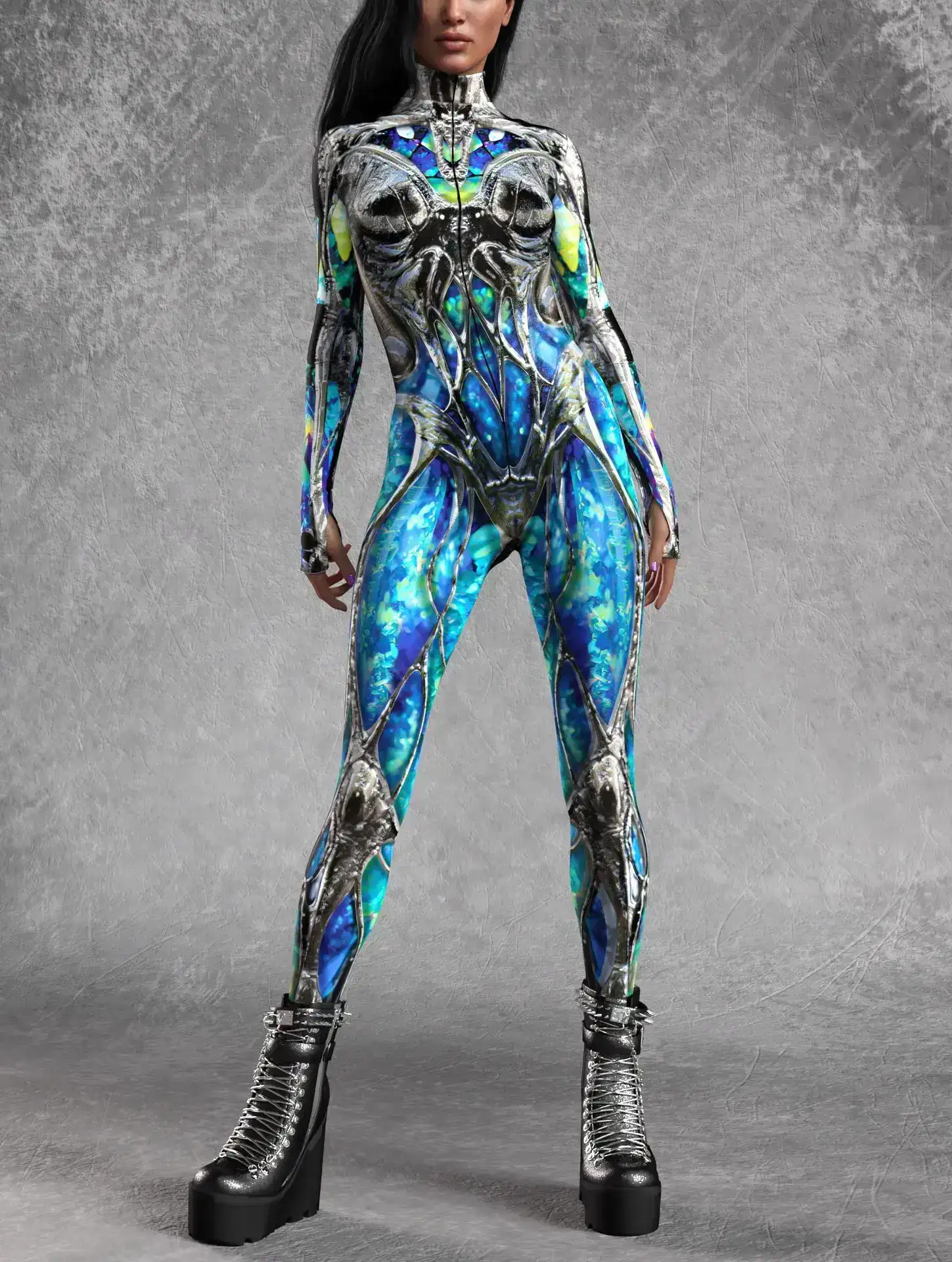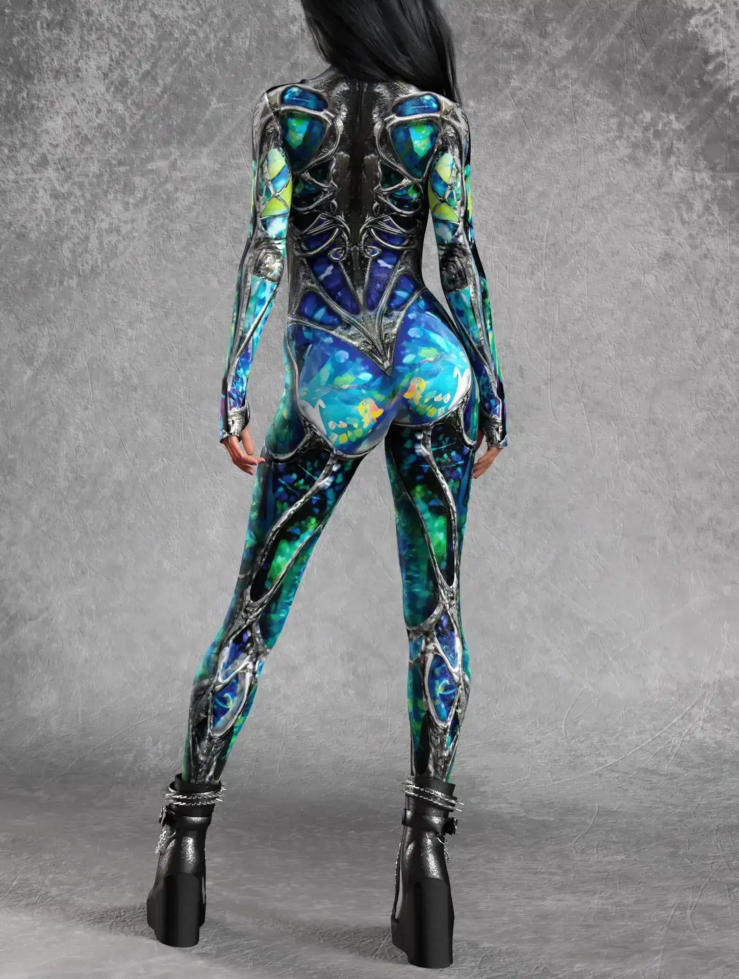 Vibrant multicolor psychedelic zentai suit that covers head to toe in wild gothic patterns. Ultra-stretchy second-skin fit – perfect for rave parties, Halloween morphsuit looks, psytrance festivals, techno events and all-night dancefloor immersion. Become a living kaleidoscope under the blacklights.