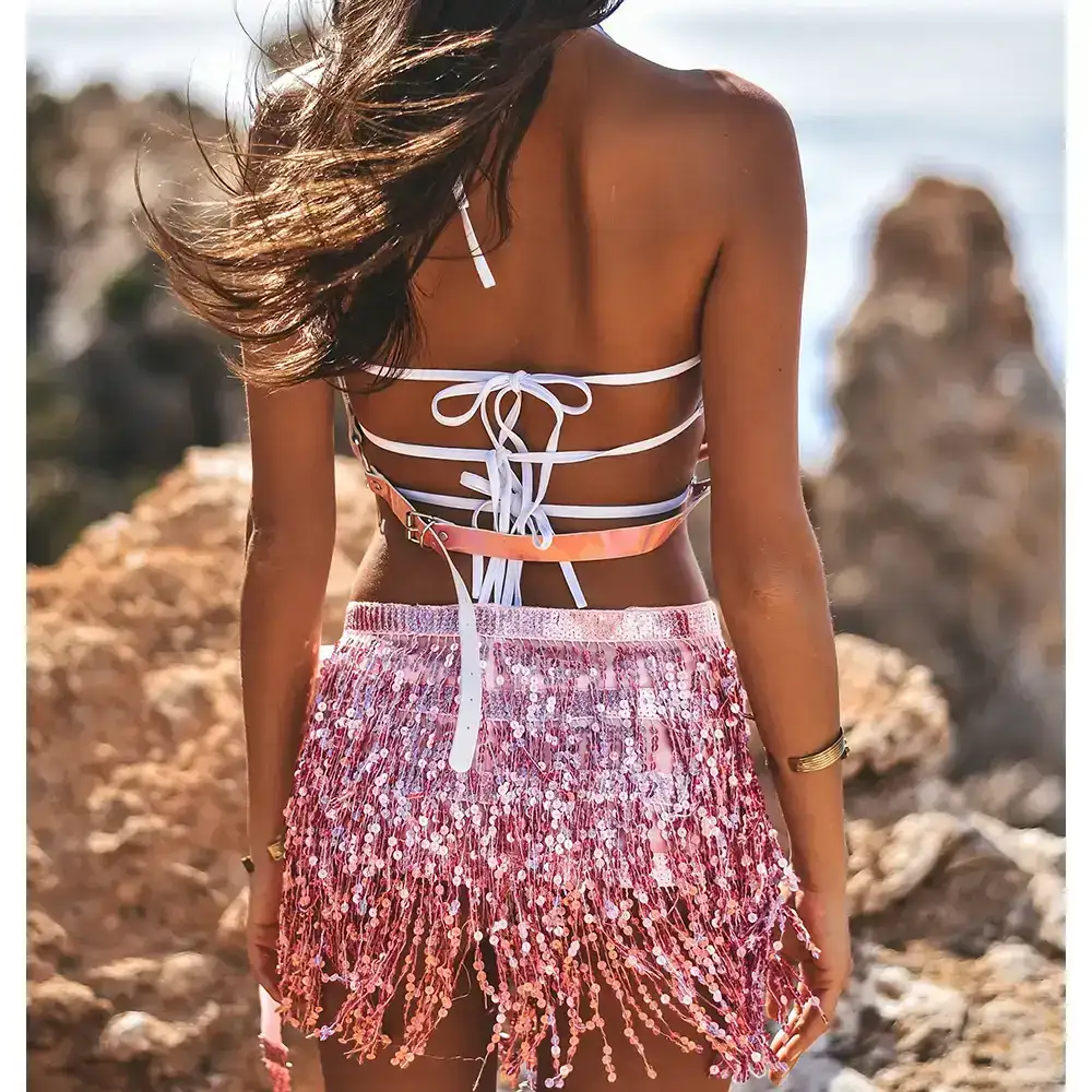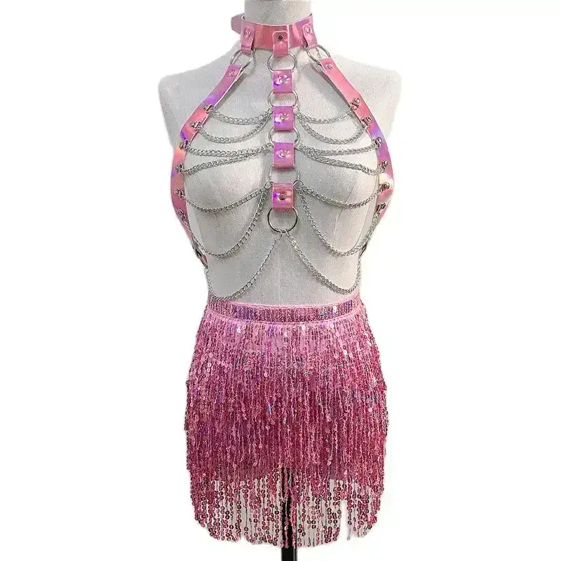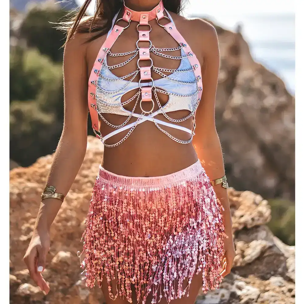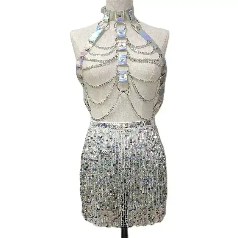 Futuristic holographic PU leather harness crop top with metal chains paired with shimmering sequin fringe mini skirt. Ultimate punk-gothic nightclub and festival set for rave parties, psytrance stages, techno events and dark dancefloor domination. Reflective, bold and dripping with underground cyber-rave energy.