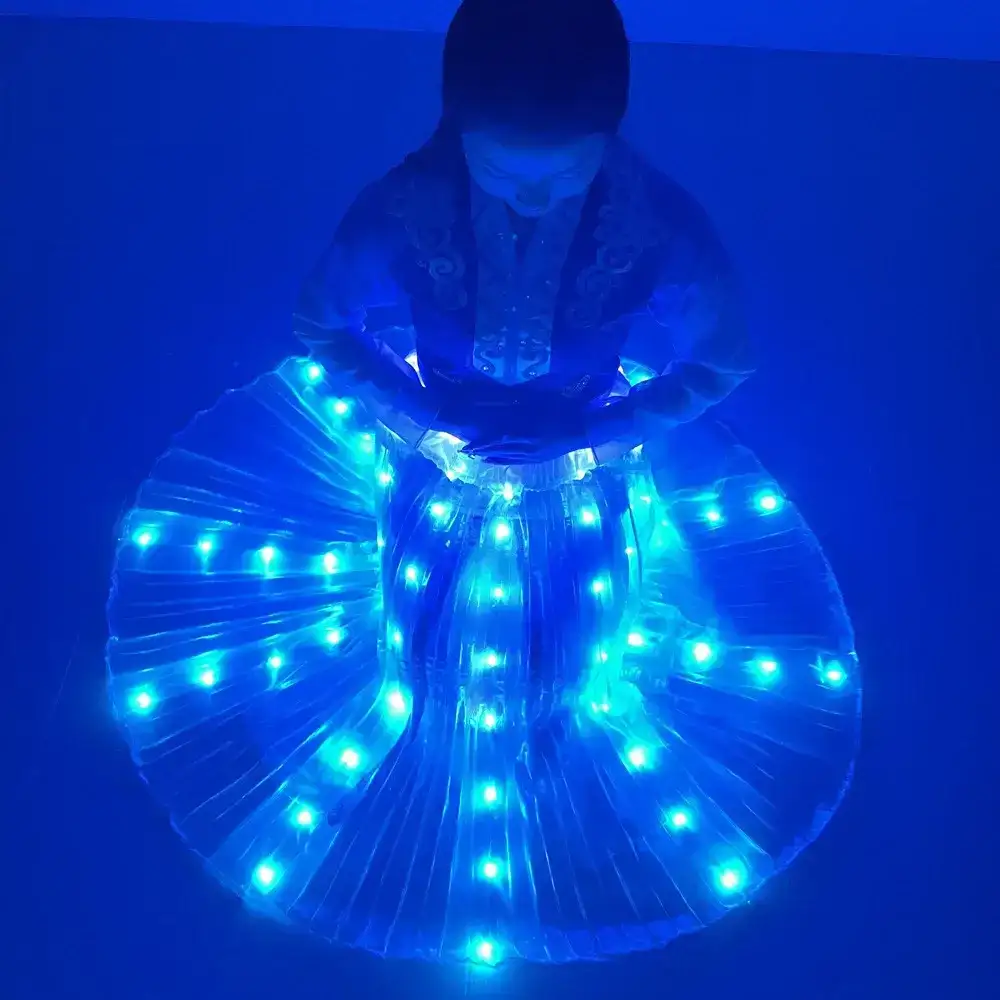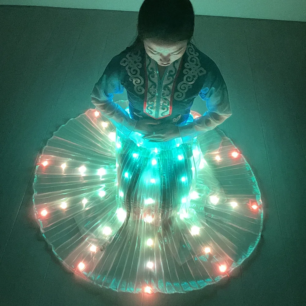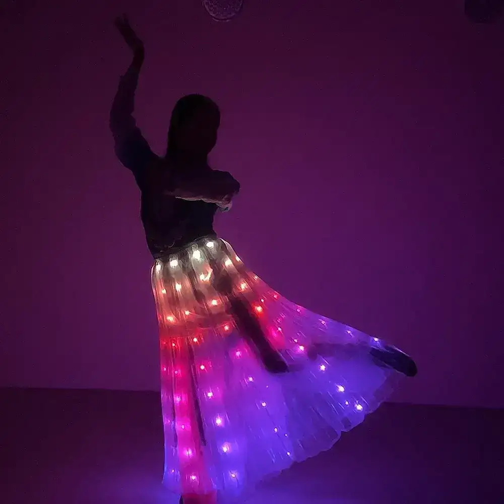 Stunning programmable LED belly dance skirt with countless glowing modes and colors. Perfect rave and festival light-up costume for women and girls – transforms every move into a in psytrance parties, carnival shows, EDM stages and midnight dance performances. Flowing, bright and pure visual magic.