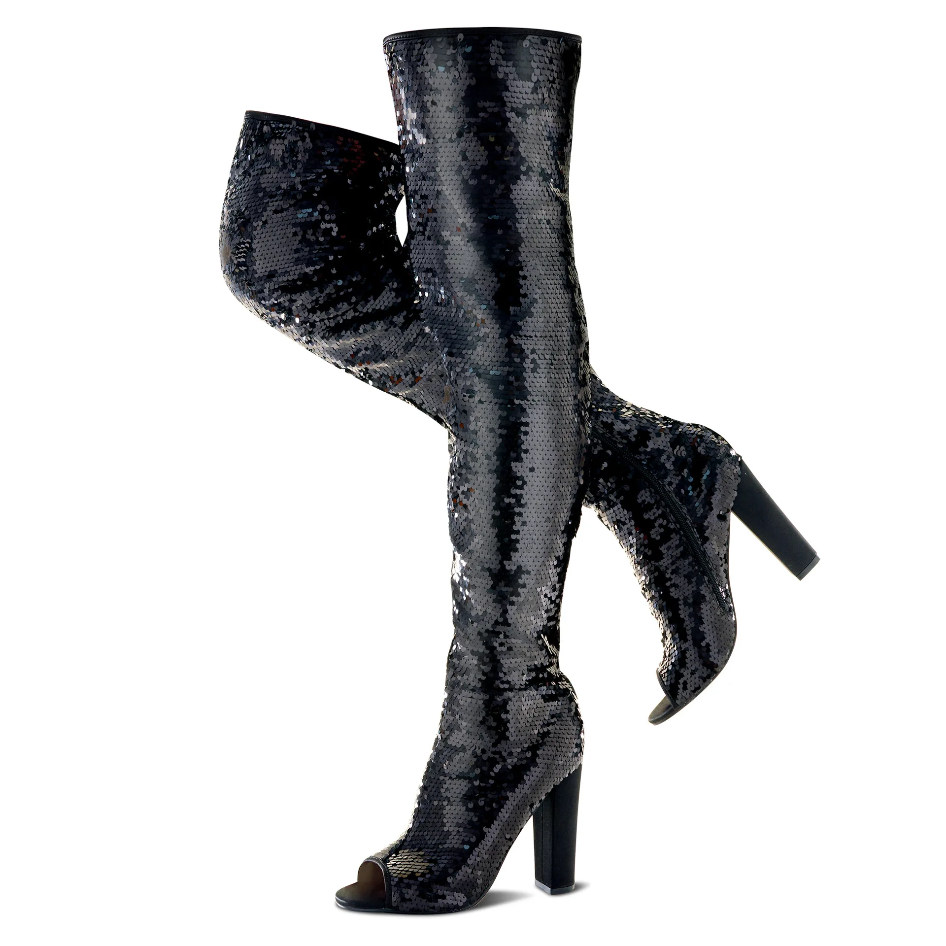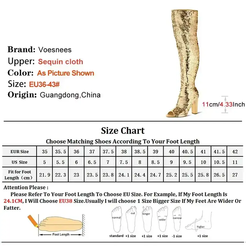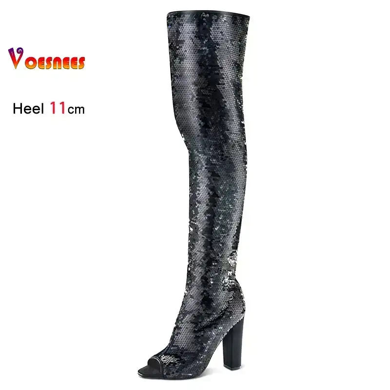 Own the dancefloor with these Sequin Thigh High Gladiator Boots, made for festivals, nightlife and high-energy party outfits. Sparkling from top to toe, these boots catch every beam of light — stage lights, lasers, strobes — making your legs the center of attention. The bold 11cm high heel adds dramatic height, while the peep-toe gladiator design gives a fierce, confident edge perfect for clubbing or performance wear.