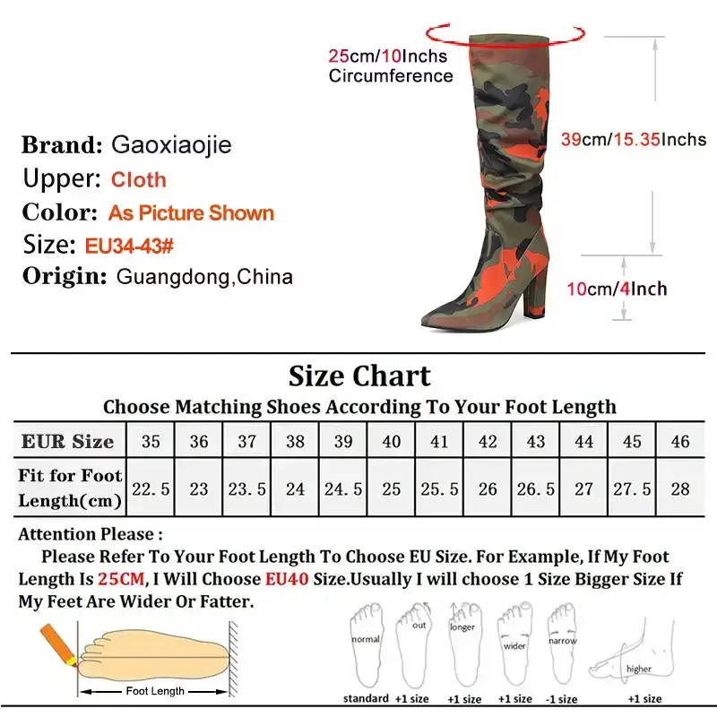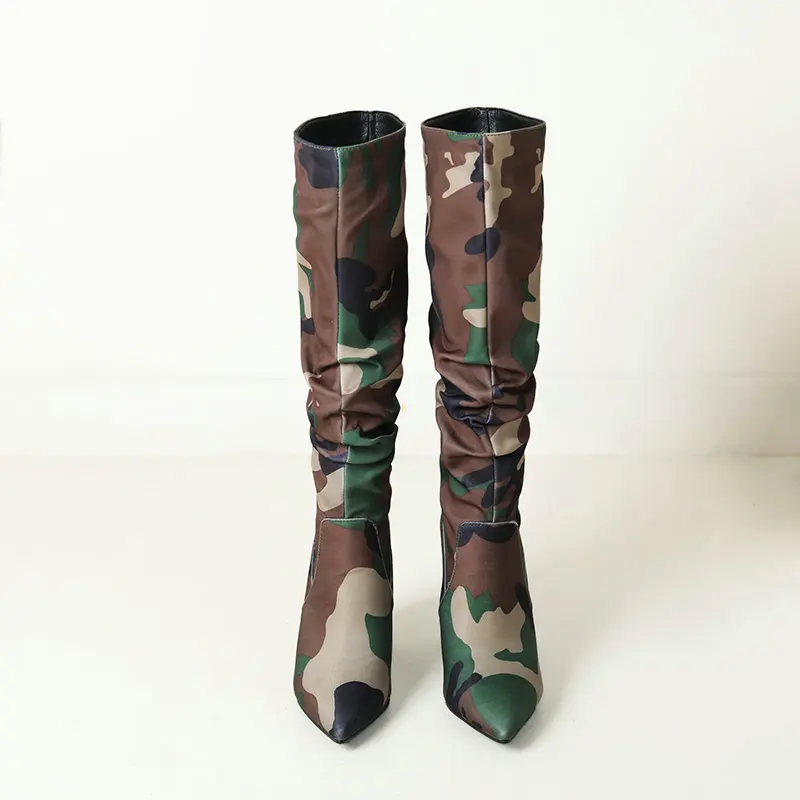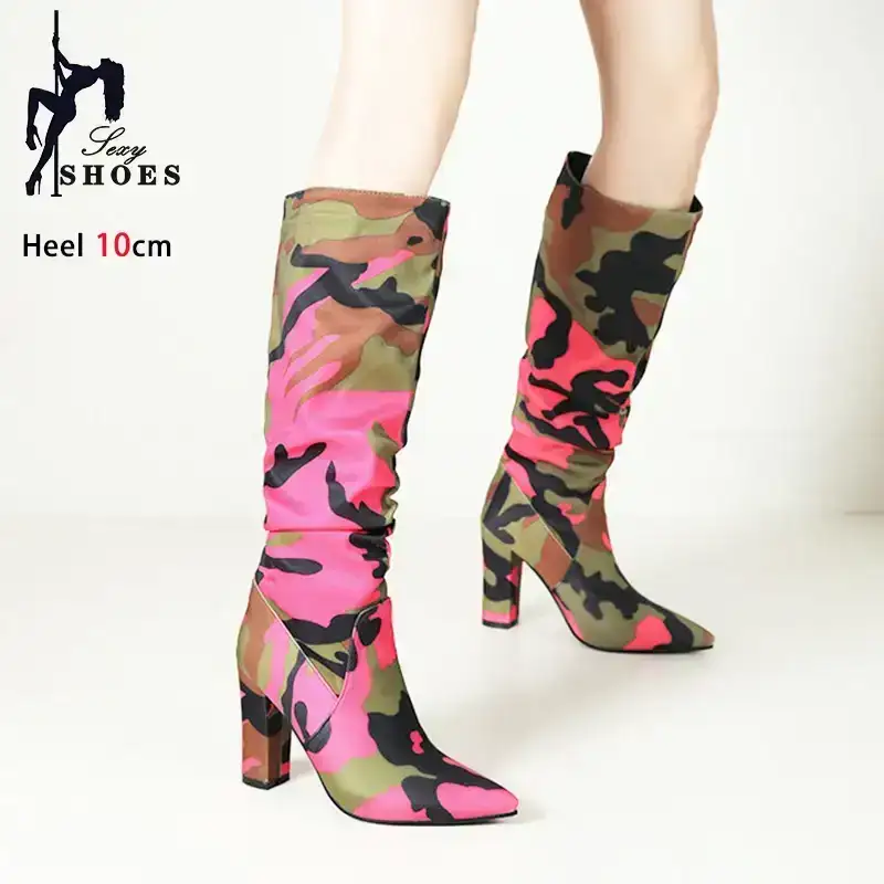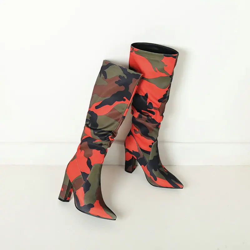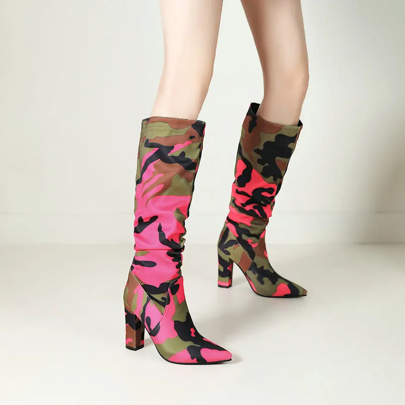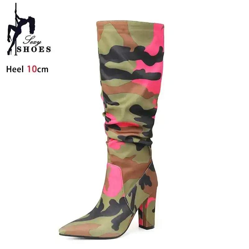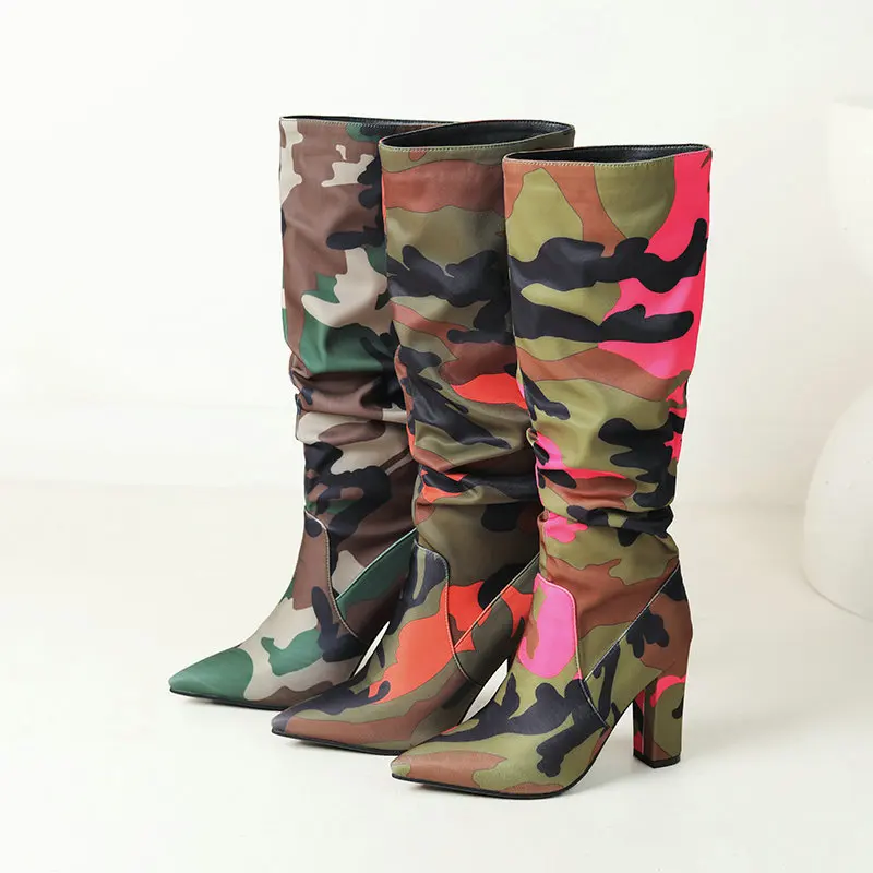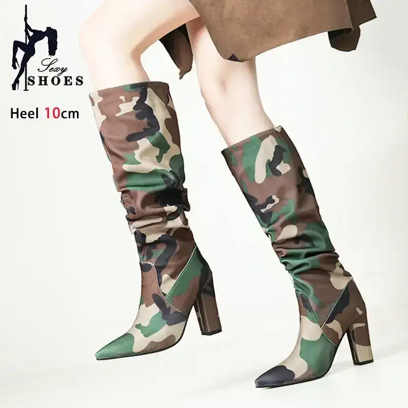 Elevate your festival and streetwear style with these Chunky Camouflage Knee-High Boots, designed for women who love bold fashion and standout silhouettes. Featuring a sleek pointed toe, pleated upper design and a thick, stable heel, these boots mix high-fashion energy with rugged outdoor attitude.
