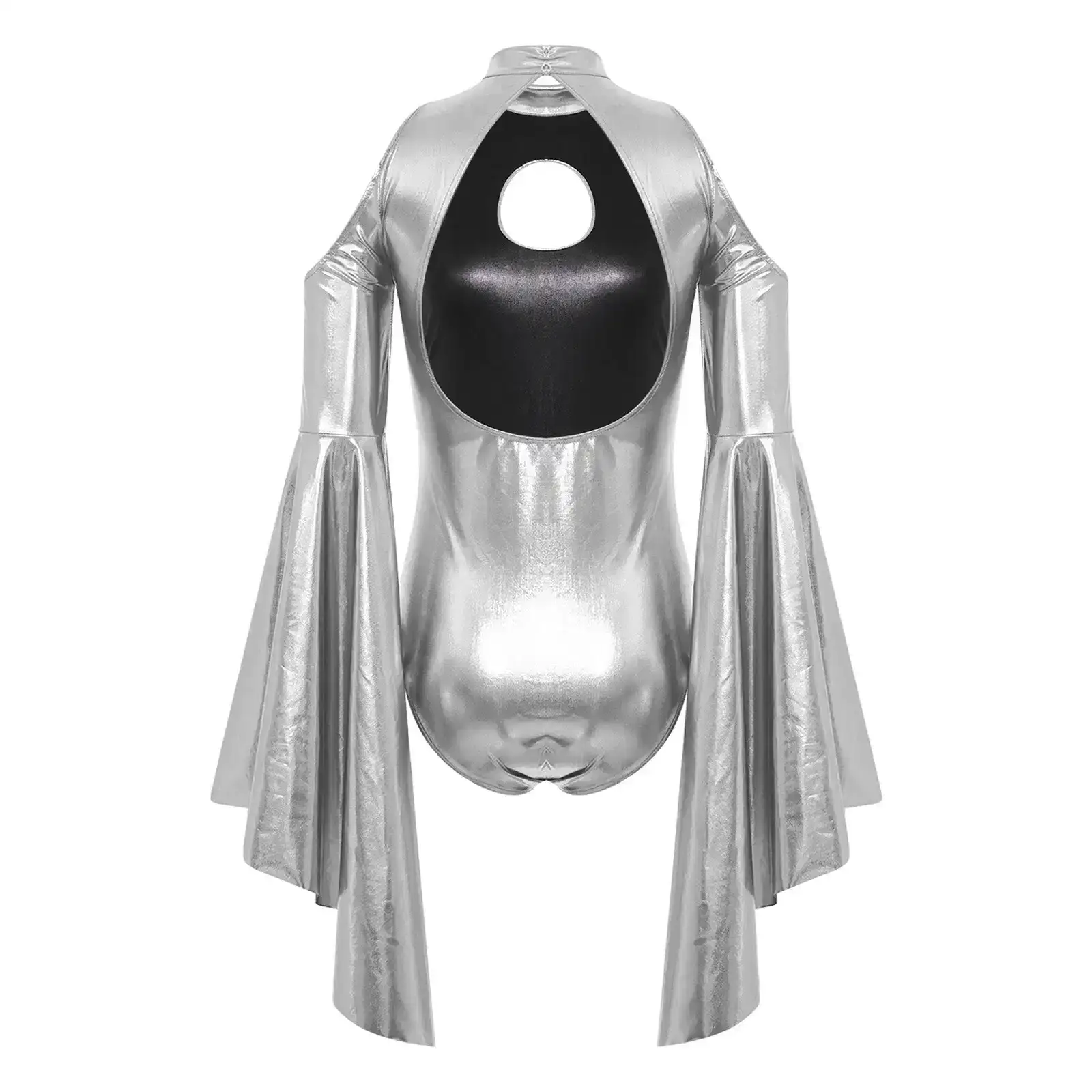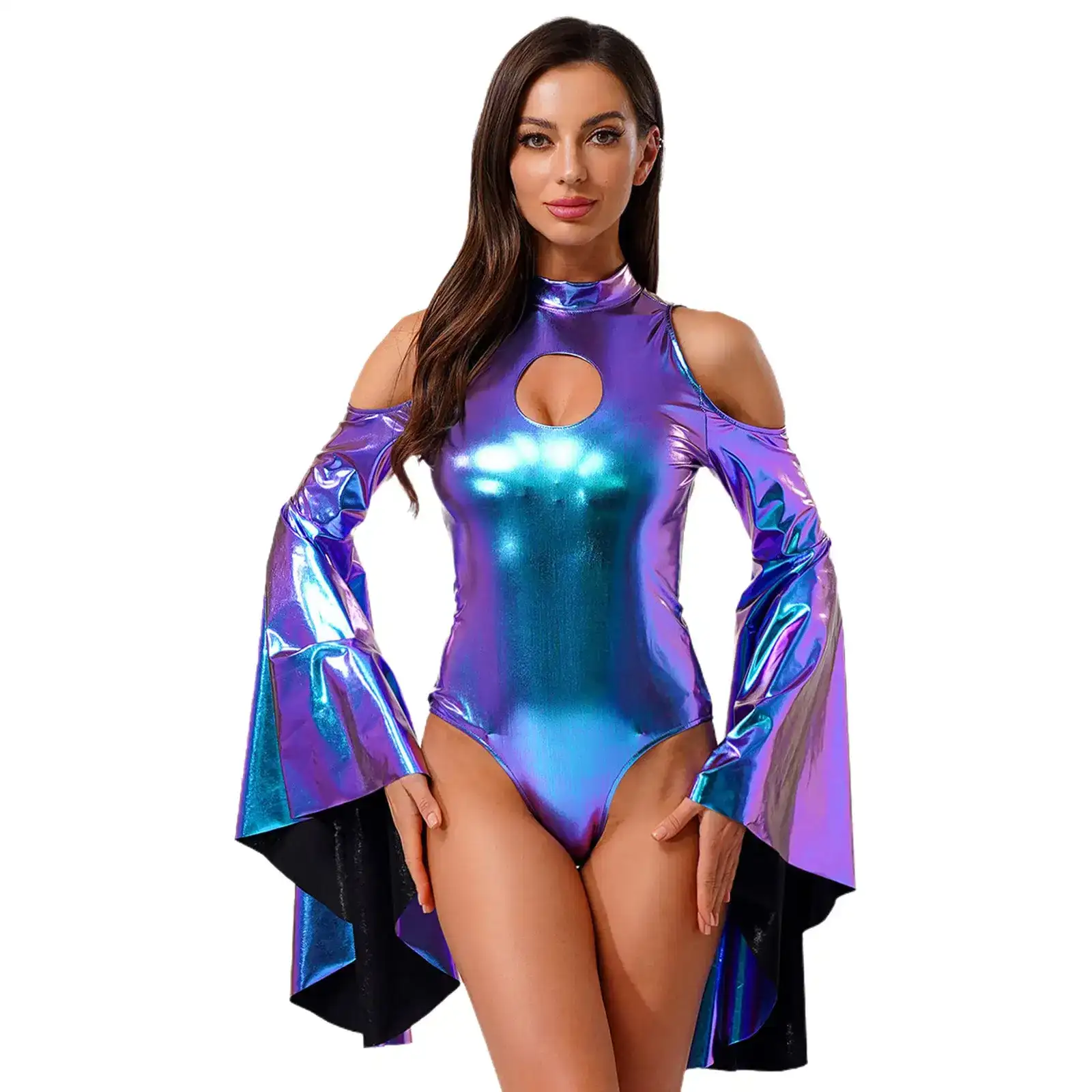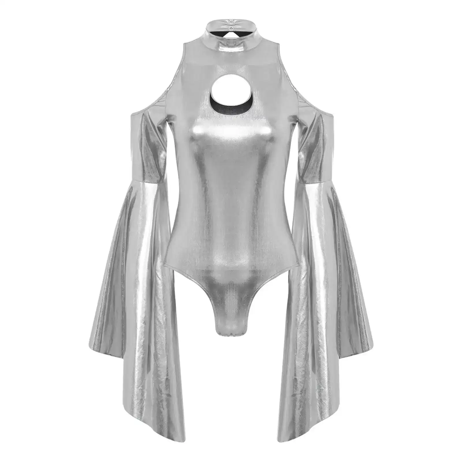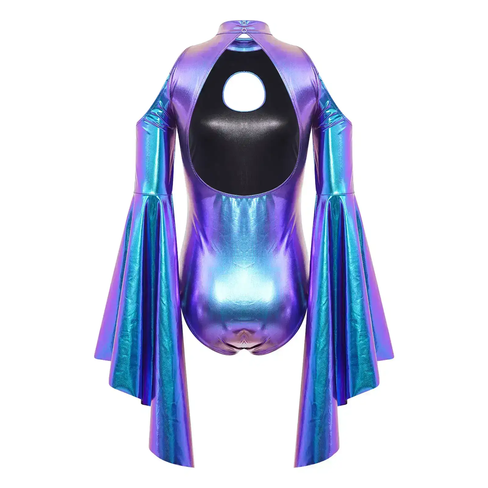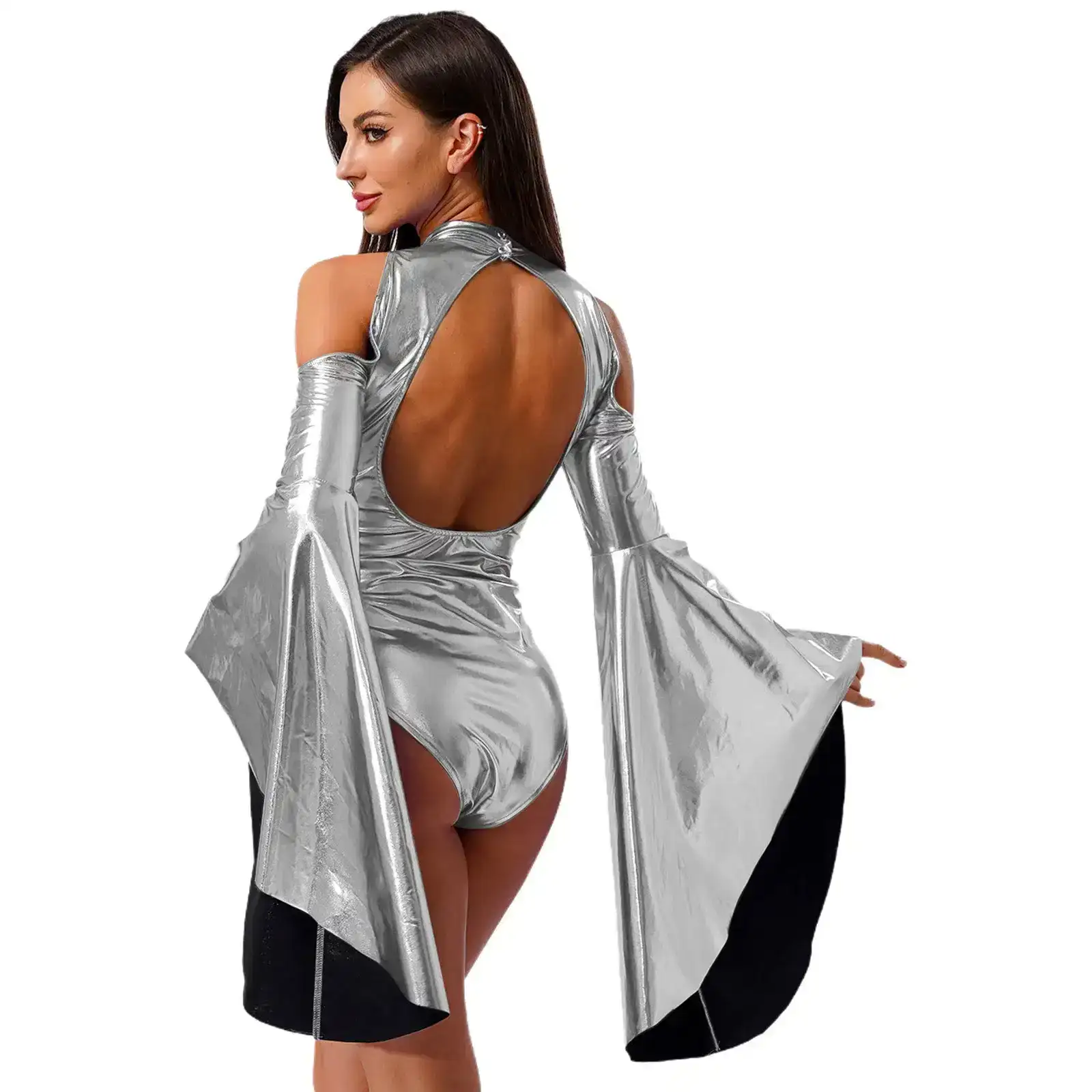Liquid-metal shiny bodysuit with dramatic flared sleeves and ultra-high-cut legs. Perfect pole dance, rave, and disco clubwear for women who own the stage at psytrance parties, techno events, and late-night festivals. Stretchy, reflective, and built to move under every strobe and blacklight.