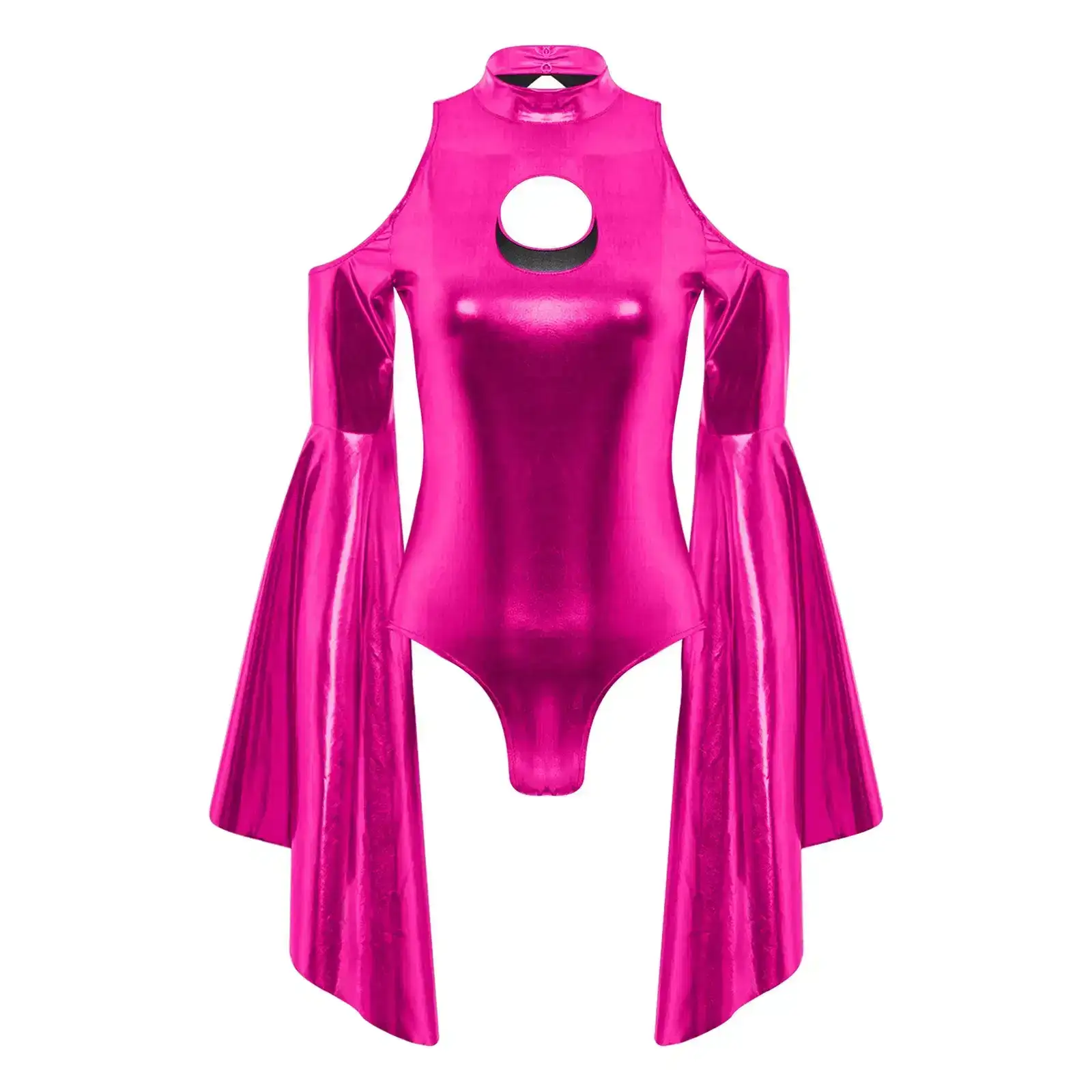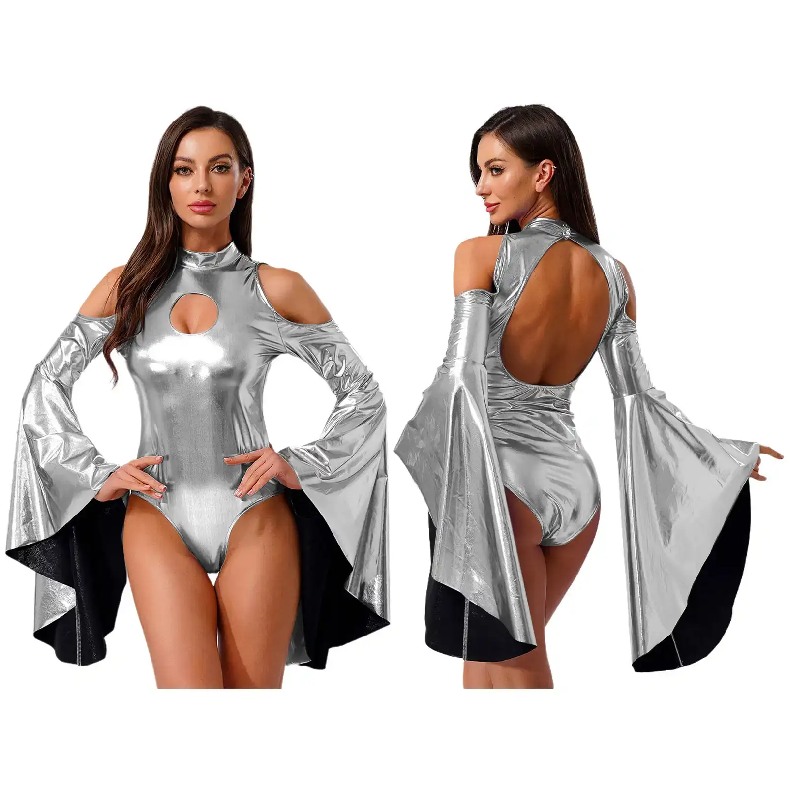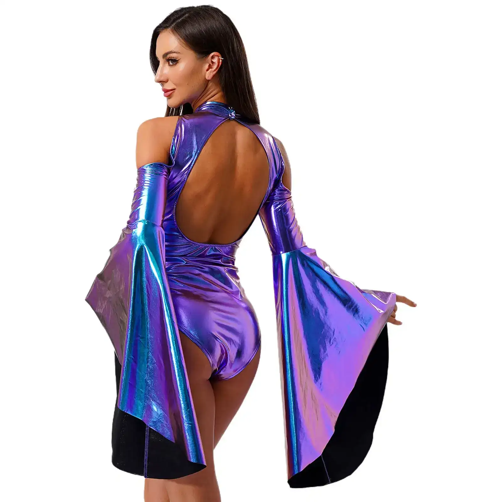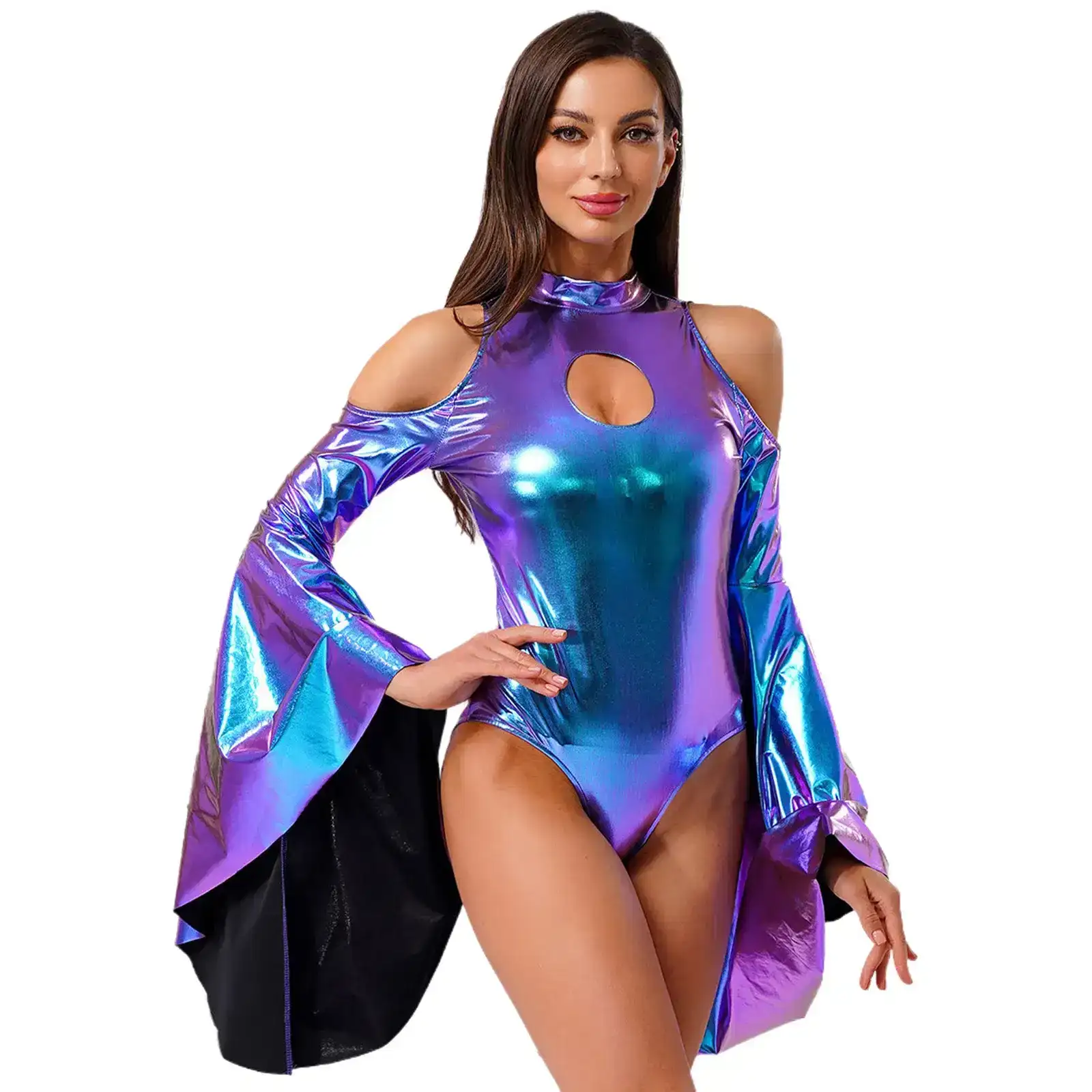 Liquid-metal shiny bodysuit with dramatic flared sleeves and ultra-high-cut legs. Perfect pole dance, rave, and disco clubwear for women who own the stage at psytrance parties, techno events, and late-night festivals. Stretchy, reflective, and built to move under every strobe and blacklight.