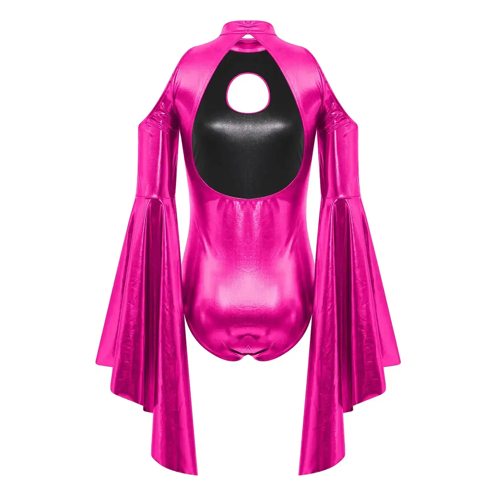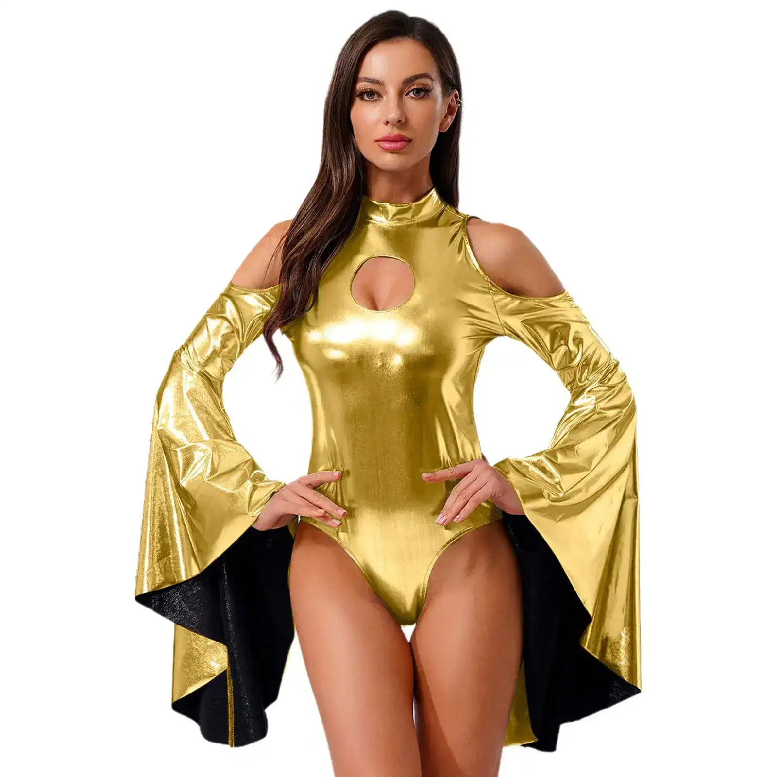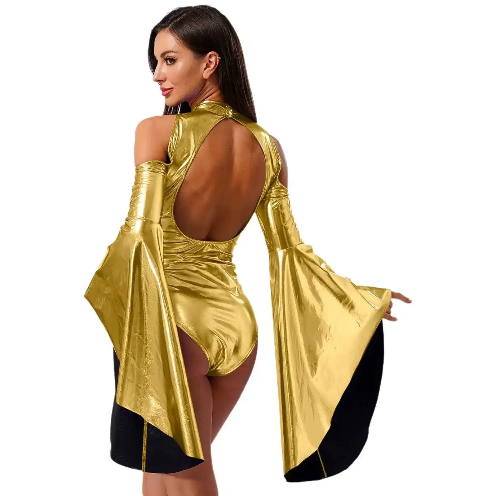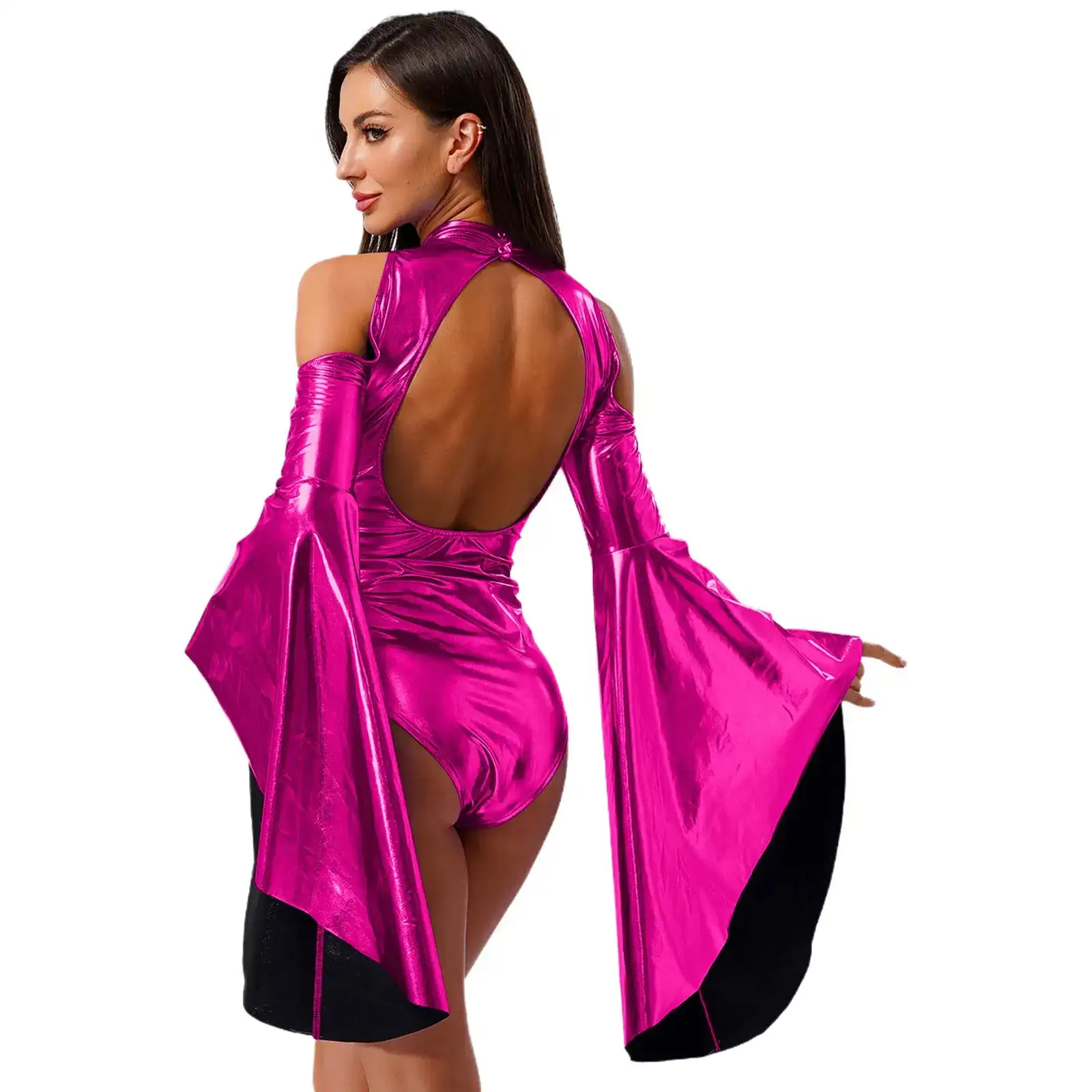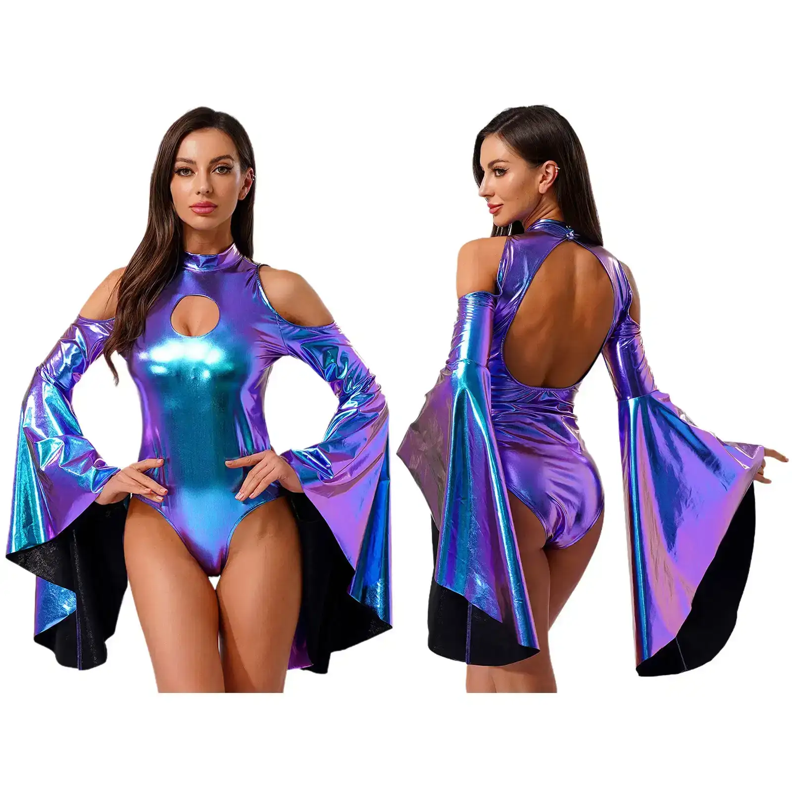 Liquid-metal shiny bodysuit with dramatic flared sleeves and ultra-high-cut legs. Perfect pole dance, rave, and disco clubwear for women who own the stage at psytrance parties, techno events, and late-night festivals. Stretchy, reflective, and built to move under every strobe and blacklight.