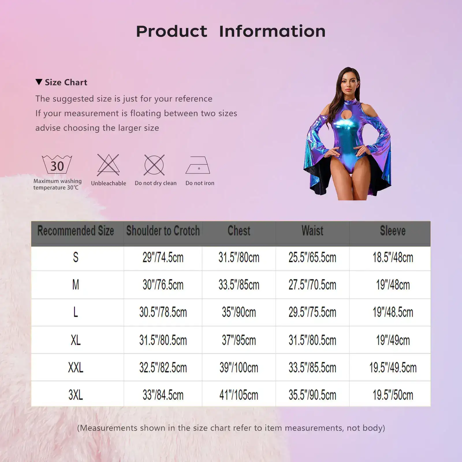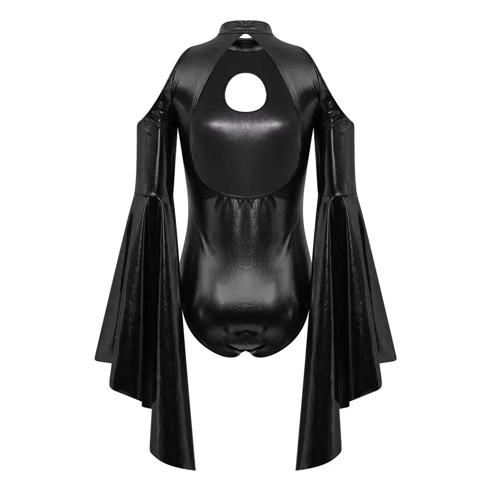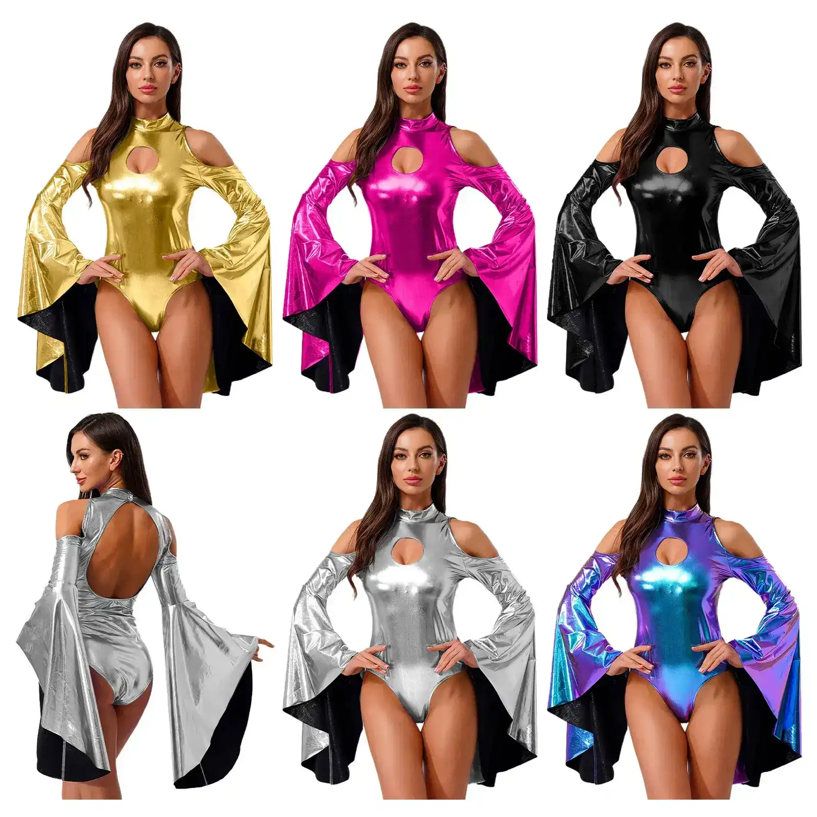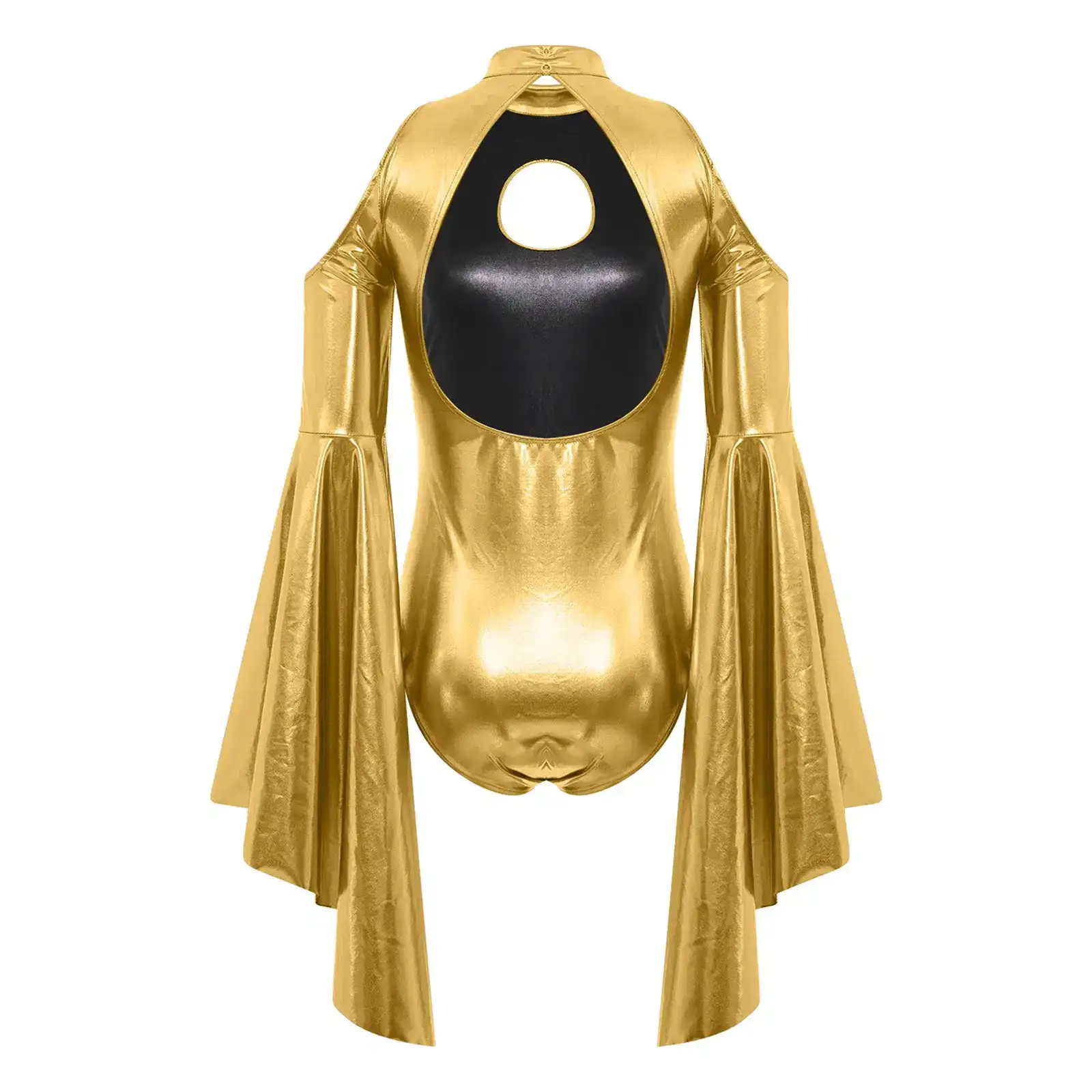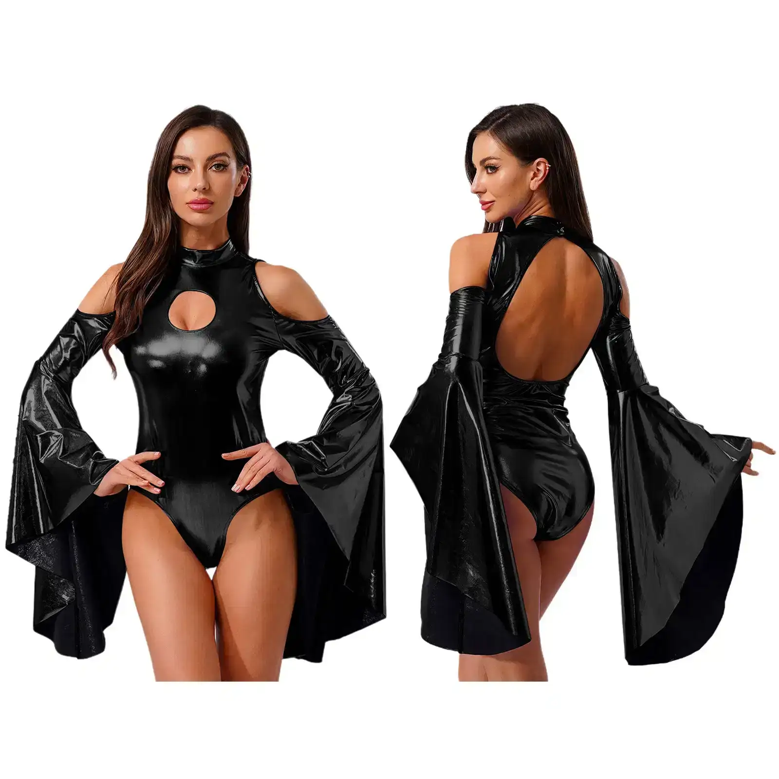 Liquid-metal shiny bodysuit with dramatic flared sleeves and ultra-high-cut legs. Perfect pole dance, rave, and disco clubwear for women who own the stage at psytrance parties, techno events, and late-night festivals. Stretchy, reflective, and built to move under every strobe and blacklight.