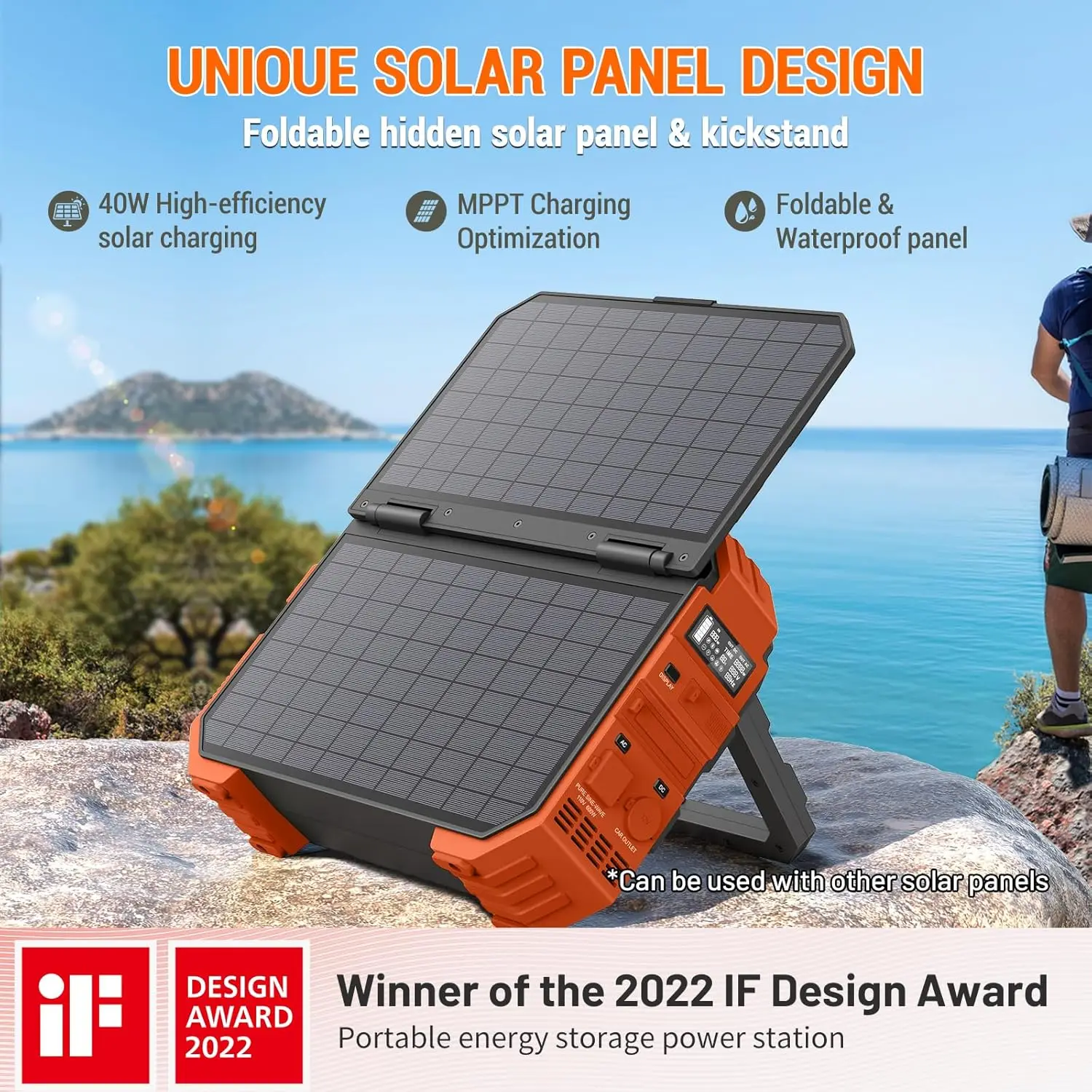 [Unique Built-in Solar Panel]With a unique appearance design, it won the 2022 German IF Design Innovation Award. The foldable solar panel with an efficient power conversion system(MPPT controller) designed to provide power resources in EMERGENCY situations. It can also connect with other solar panels to increase charging efficiency. The power station can power other devices while absorb solar energy, without having to worry about running out of battery power.