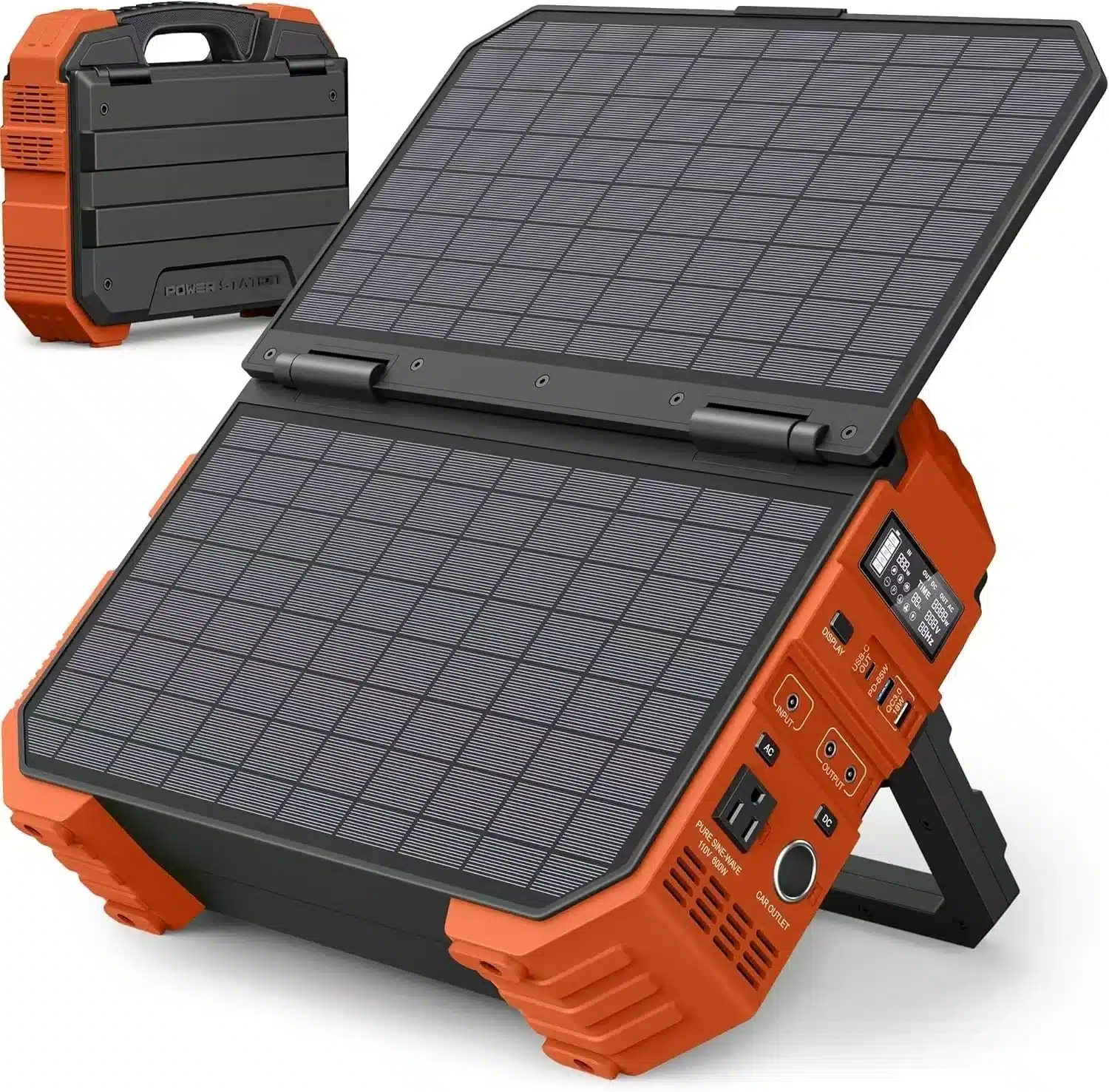 [Multiple Charging Options, Easy to Use]Charge your portable solar generator via AC adapter, car outlet, built-in 30W solar panel, or other solar panels (depending on sunlight strength). The LCD display shows remaining battery power, voltage, input/output power, fault indication, and more. Compact and easy to carry with a comfortable handle. The foldable stand of the camping power station is convenient for efficient solar charging.